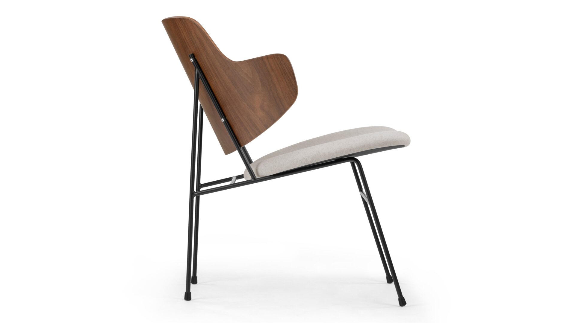 Introducing the Penguin Lounge Chair, a fusion of contemporary and mid-century styles crafted to deliver comfort and elegance. The gracefully curved walnut backrest offers aesthetic appeal and ergonomic support. With a plush, light-colored upholstered seat and sleek metal frame, this chair is a timeless focal point for modern interiors.