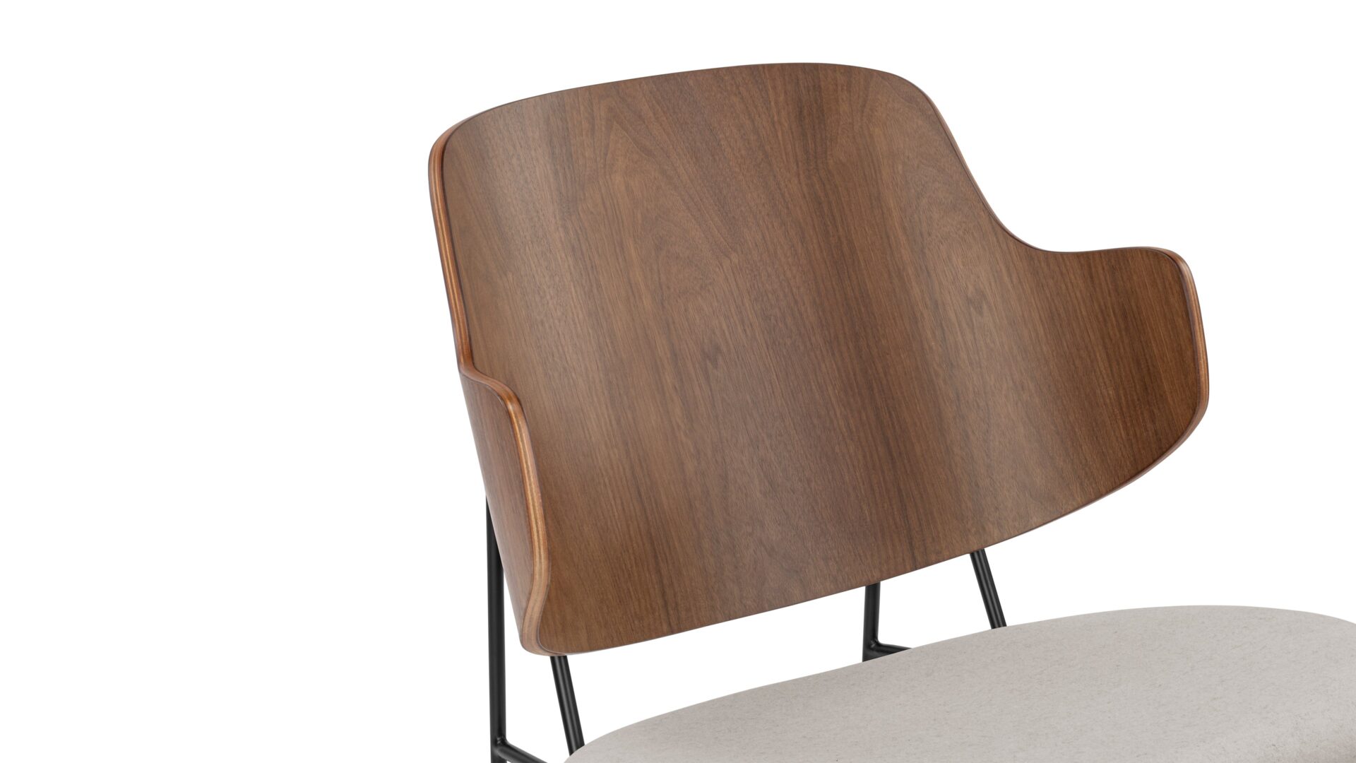 Introducing the Penguin Lounge Chair, an exquisitely crafted fusion of contemporary and mid-century styles, meticulously designed to deliver both comfort and elegance to any living space. The gracefully curved walnut wood backrest not only offers a sophisticated aesthetic appeal but also provides ergonomic back support. The plush, light-colored upholstered seat promotes relaxation, transforming this chair into a cozy retreat for unwinding. The gently curved armrests seamlessly flow from the backrest, contributing to a seamless, harmonious design that elevates both comfort and style.
