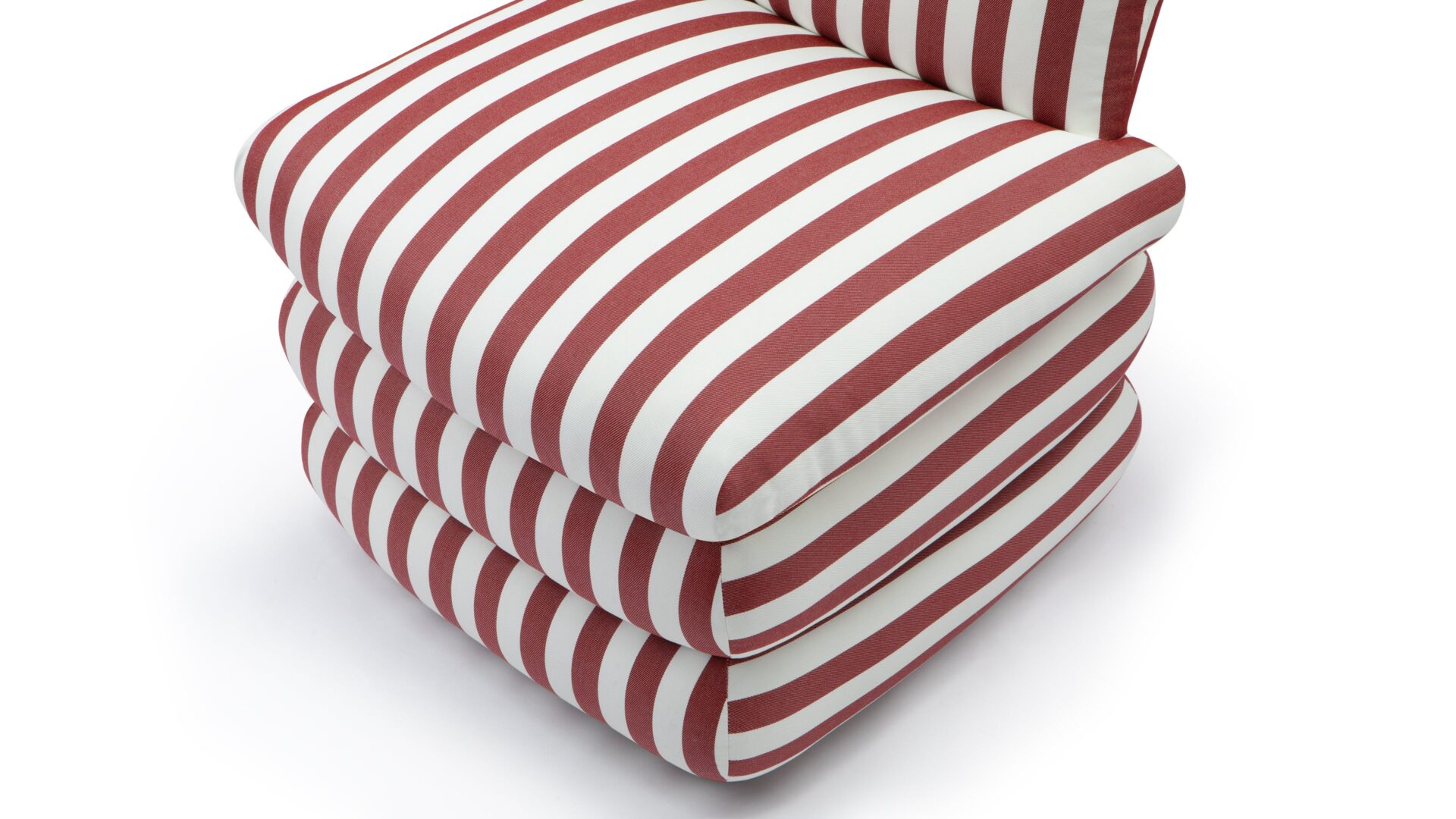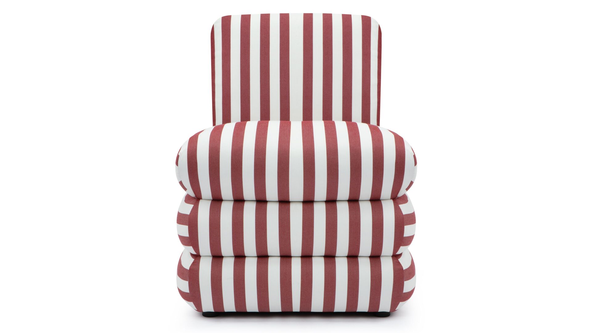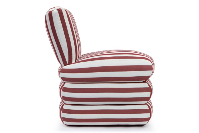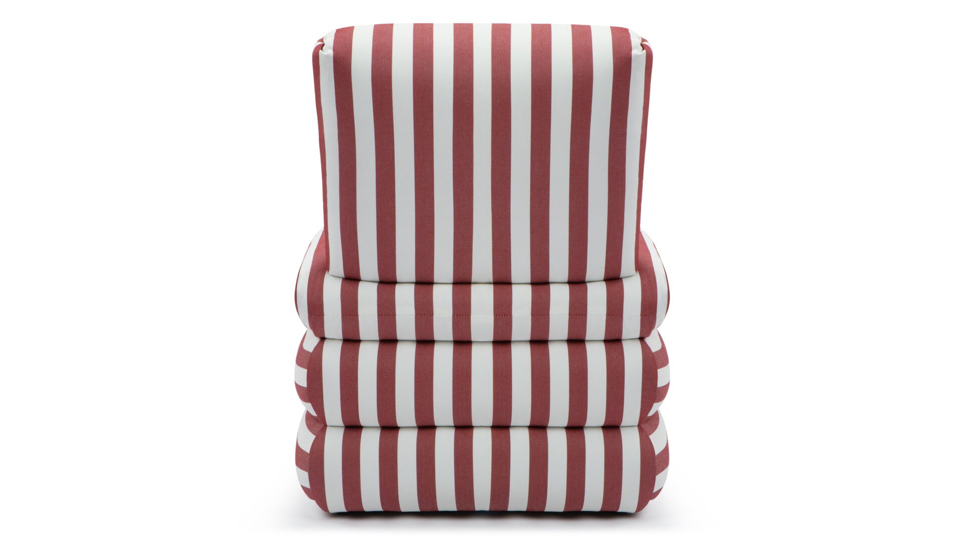 Experience the Pillow Chair, a lightweight outdoor-friendly seating option featuring a striking red-and-white striped design. This chair provides luxurious cushioned comfort for lounging on patios, balconies, and by the poolside.