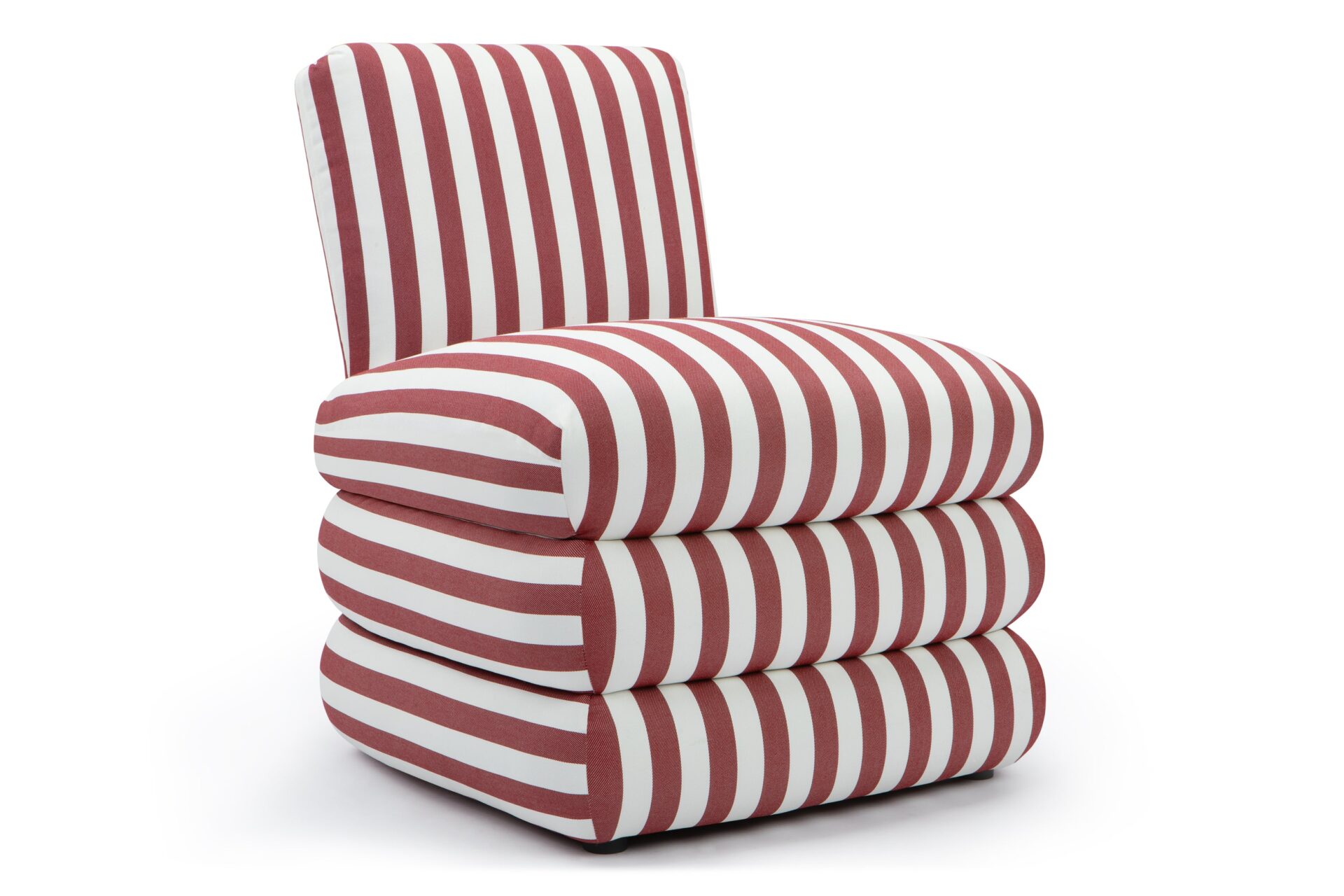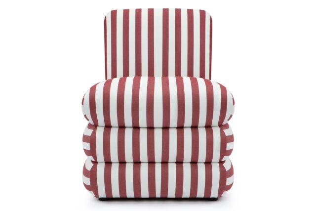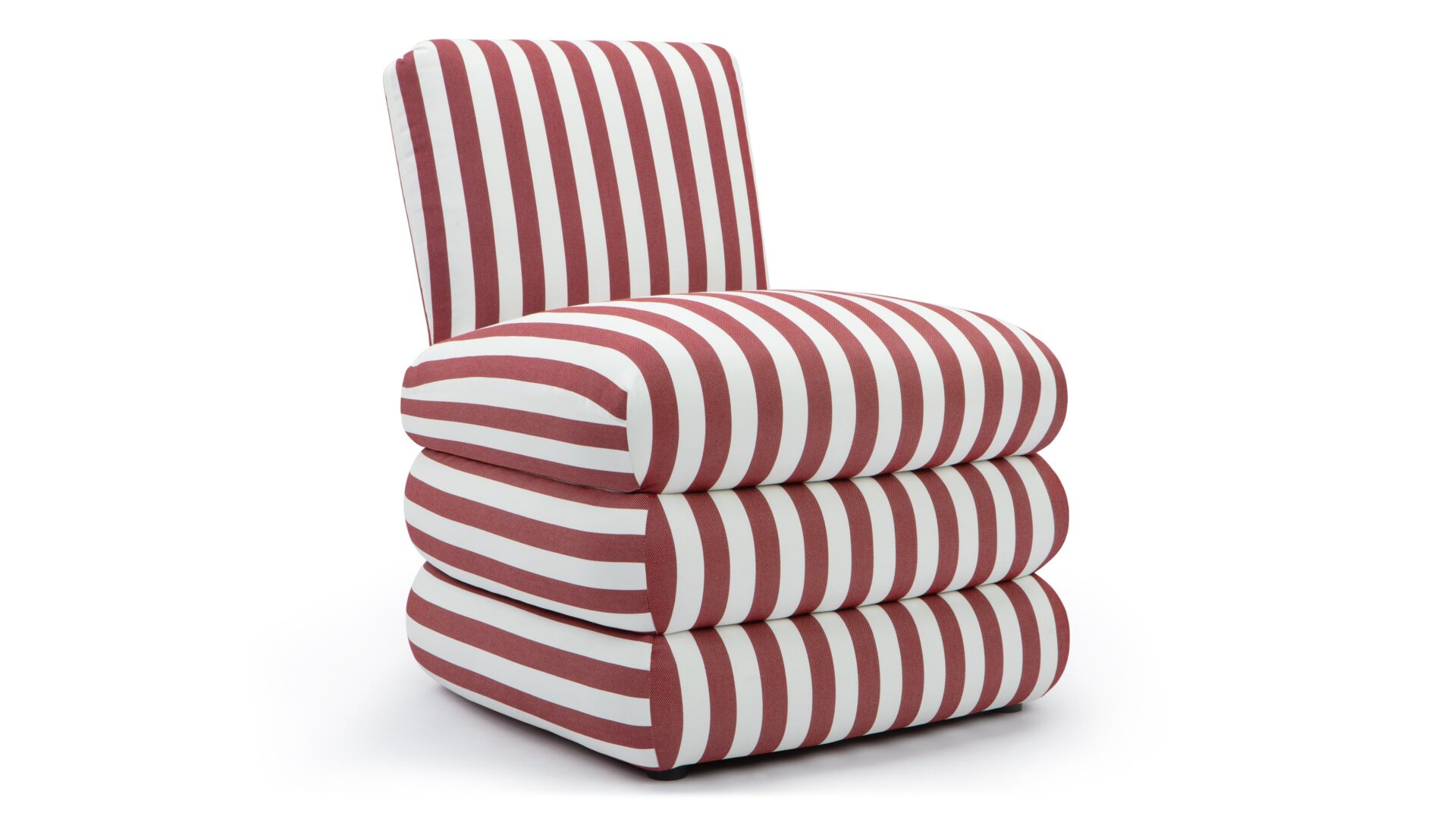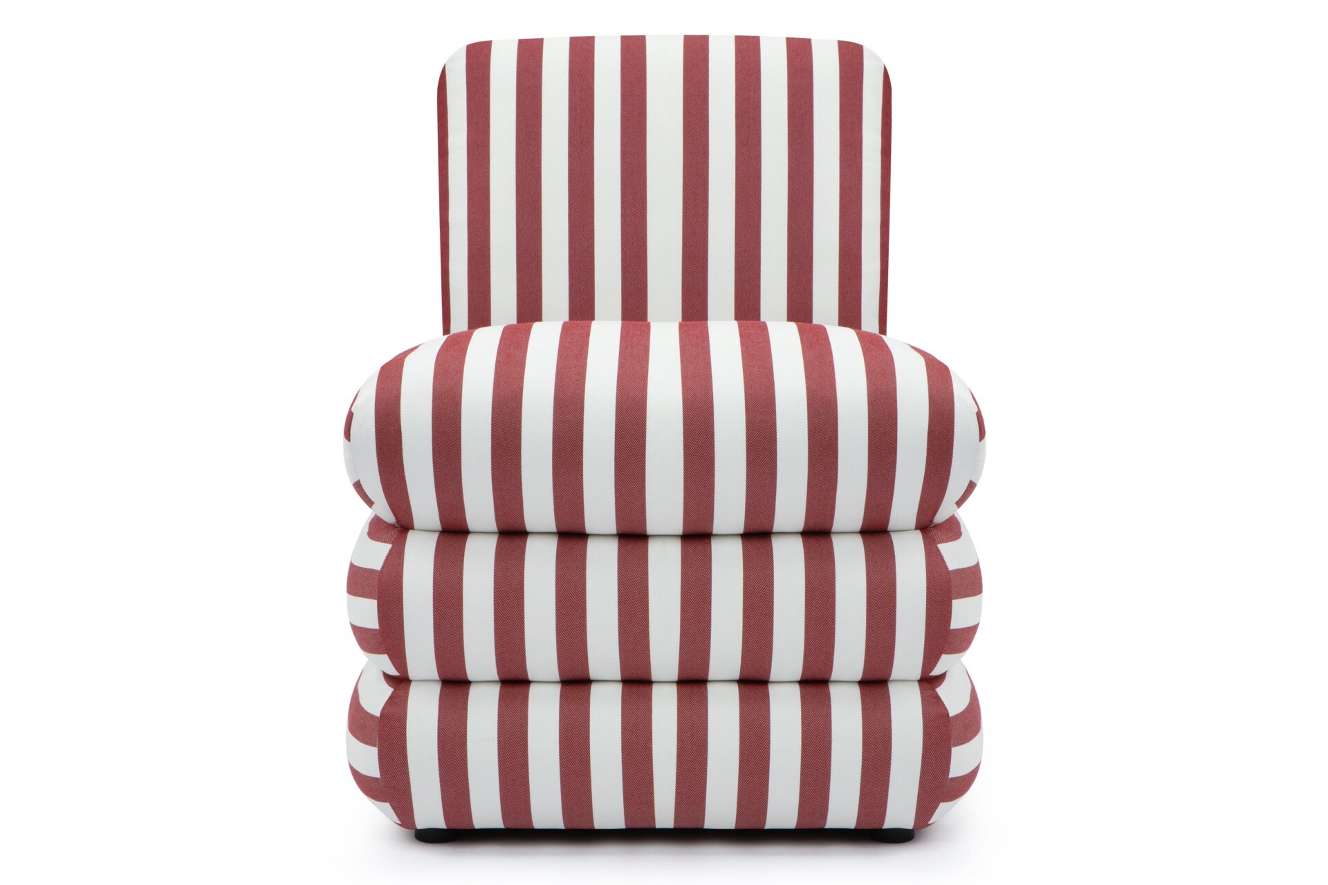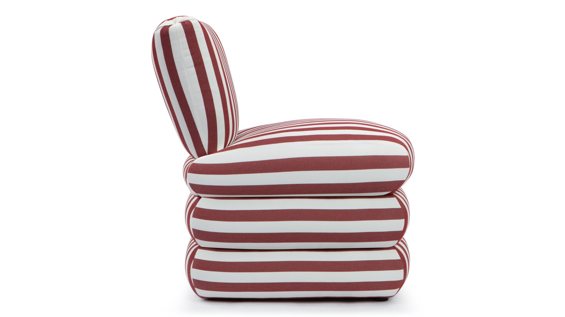 Experience the Pillow Chair, a lightweight outdoor-friendly seating option featuring a striking red-and-white striped design. This chair provides luxurious cushioned comfort for lounging on patios, balconies, and by the poolside.