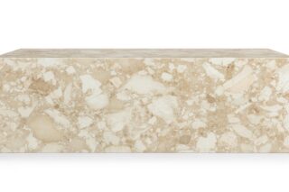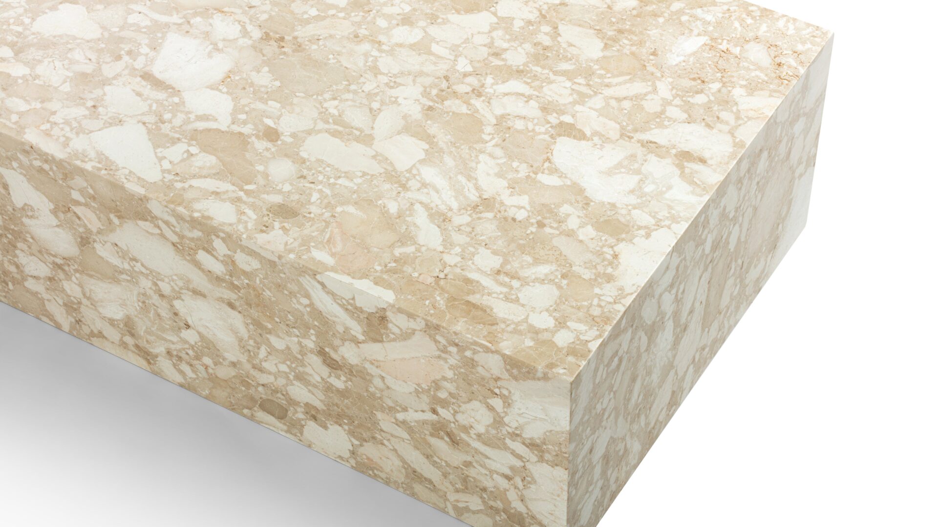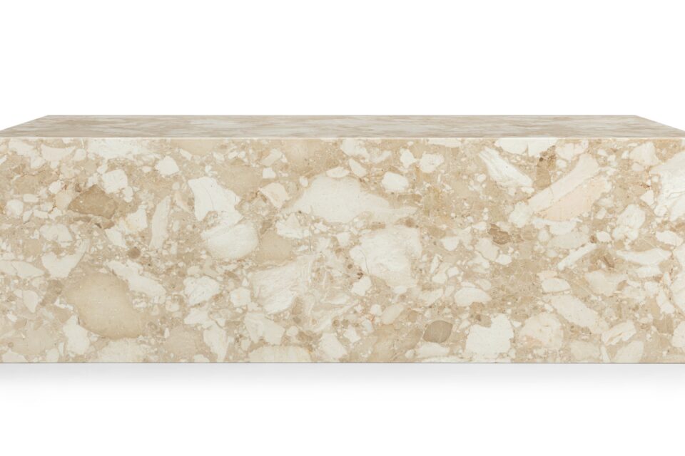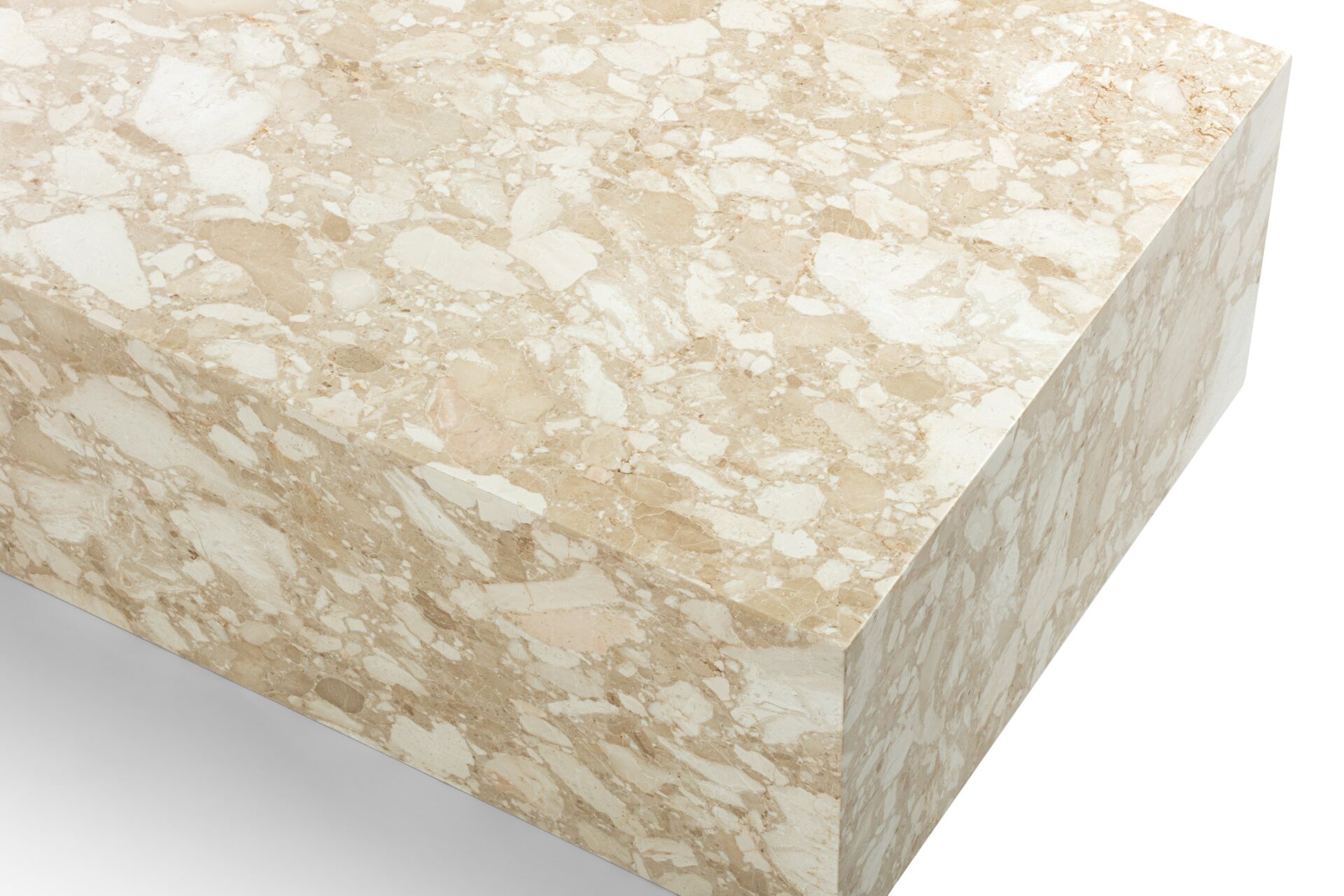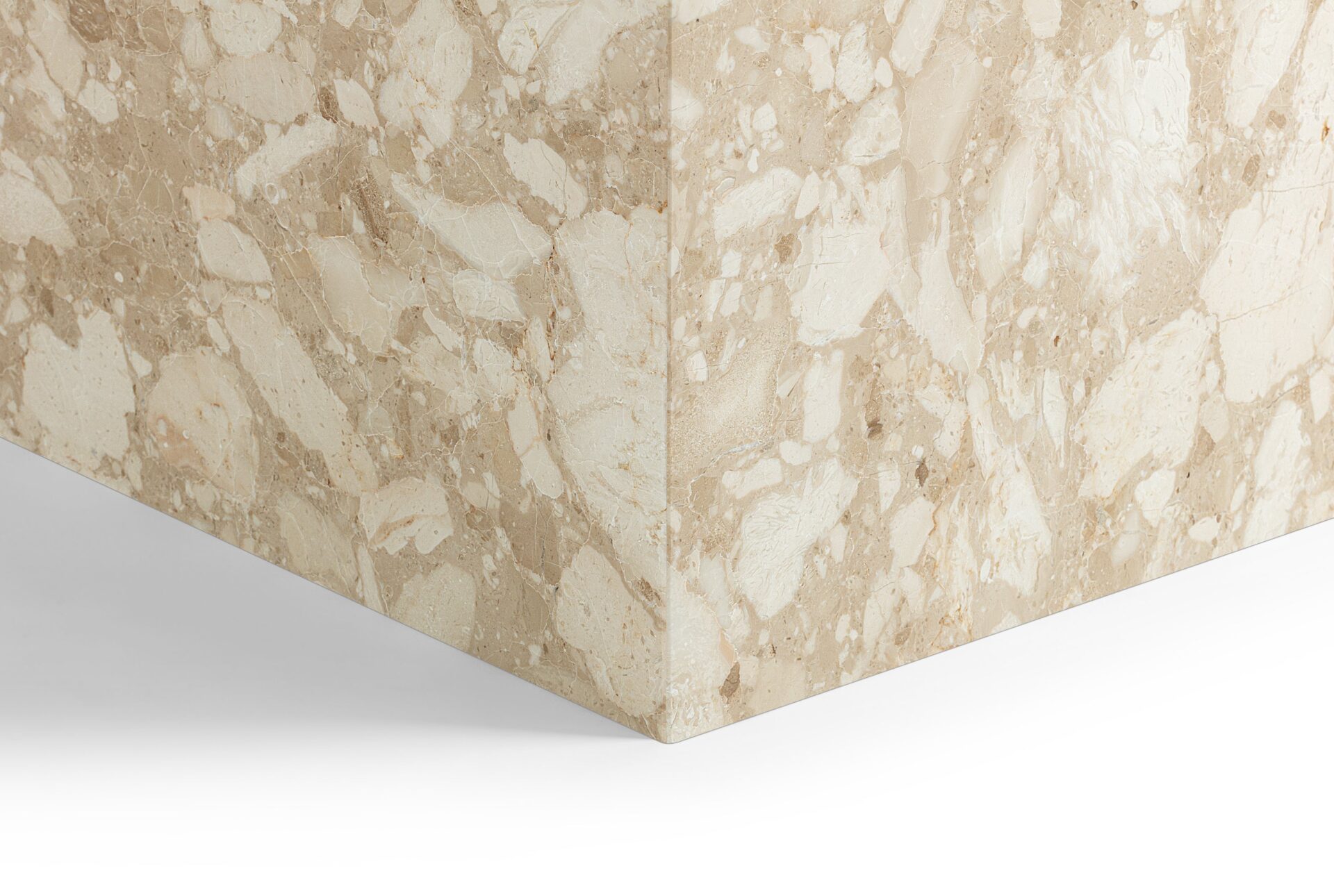 Crafted with a deliberately understated silhouette, the Plinth coffee table is crafted to enhance the inherent elegance of marble in its most natural state. Its minimalistic design allows the stone's distinctive qualities to shine through. Transforming the traditional plinth into a contemporary masterpiece, this Danish creation views the pedestal not just as a display surface, but as a work of art in itself. Meticulously constructed with luxurious Kunis Breccia marble, each Plinth table exudes individuality, showcasing subtle neutral veining, delightful color variations, and charming unique features.