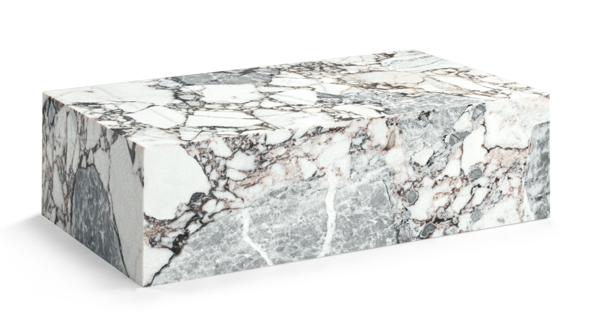 Crafted with a deliberately modest silhouette, the Plinth coffee table is crafted to showcase the inherent beauty of marble in its purest form. Its simple, unassuming profile puts the stone's character at the forefront. Transforming the traditional plinth concept, this modern Danish design presents the pedestal not only as a display piece but as a work of art in itself. Constructed from exquisite Italian modellato marble, each Plinth table is a one-of-a-kind piece, displaying subtle gray and neutral veining, delightful variations in color, and unique distinctive features.