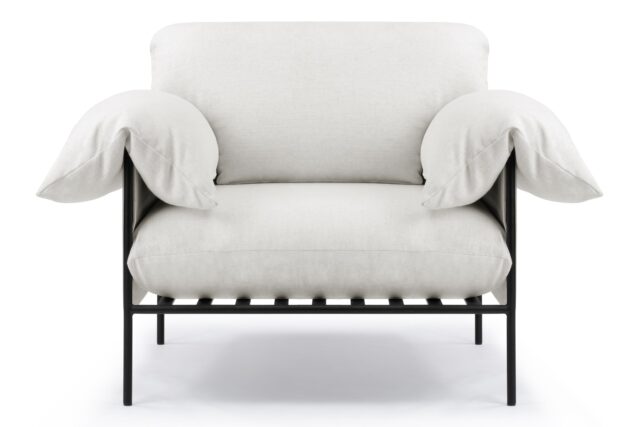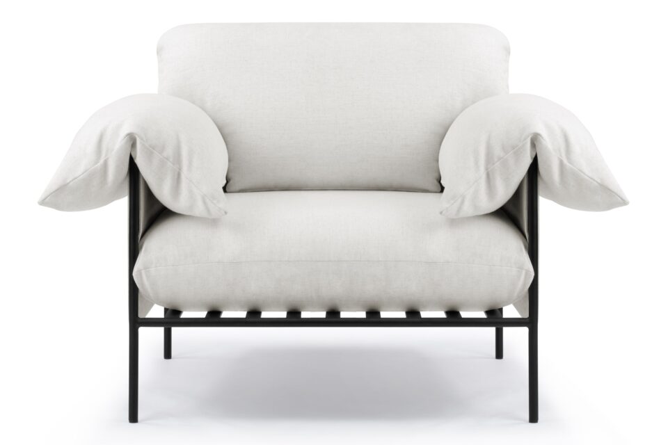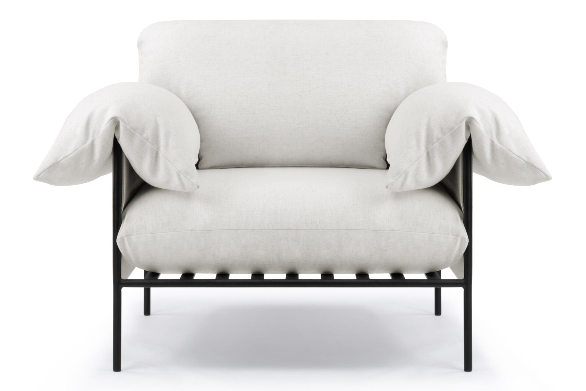 Experience cloud-like seating with the Positano Lounge Chair. This chair features a black powder-coated metal frame that provides durable support for plush foam cushions and pillow-like armrests. Its suspended seat design and neutral off-white upholstery make it a versatile piece for both modern and cozy interiors.