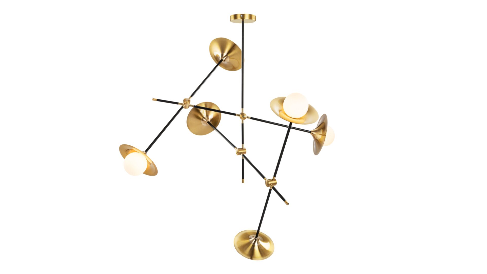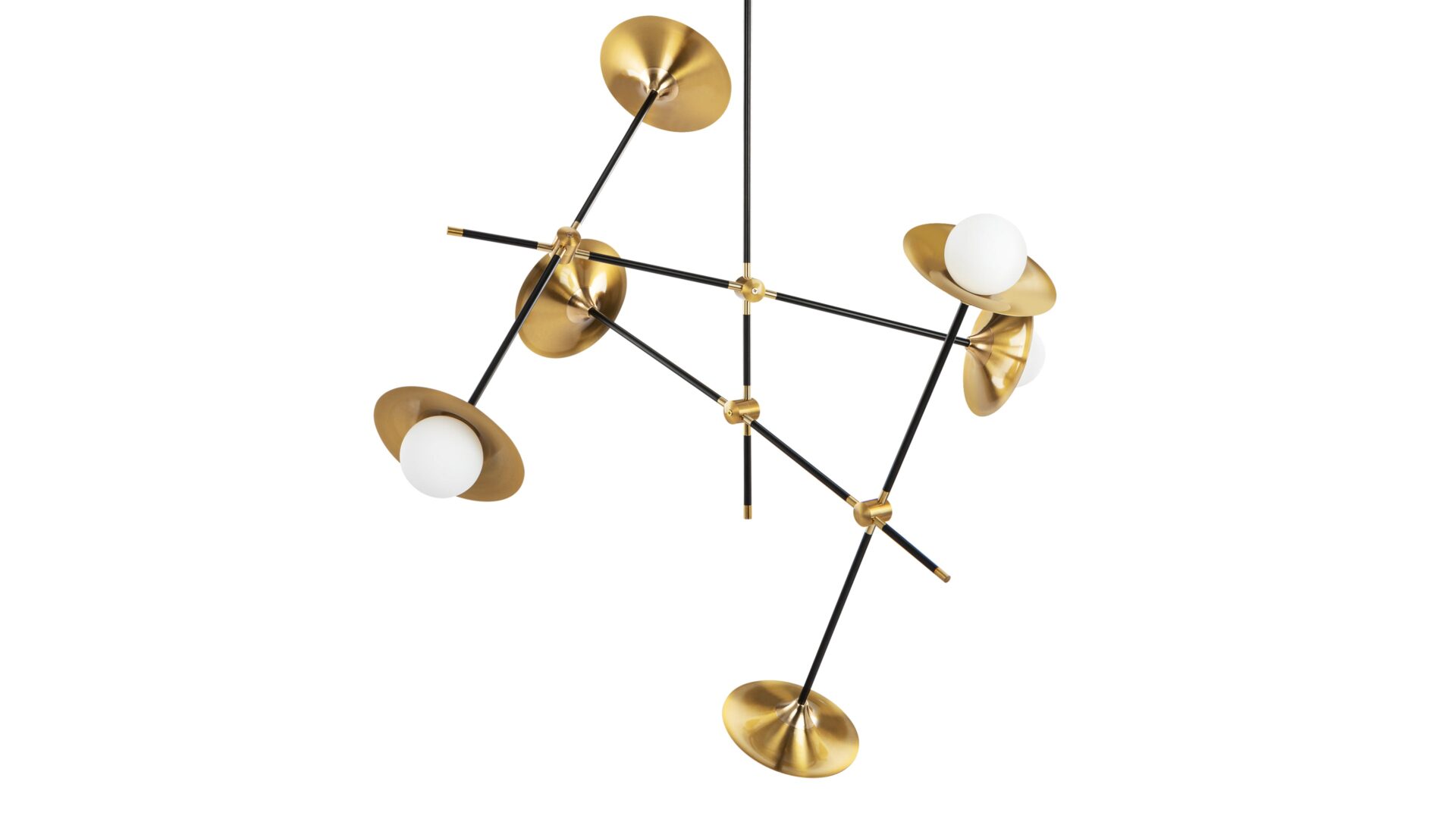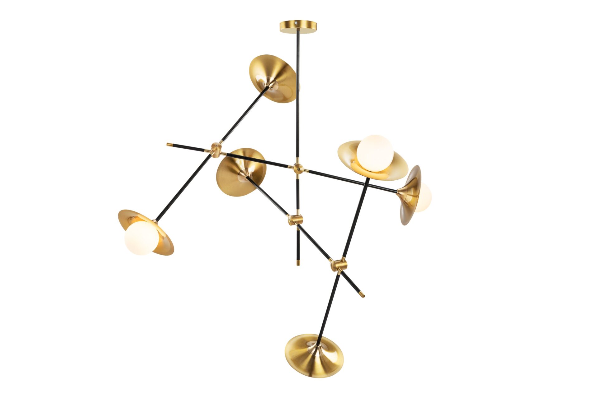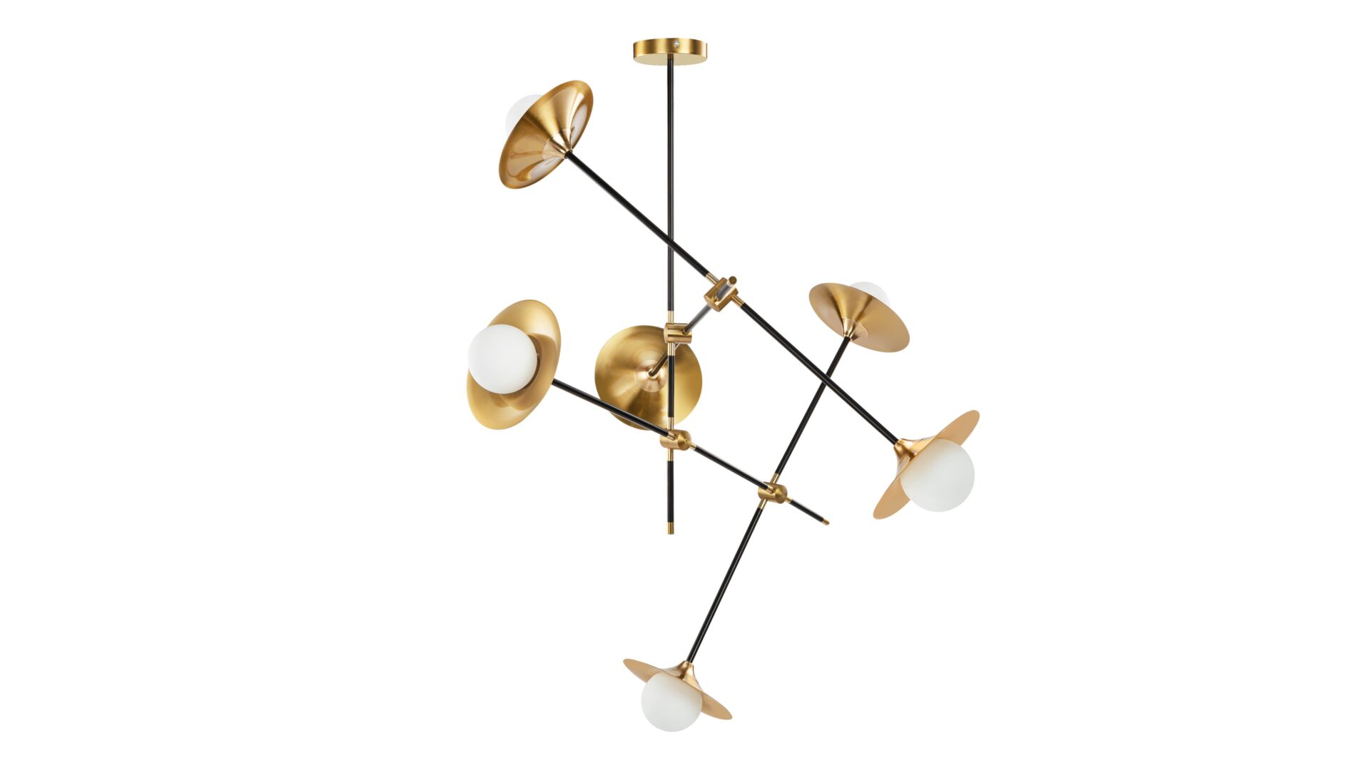 Experience modern elegance with the Prater Chandelier, showcasing a stylish metal construction with a unique and contemporary flair. Its adjustable poles offer flexibility to direct light, while the black finish creates a striking contrast with the bright brass finish on the shades, pivot points, and ceiling mount. The standout trumpet-like shades enhance the chandelier's distinctive and captivating look. Perfect for modern interiors, this statement lighting piece seamlessly combines functionality with a memorable visual appeal.
