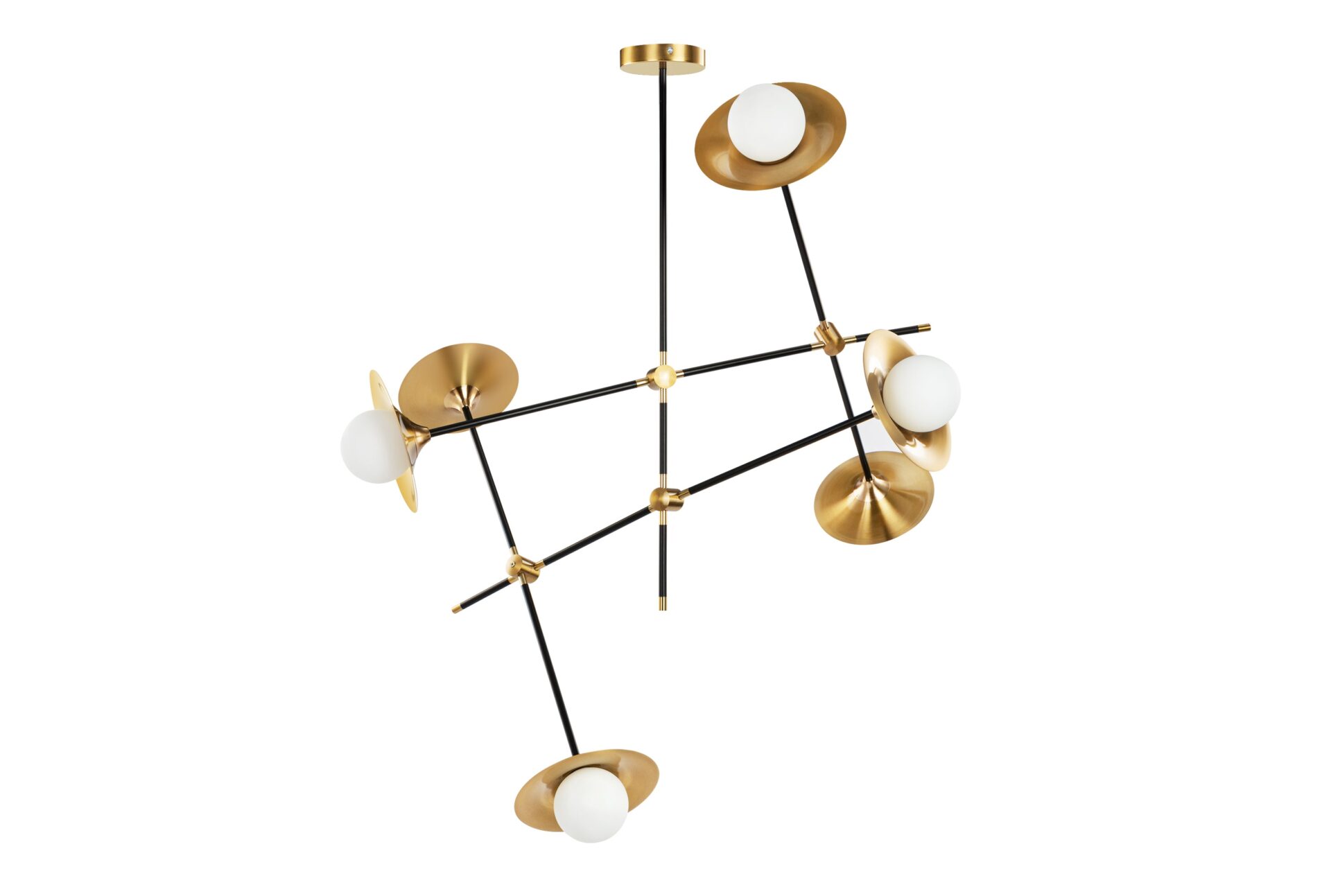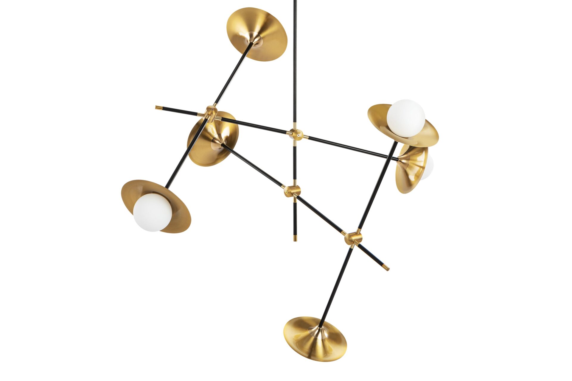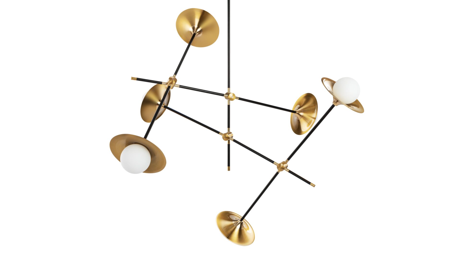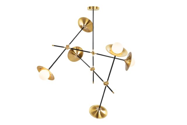 Experience modern elegance with the Prater Chandelier, showcasing a stylish metal construction with a unique and contemporary flair. Its adjustable poles offer flexibility to direct light, while the black finish creates a striking contrast with the bright brass finish on the shades, pivot points, and ceiling mount. The standout trumpet-like shades enhance the chandelier's distinctive and captivating look. Perfect for modern interiors, this statement lighting piece seamlessly combines functionality with a memorable visual appeal.