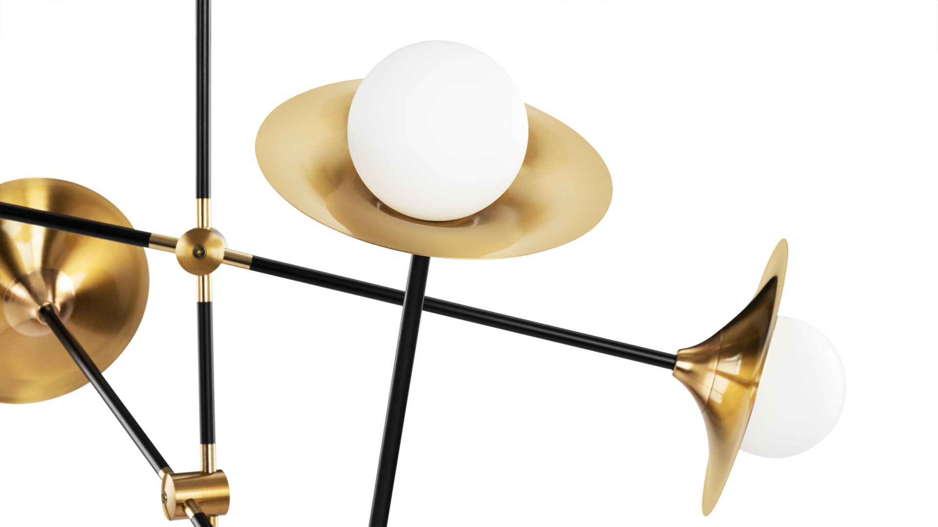 Crafted from sturdy iron, this exquisite chandelier showcases a brass finish on the shades and pivot points, elegantly contrasted by sleek black poles and a striking brass-colored ceiling mount. The use of premium materials guarantees both durability and a touch of opulence.