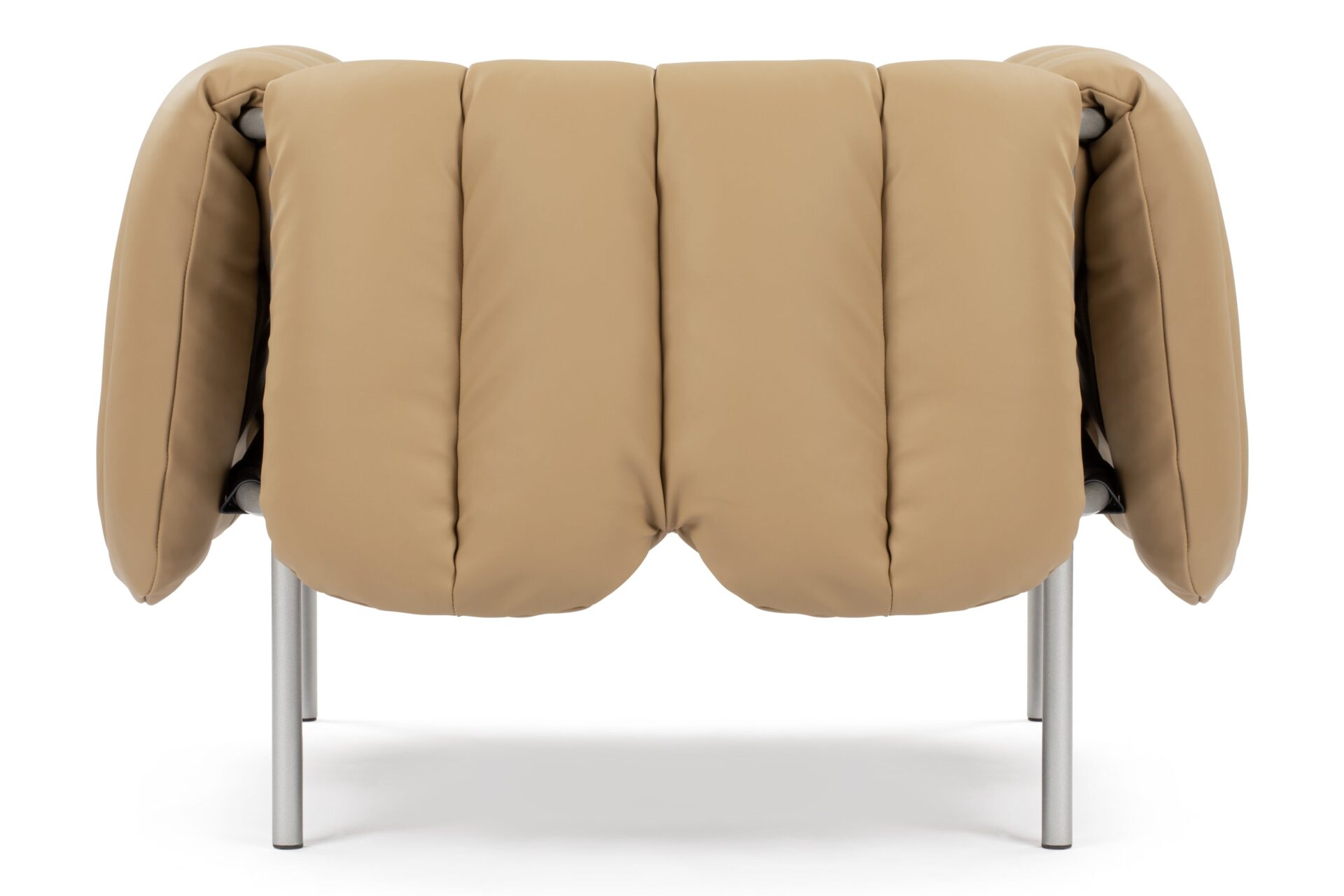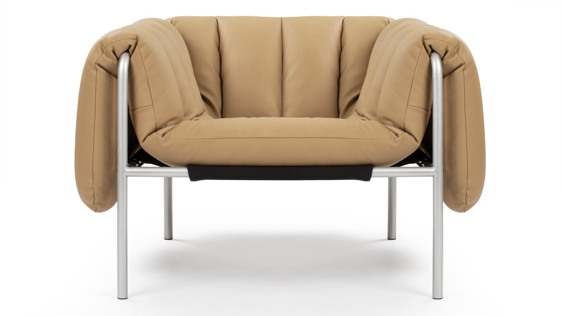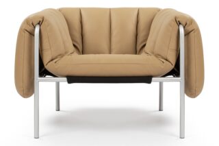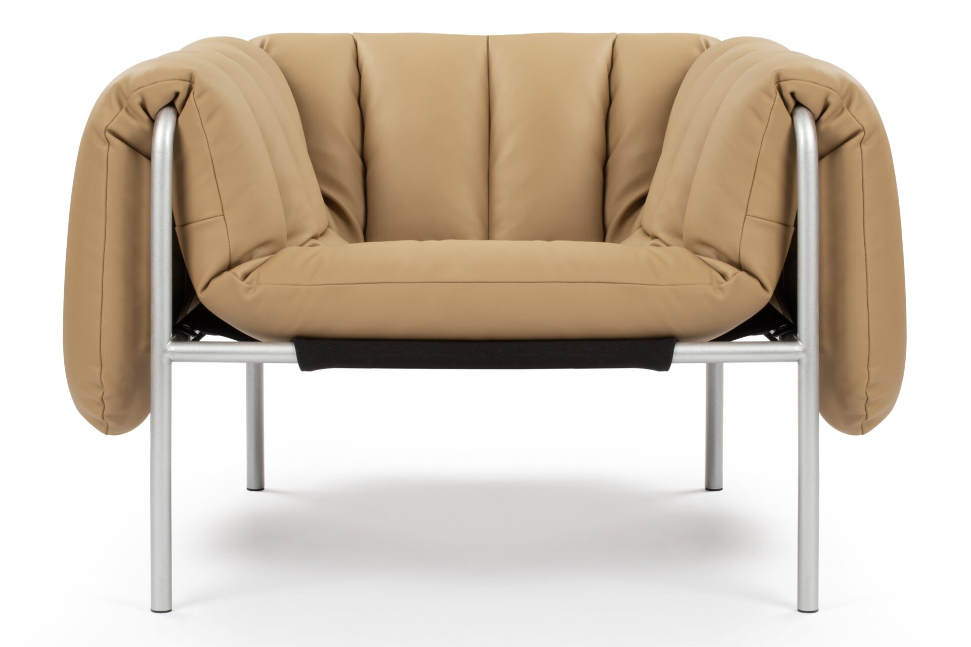 Experience ultimate comfort with the Puffy Lounge Chair, showcasing quilted cushioning in luxurious tan leather. The chair's soft, warm brown hue and inviting texture make it a perfect addition to any living space. The detachable upholstery allows for easy maintenance, ensuring your chair remains in pristine condition for years to come.