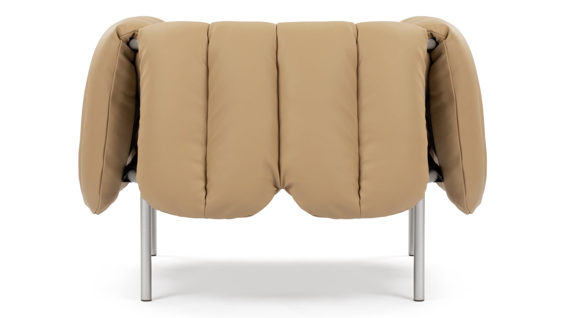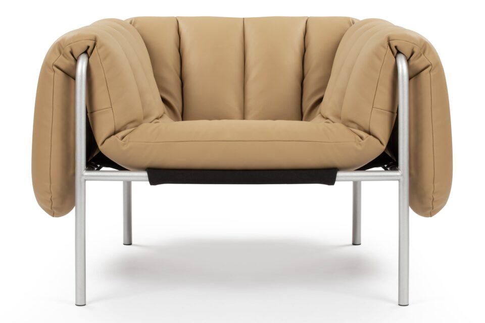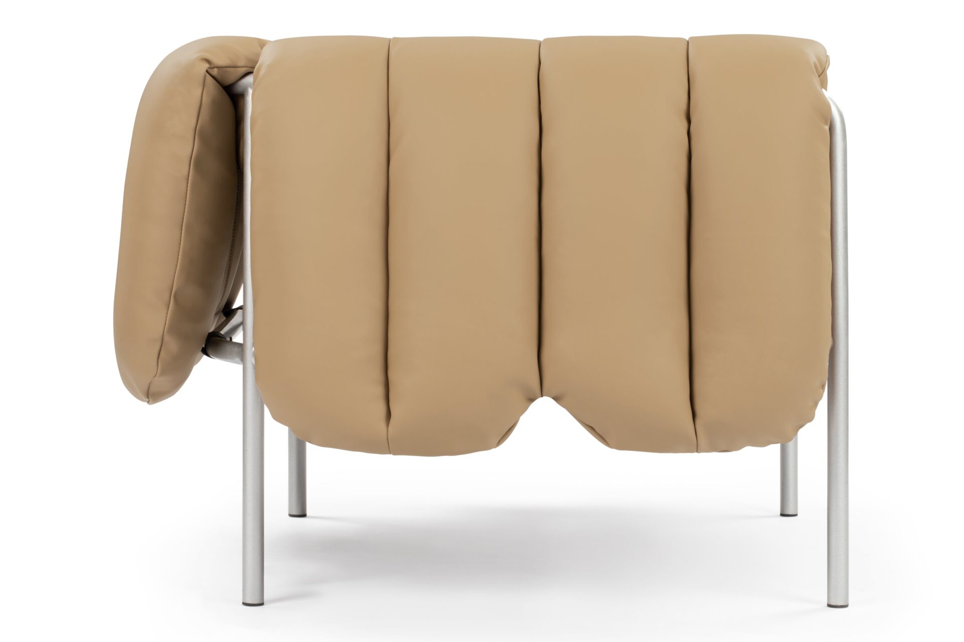 Experience ultimate comfort with the Puffy Lounge Chair, showcasing quilted cushioning in luxurious tan leather. The chair's soft, warm brown hue and inviting texture make it a perfect addition to any living space. The detachable upholstery allows for easy maintenance, ensuring your chair remains in pristine condition for years to come.
