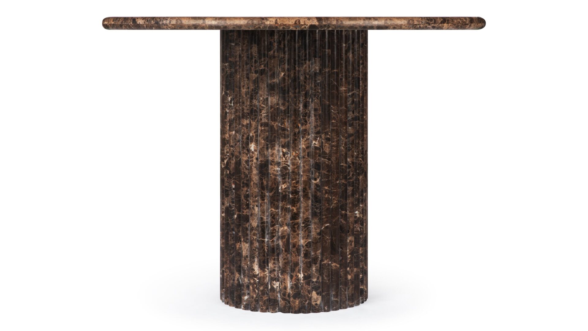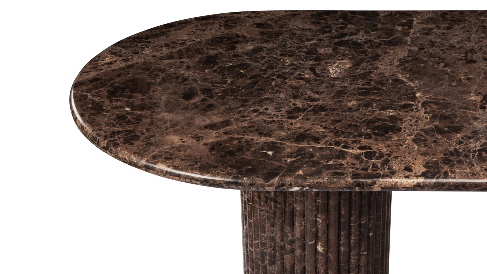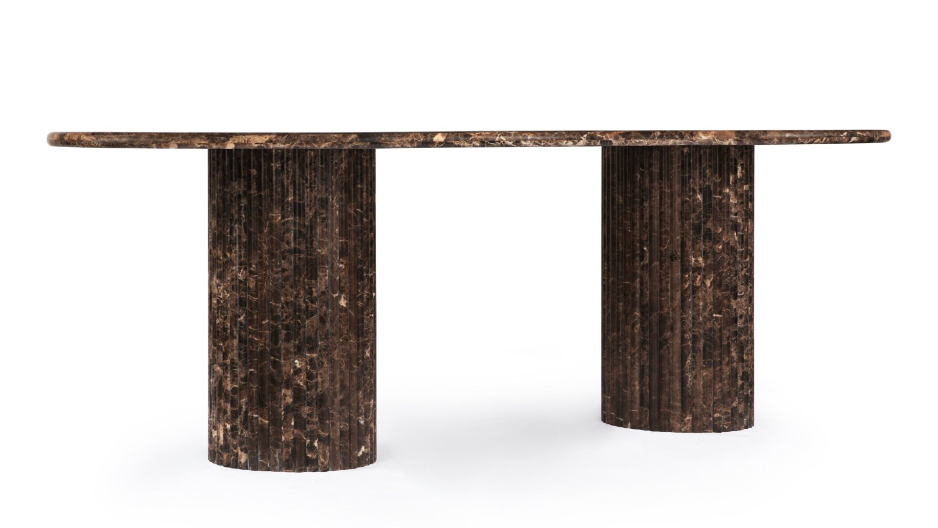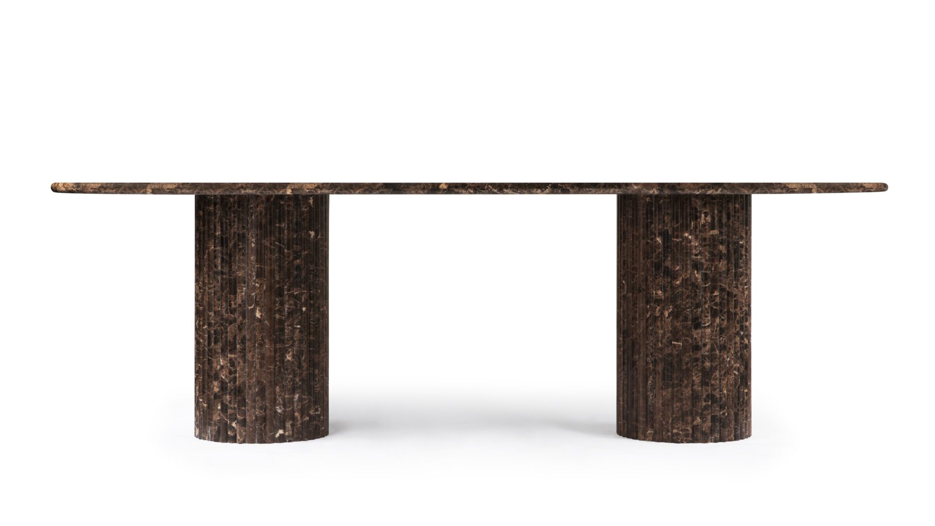 Elegantly alluding to the magnificence of classical architecture, the Saturn travertine dining table offers a modern interpretation of traditional design. Its sleek, polished marble top is juxtaposed with the textured reeded pillar bases, resulting in a minimalist yet visually captivating design. Dark Emperador marble, renowned for its warm tones and aesthetics, is a stunning natural Italian stone with a rich history in luxury design. The refined tabletop not only enhances the decor but also provides a practical surface for dining, working, and socializing. Please note that due to its natural composition, each marble table will exhibit slight variations in appearance, showcasing the stone's inherent characteristics such as color diversity, natural veining, and pores.