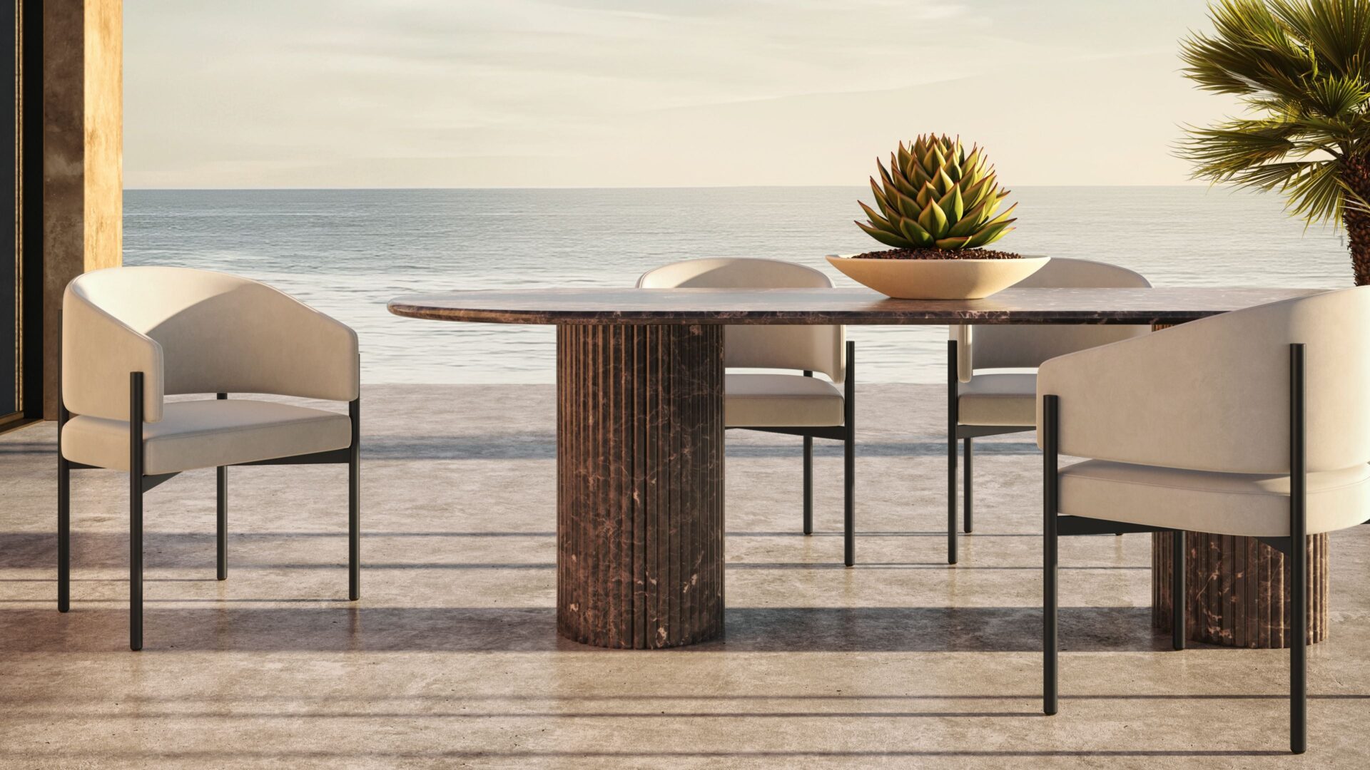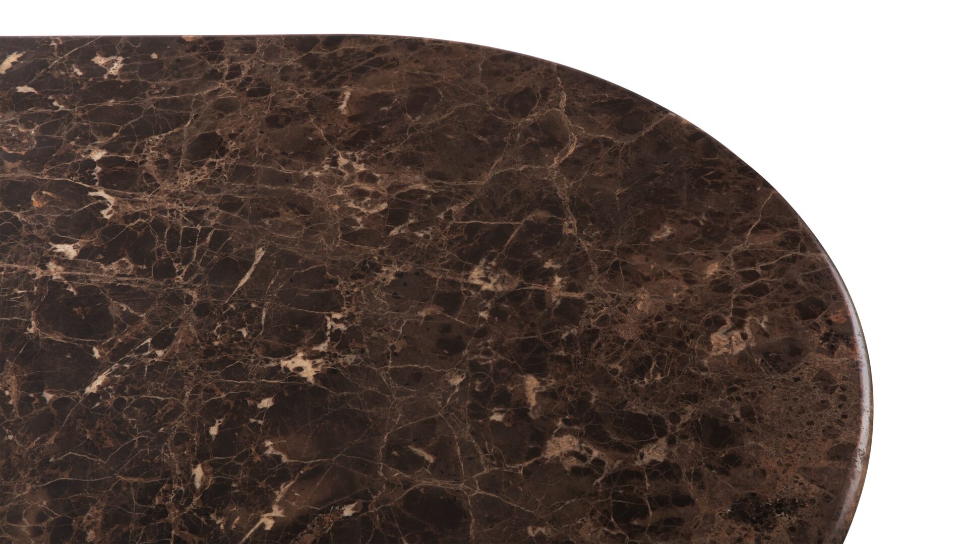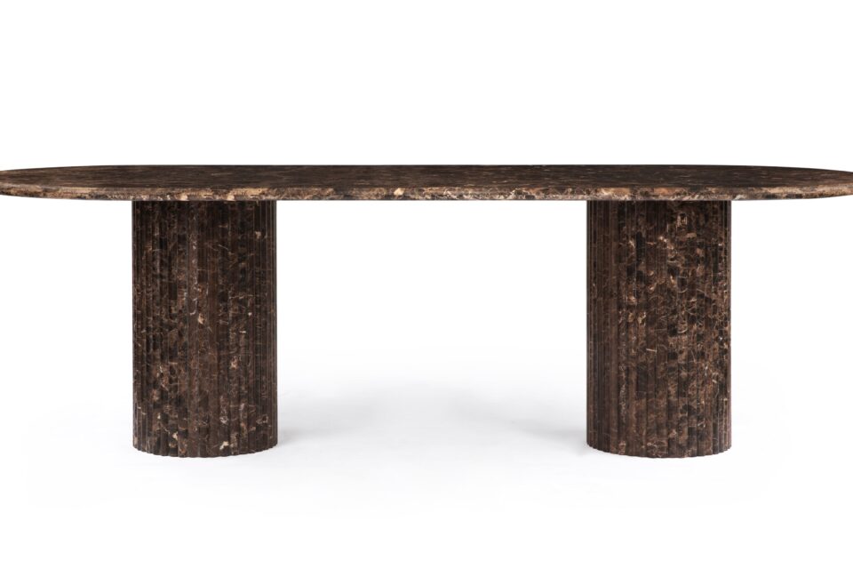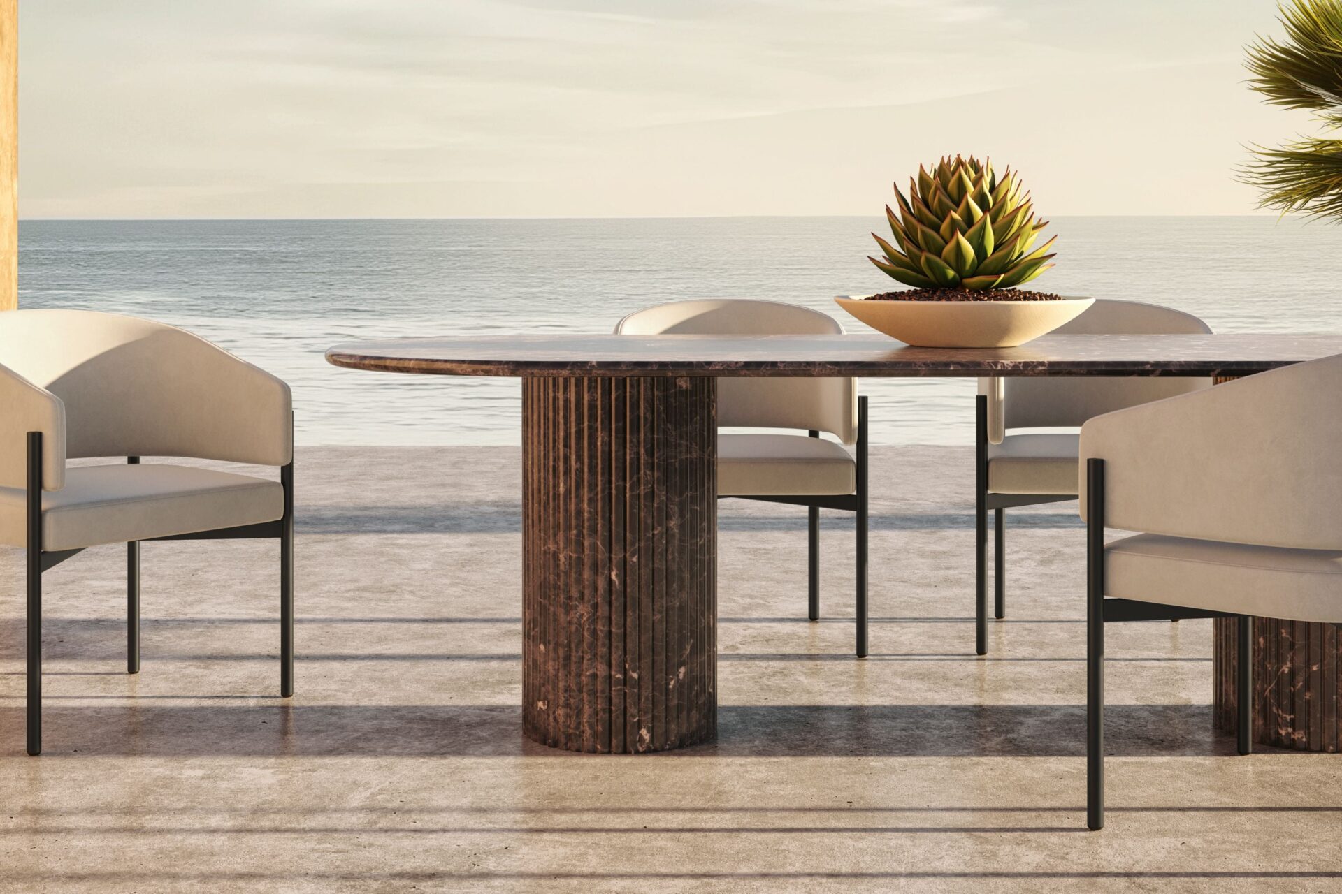 Elegantly alluding to the magnificence of classical architecture, the Saturn travertine dining table offers a modern interpretation of traditional design. Its sleek, polished marble top is juxtaposed with the textured reeded pillar bases, resulting in a minimalist yet visually captivating design. Dark Emperador marble, renowned for its warm tones and aesthetics, is a stunning natural Italian stone with a rich history in luxury design. The refined tabletop not only enhances the decor but also provides a practical surface for dining, working, and socializing. Please note that due to its natural composition, each marble table will exhibit slight variations in appearance, showcasing the stone's inherent characteristics such as color diversity, natural veining, and pores.