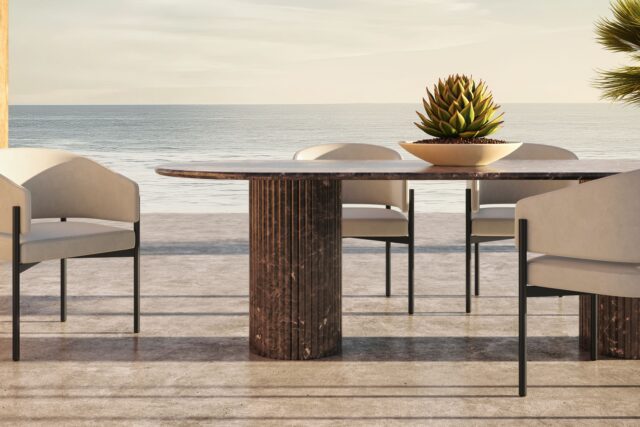 Experience the sophisticated charm of the Saturn travertine dining table, a modern take on classical architecture. Featuring a sleek marble top contrasted by textured reeded bases, this design is minimalistic yet visually captivating. Crafted from the luscious Italian Dark Emperador marble, known for its warm tones and beauty, each table showcases unique color variations and natural veining. A refined centerpiece for dining and entertaining, this exquisite table blends traditional elegance with contemporary style.