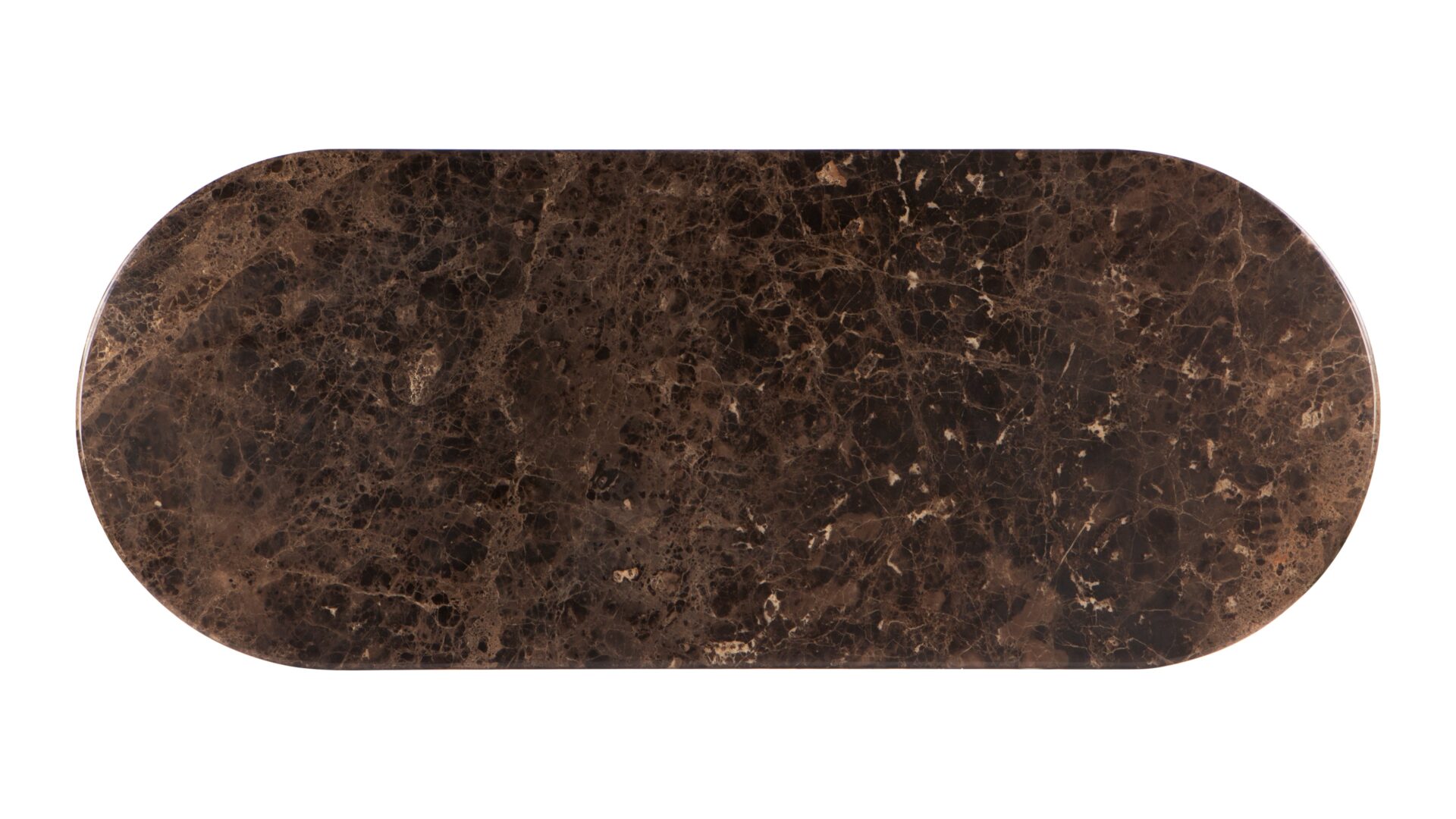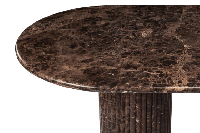 Crafted from polished Italian Dark Emperador marble, this exquisite modern table serves as a striking centerpiece. Boasting a moon-like oval top and a reeded pedestal base, this piece is a perfect fit for sophisticated, contemporary residences.