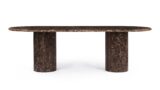 Elegantly alluding to the magnificence of classical architecture, the Saturn travertine dining table offers a modern interpretation of traditional design. Its sleek, polished marble top is juxtaposed with the textured reeded pillar bases, resulting in a minimalist yet visually captivating design. Dark Emperador marble, renowned for its warm tones and aesthetics, is a stunning natural Italian stone with a rich history in luxury design. The refined tabletop not only enhances the decor but also provides a practical surface for dining, working, and socializing. Please note that due to its natural composition, each marble table will exhibit slight variations in appearance, showcasing the stone's inherent characteristics such as color diversity, natural veining, and pores.