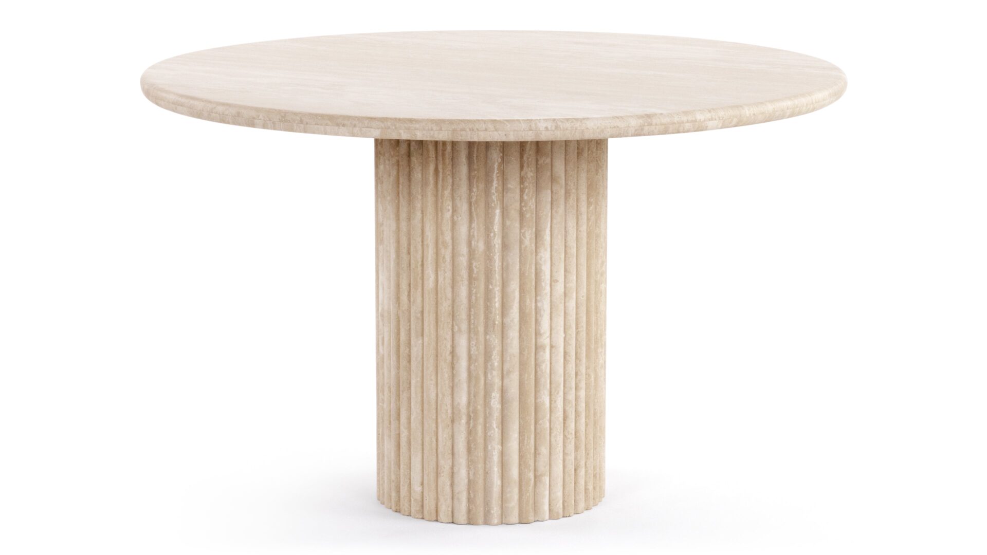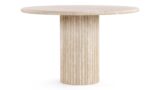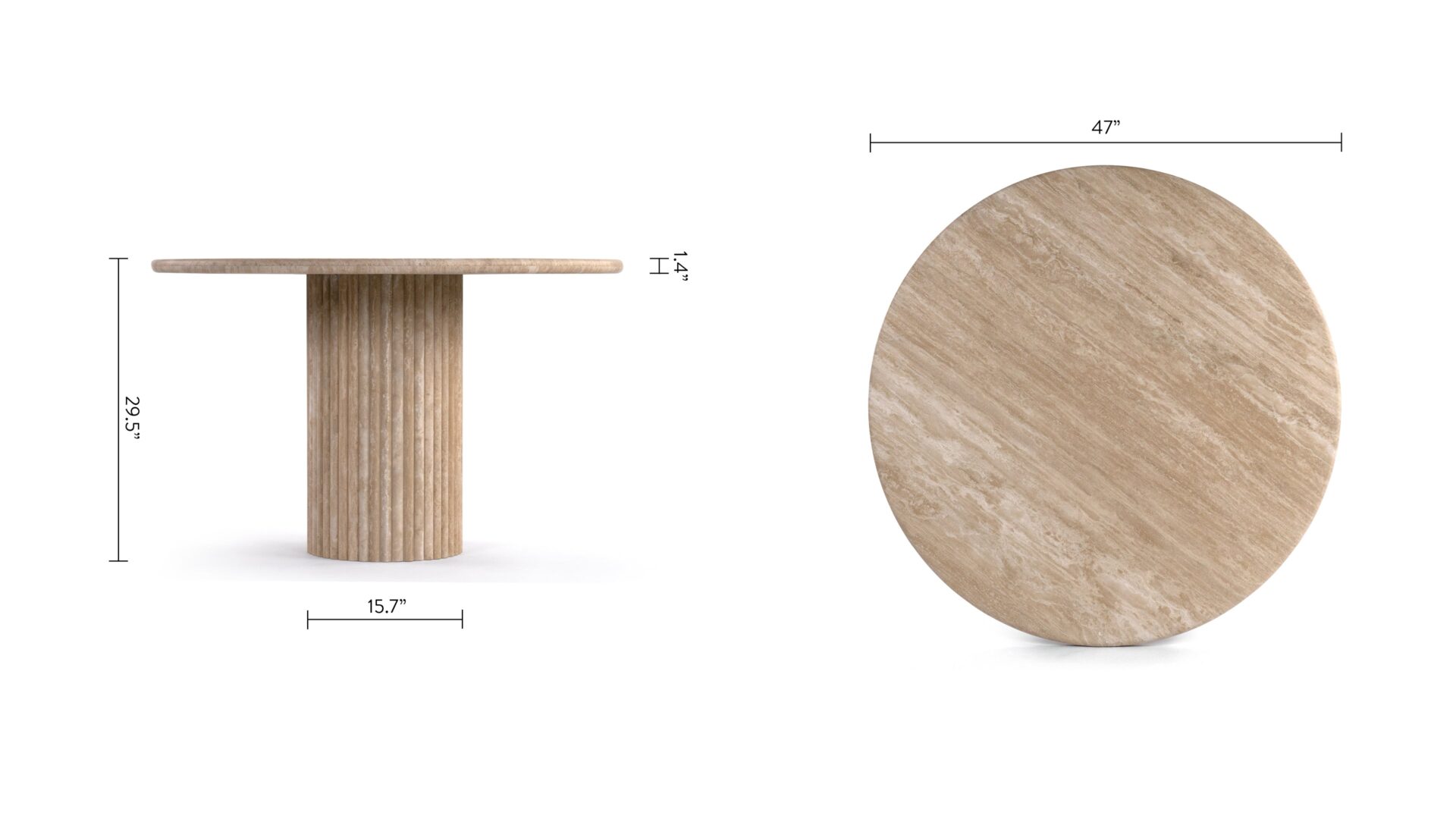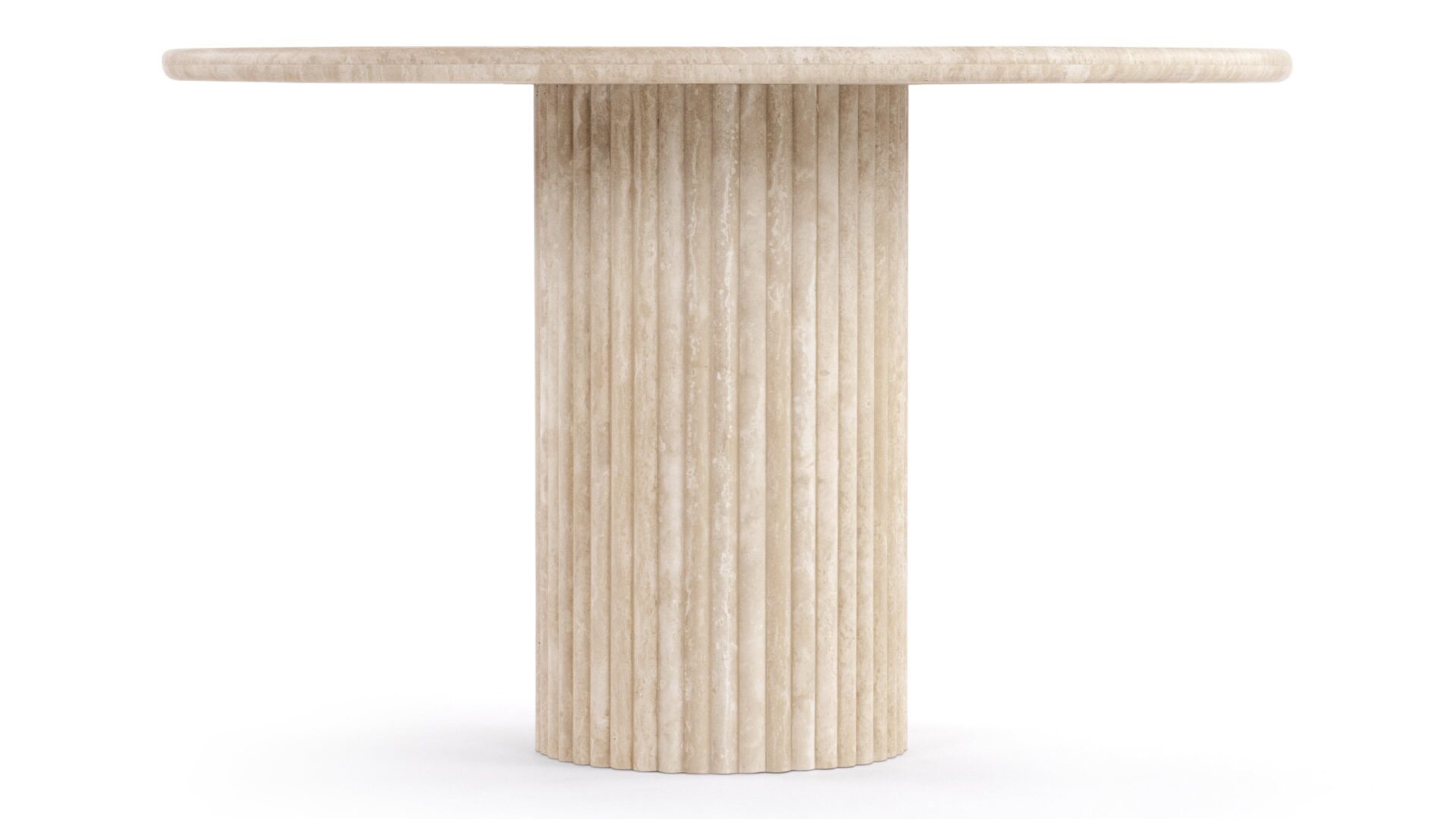 Meticulously evoking the splendor of classical architecture, the Saturn travertine dining table offers a modern interpretation of conventional design. Boasting a sleek, honed travertine tabletop juxtaposed with a texturally intriguing reeded pillar base, this piece embodies a blend of minimalism in concept and aesthetic appeal. Infused with a surprisingly warm tone, travertine is a stunning natural Italian stone with a rich history of inclusion in upscale design schemes. The honed surface of the table not only enhances its visual appeal but also provides a practical and stylish platform for dining, working, and socializing. Please note that due to its natural origins, each travertine table will possess slight variations in appearance, showcasing the inherent characteristics of the stone such as color discrepancies, natural veining, and unique patterns.