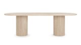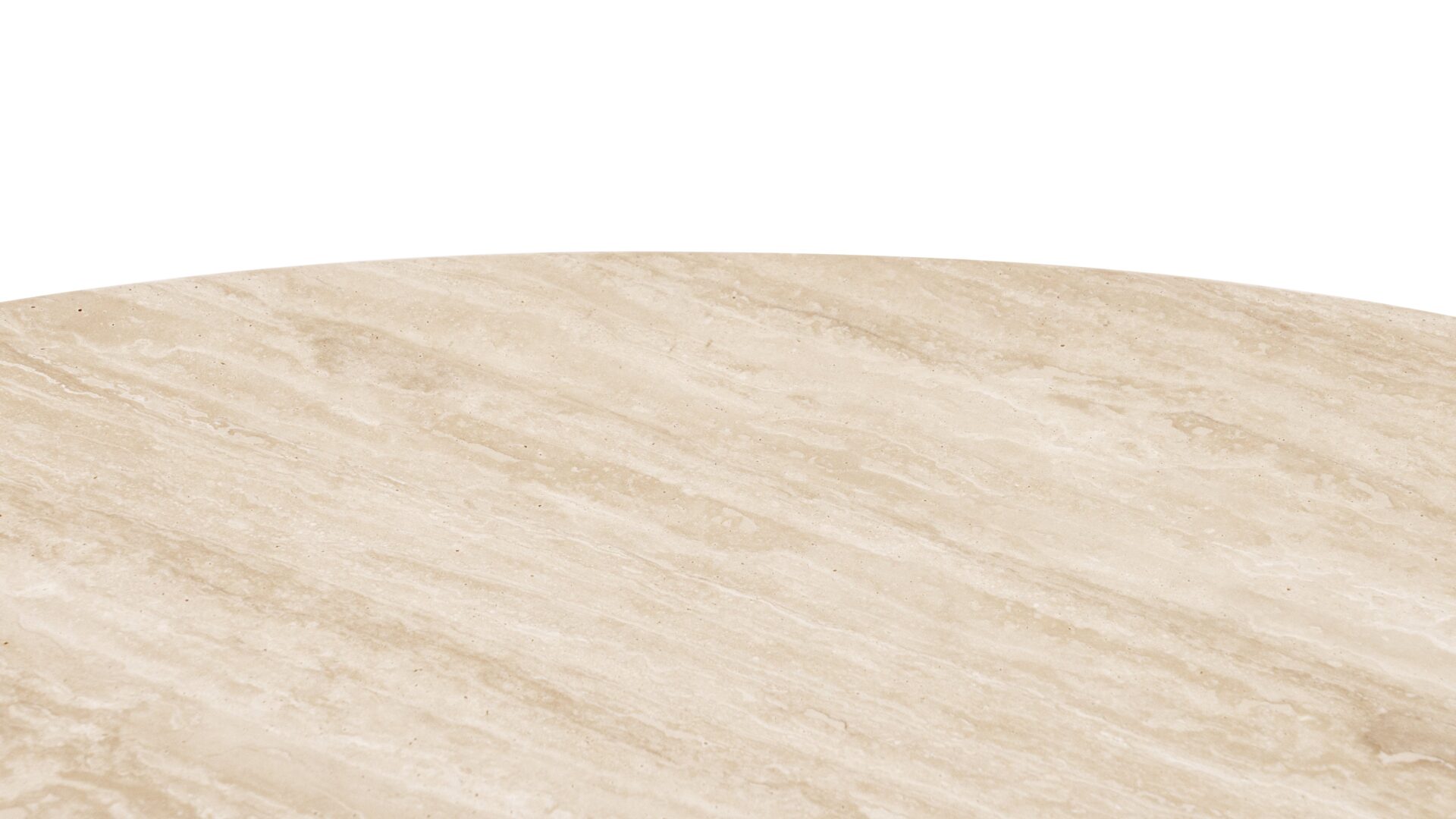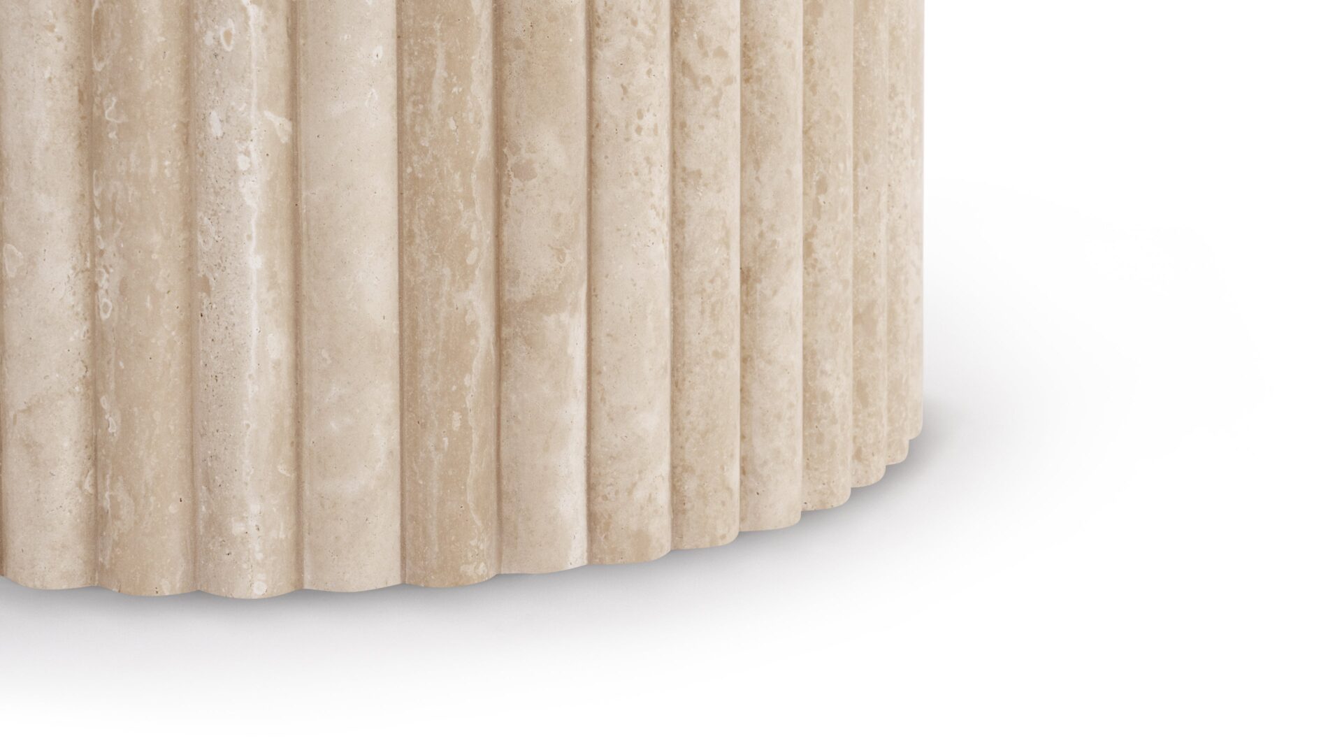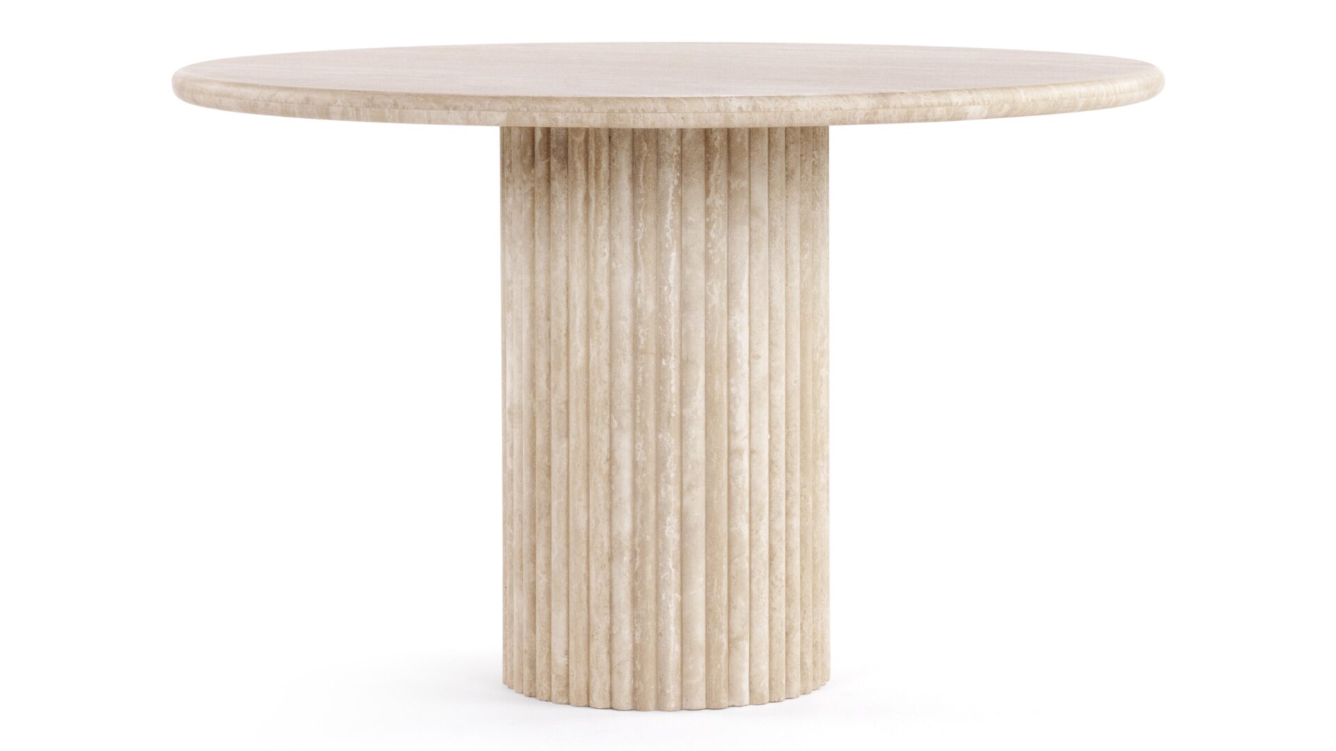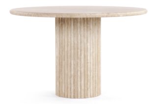 Meticulously evoking the splendor of classical architecture, the Saturn travertine dining table offers a modern interpretation of conventional design. Boasting a sleek, honed travertine tabletop juxtaposed with a texturally intriguing reeded pillar base, this piece embodies a blend of minimalism in concept and aesthetic appeal. Infused with a surprisingly warm tone, travertine is a stunning natural Italian stone with a rich history of inclusion in upscale design schemes. The honed surface of the table not only enhances its visual appeal but also provides a practical and stylish platform for dining, working, and socializing. Please note that due to its natural origins, each travertine table will possess slight variations in appearance, showcasing the inherent characteristics of the stone such as color discrepancies, natural veining, and unique patterns.