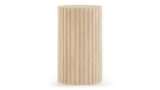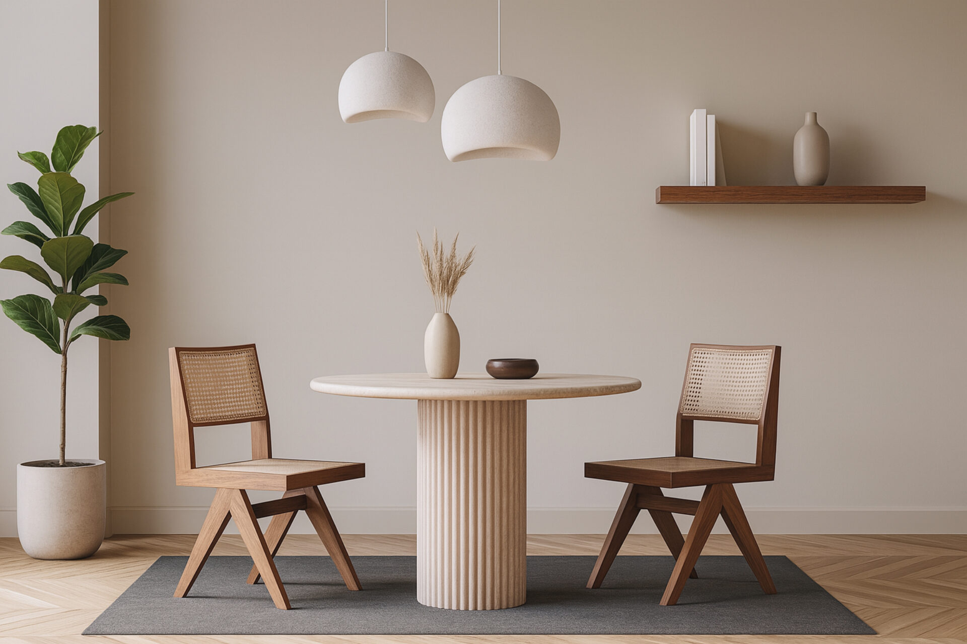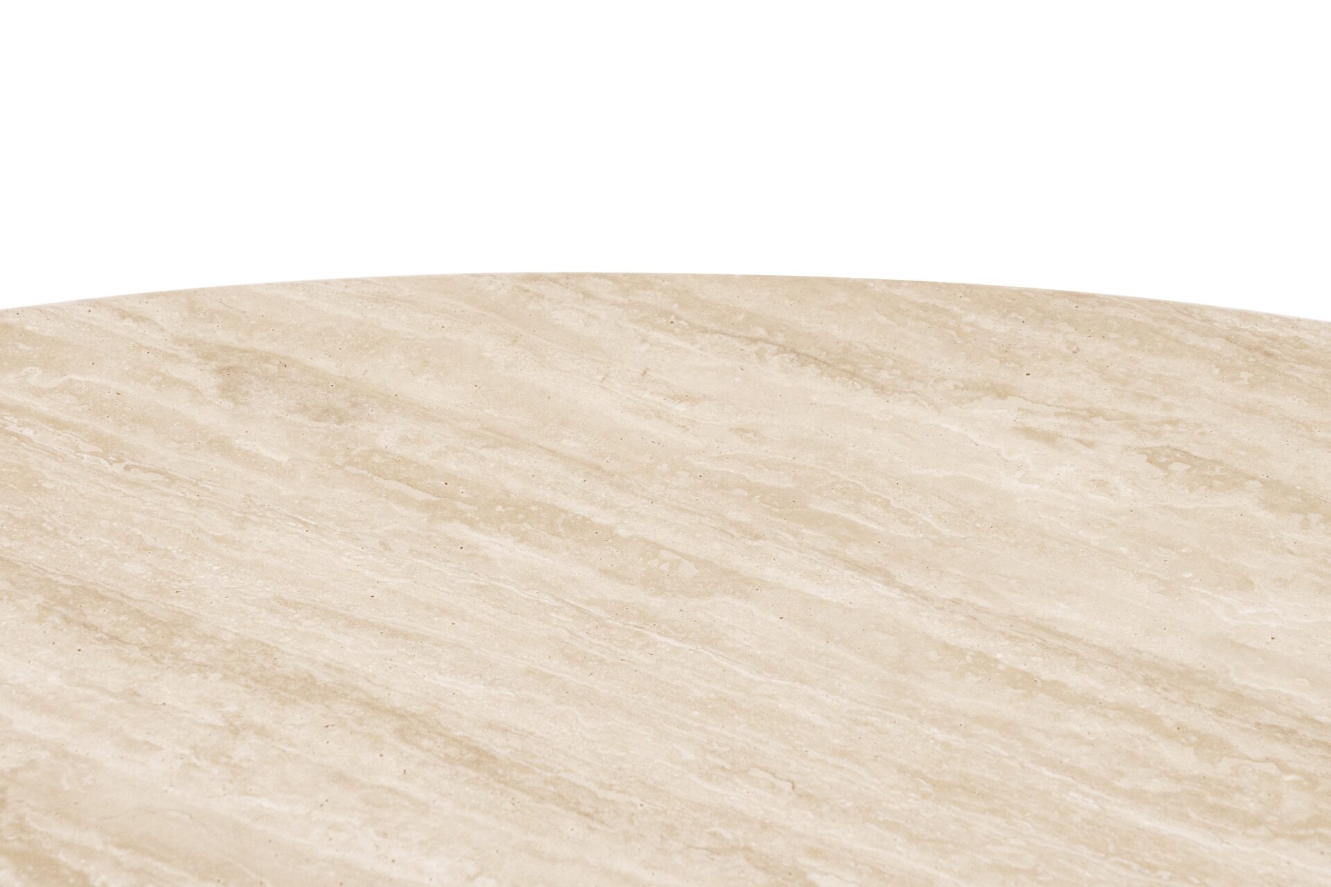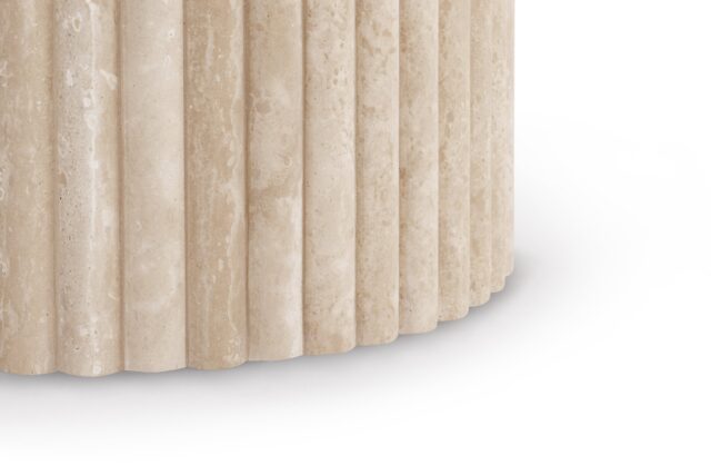 Crafted from honed natural Italian travertine, this exquisite modern table serves as a striking focal point. Boasting a moon-like circular top and a reeded pedestal base, it is an excellent option for sophisticated, contemporary residences.