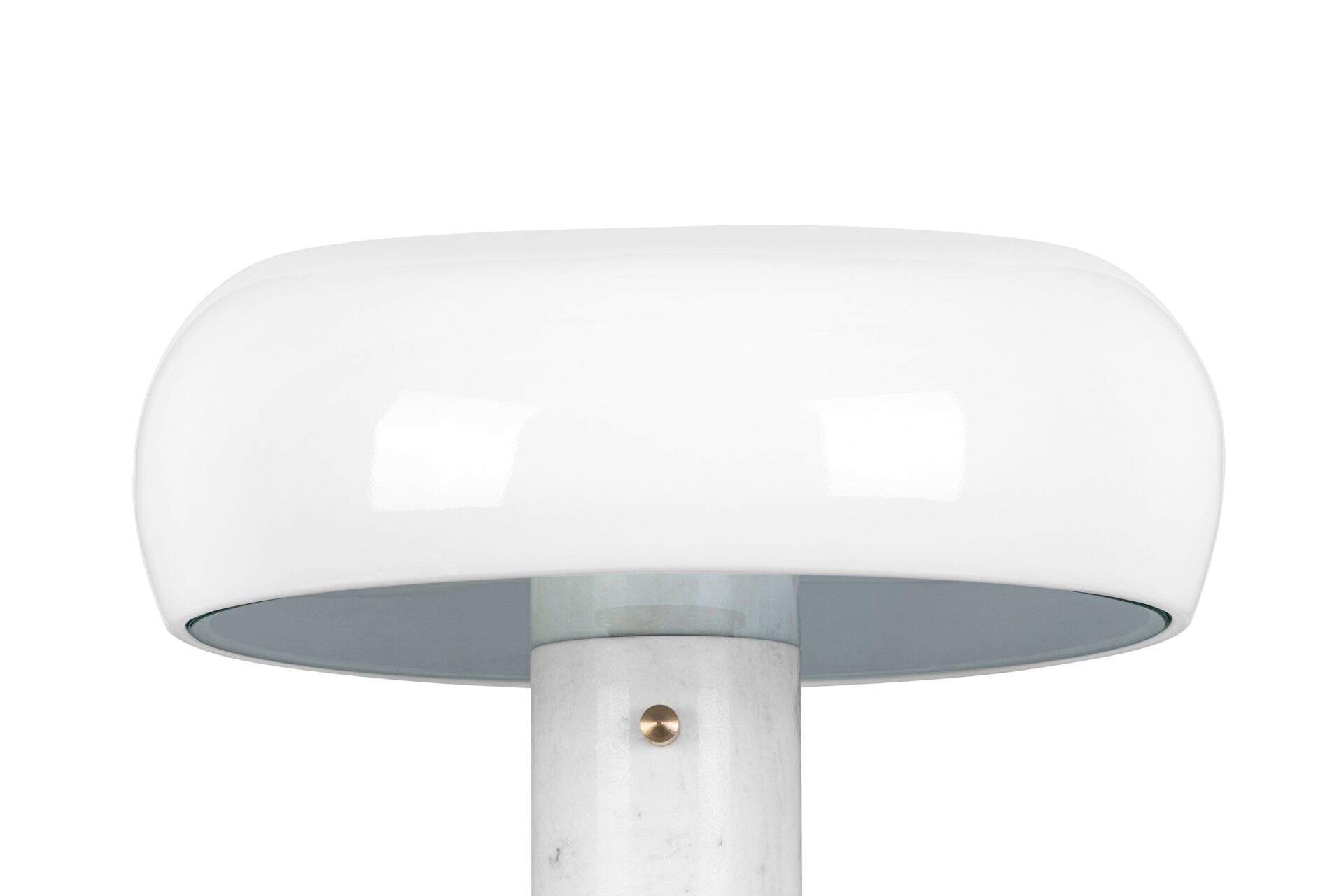 Illuminate your space with the iconic Snoopy Style Desk Lamp in White, showcasing a unique silhouette brimming with enduring appeal. Designed with an internal switch for effortless use, this fixture exudes a touch of retro flair with its sleek metal shade. Elevate your workspace or leisure area with this versatile piece in a stylish and inviting white finish that harmoniously blends work and relaxation. Optional Power Source: Elevate your space with the stylish and functional White Heston Table Lamp, a true work of art that exudes modern charm. Whether placed on your desk for targeted lighting or on a sideboard for a striking visual impact, this lamp is designed to enhance your surroundings both day and night. Its contemporary shade design along with the luxurious marble base creates a piece that exudes both avant-garde flair and timeless sophistication, making it a classic symbol of retrofuturistic style.