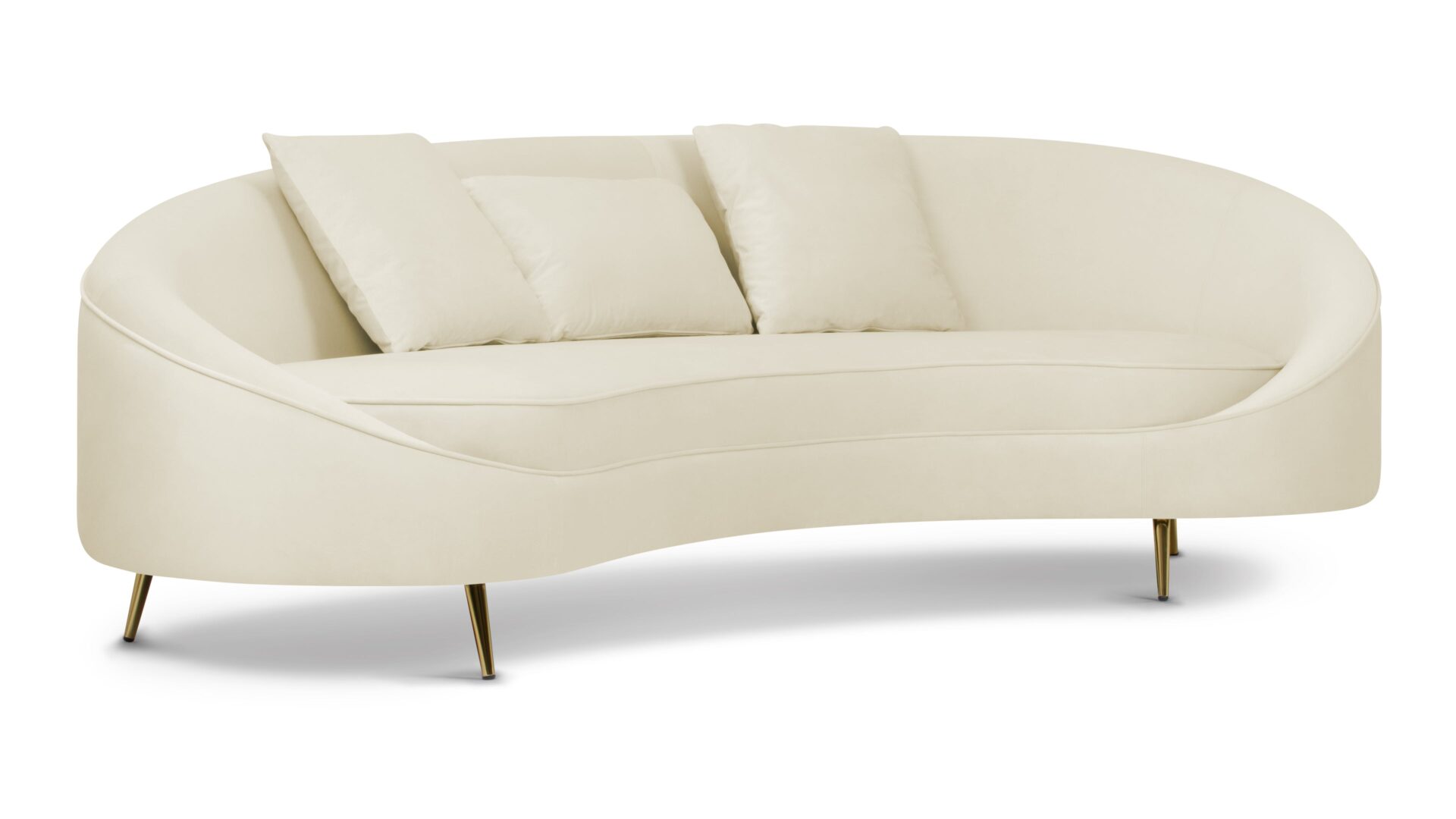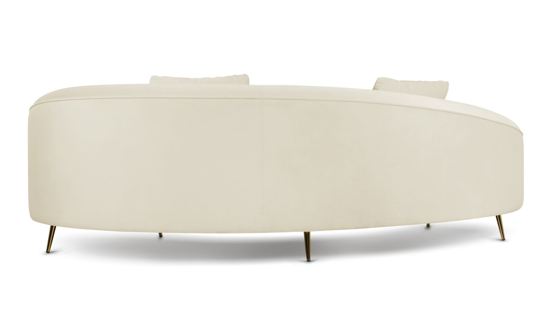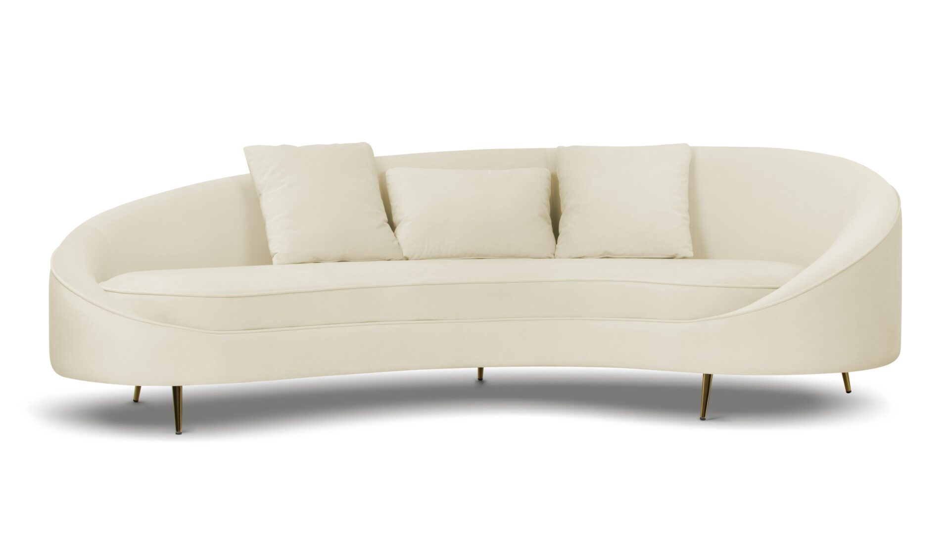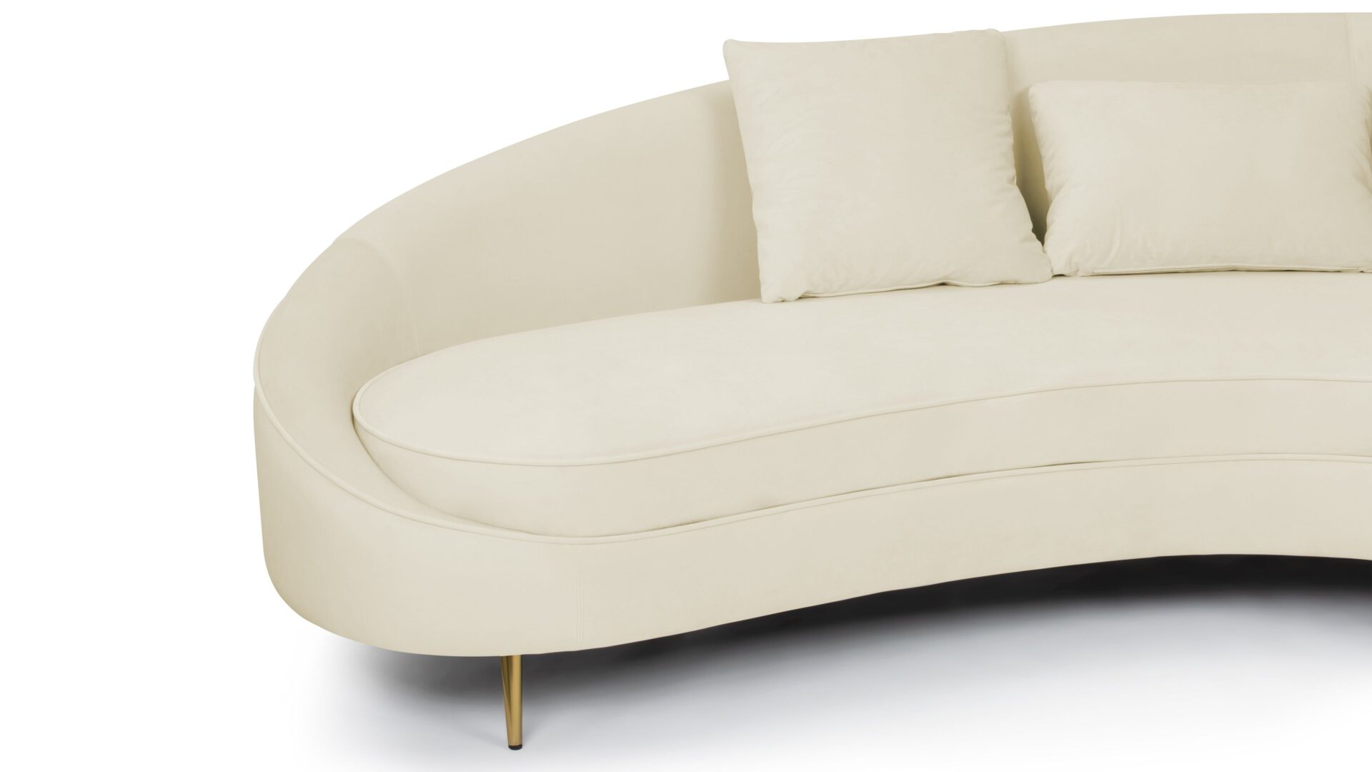 Indulge in sublime sophistication with the Sofie Sofa, featuring easy-care velvet upholstery in a cozy, neutral cream hue. This modern sofa showcases a unique asymmetric curved silhouette, accentuated by expert upholstery and piping detail, all perched on chic, brass-finished tapered legs. Crafted for lounging and socializing, the Sofie Sofa includes multiple scatter cushions for customizable comfort whether you're unwinding or conversing. Perfect for contemporary or minimalist decor, the Sofie Sofa delivers a blend of luxe style and relaxation. Enhance your refined living space by pairing it with a complementary colored occasional chair. Its distinctive island shape and contemporary styling will elevate the visual appeal of your home, creating a plush seating choice for yourself and visitors.