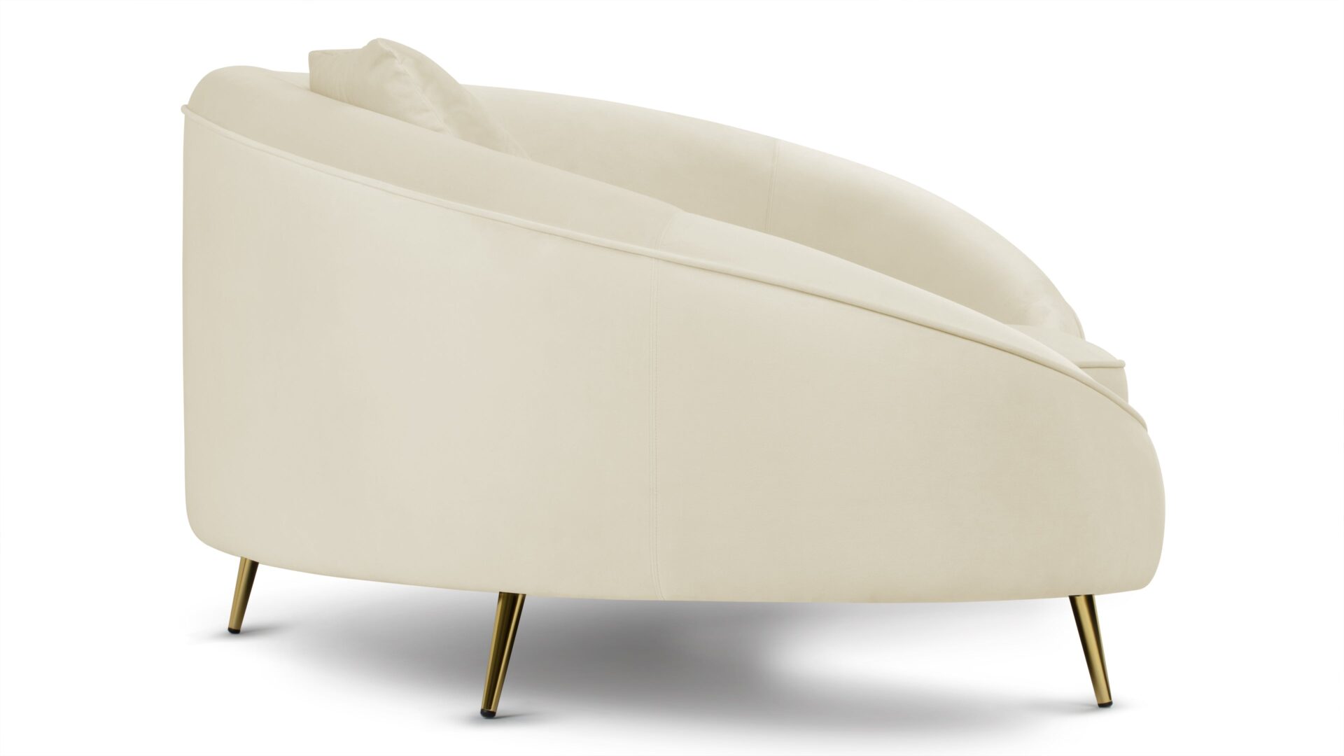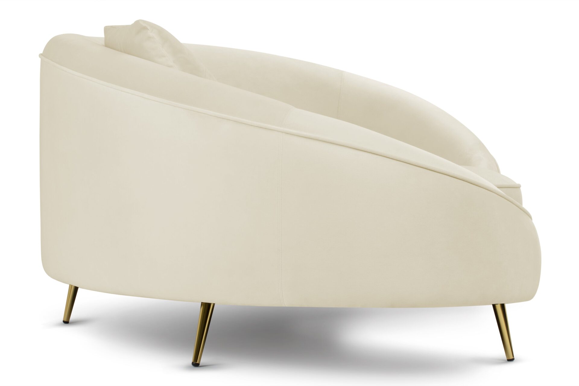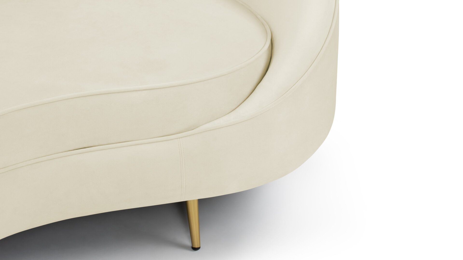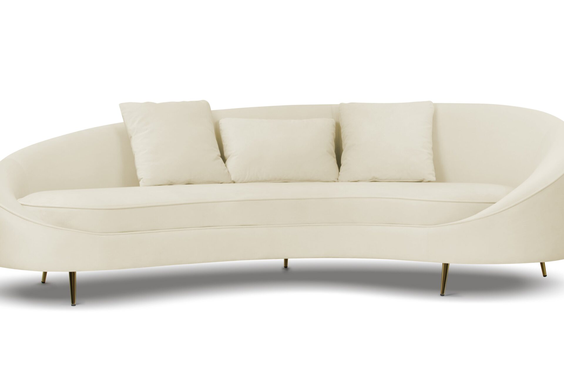 Indulge in sublime sophistication with the Sofie Sofa, featuring easy-care velvet upholstery in a cozy, neutral cream hue. This modern sofa showcases a unique asymmetric curved silhouette, accentuated by expert upholstery and piping detail, all perched on chic, brass-finished tapered legs. Crafted for lounging and socializing, the Sofie Sofa includes multiple scatter cushions for customizable comfort whether you're unwinding or conversing. Perfect for contemporary or minimalist decor, the Sofie Sofa delivers a blend of luxe style and relaxation. Enhance your refined living space by pairing it with a complementary colored occasional chair. Its distinctive island shape and contemporary styling will elevate the visual appeal of your home, creating a plush seating choice for yourself and visitors.