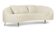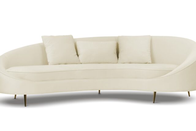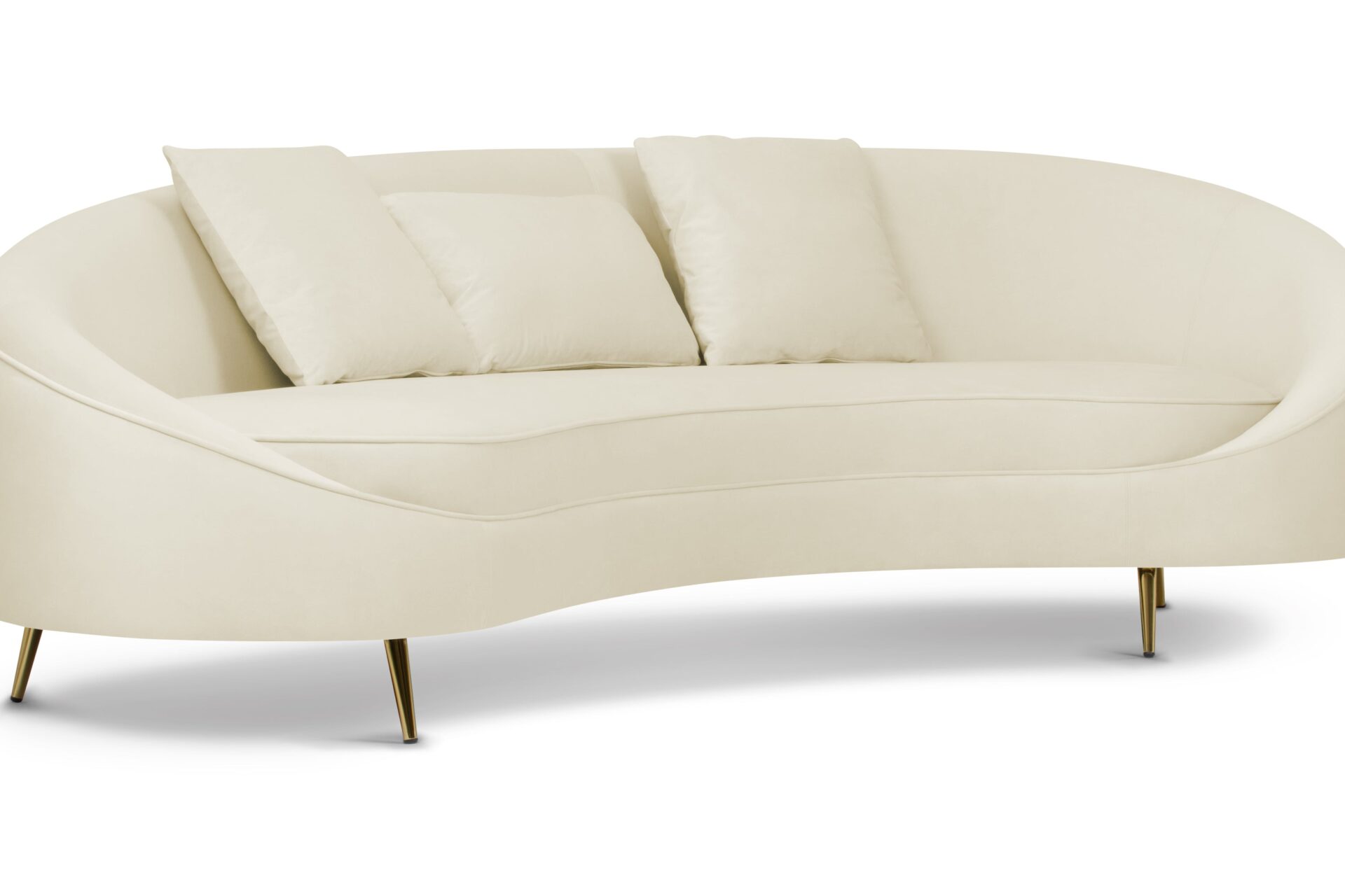 Introducing the Sofie Sofa, showcasing a modern, asymmetric curved design in a versatile cream hue, ideal for contemporary and minimalist decor. Enhancing its elegance are the piping accents and brass-finished tapered feet, elevating the style of any room.