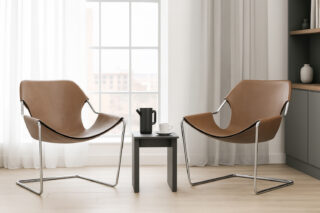 Experience the distinctive design of the iconic 'T' chair, characterized by its sharp angles and geometric form. Its stylish steel legs come together at 90-degree angles, meeting the soft curved backrest to create a commanding look.