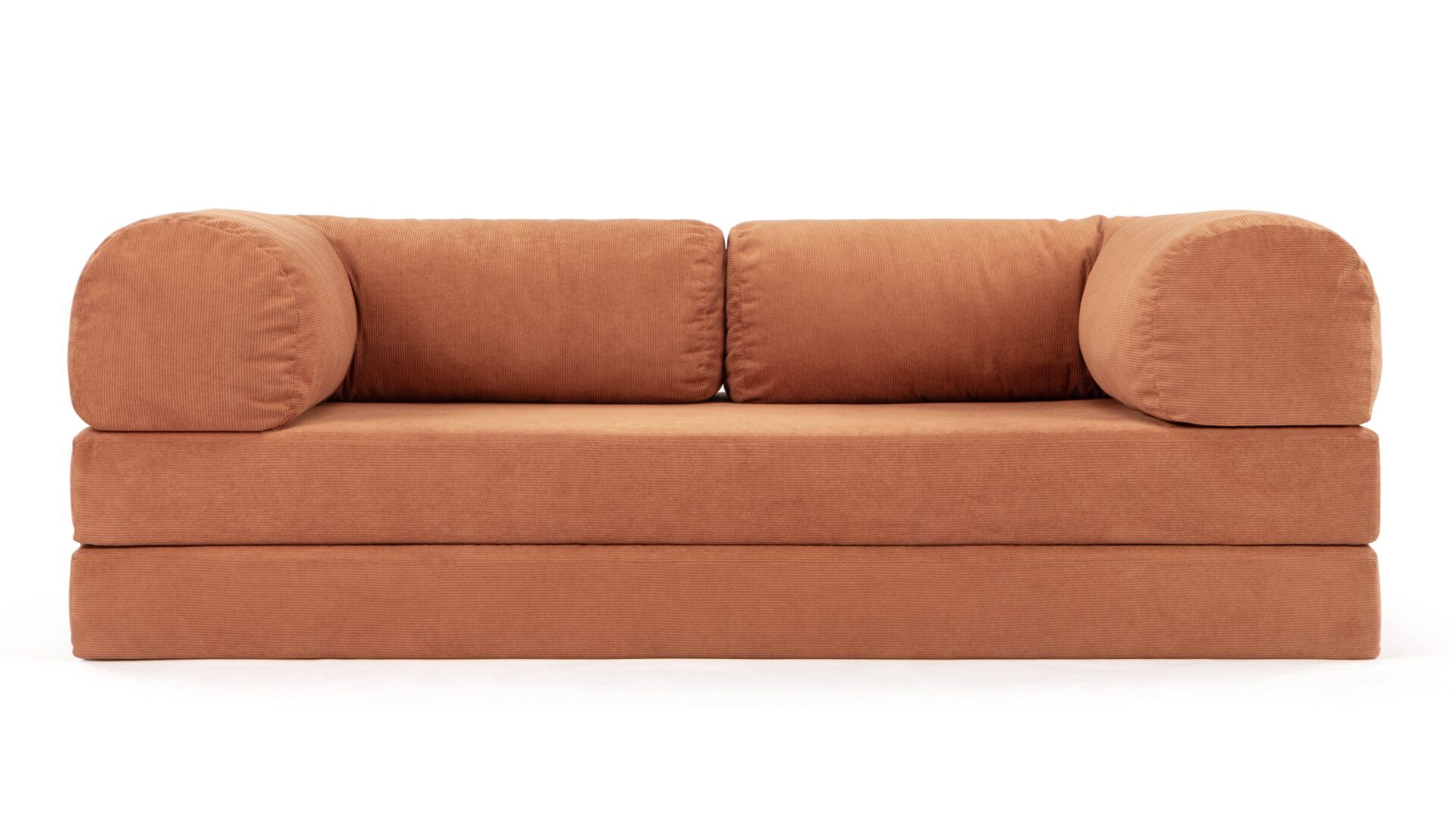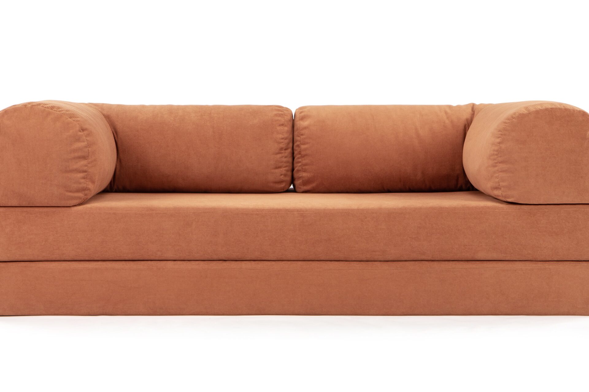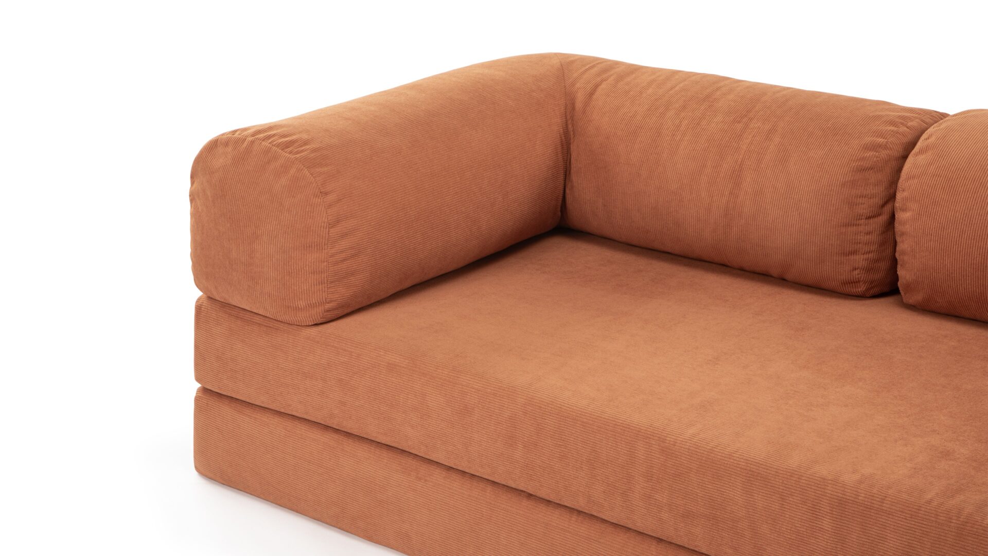 Discover the perfect fusion of contemporary style and luxurious coziness with the Teddy Sofa. This sofa showcases a vibrant orange corduroy finish and generously-sized ribbed cushions for added comfort. Its versatile design includes a convertible pull-out base, allowing it to effortlessly convert into a lounge or bed, catering especially to compact living areas.