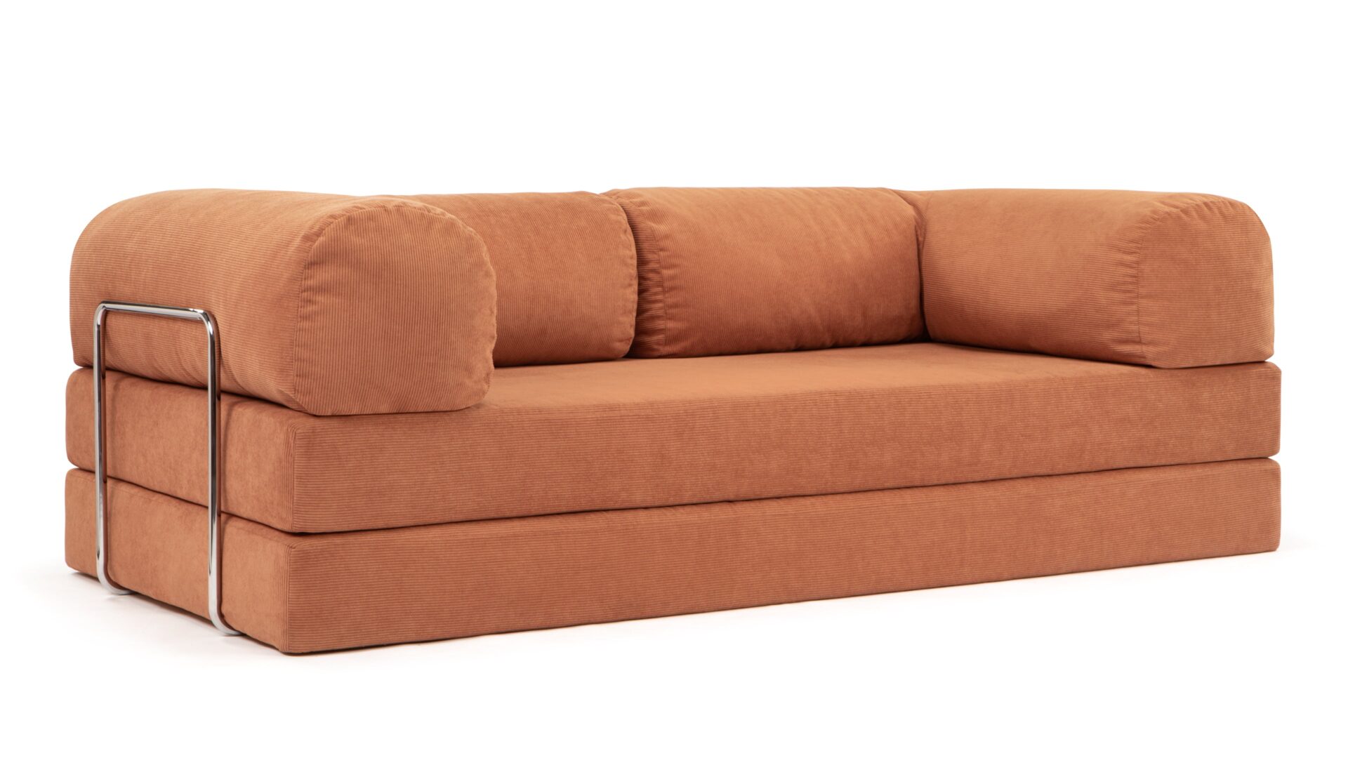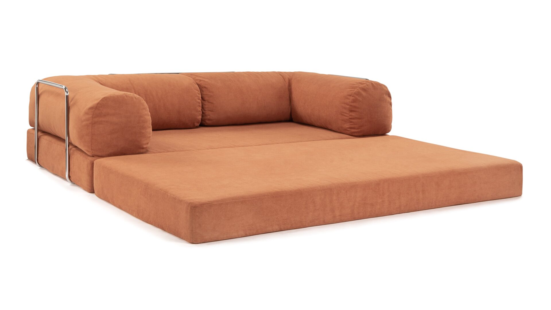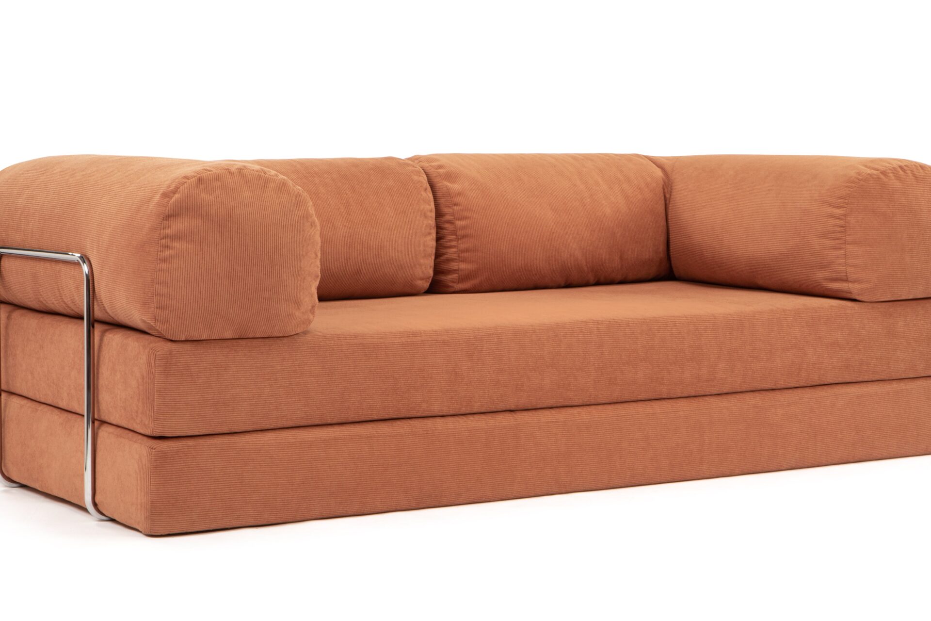 Experience the versatile Teddy Sofa - a stylish and functional piece designed for optimal comfort and adaptability. Wrapped in luxurious orange corduroy with ribbed cushions, this sofa effortlessly transforms into a spacious lounge or bed. Boasting contemporary metal frame accents, adjustable arm and backrest, it combines modern design with enduring comfort. Perfect for those seeking a practical yet stylish seating solution in compact living spaces.