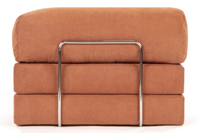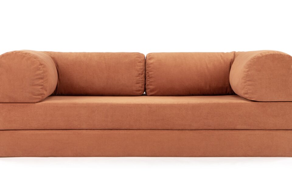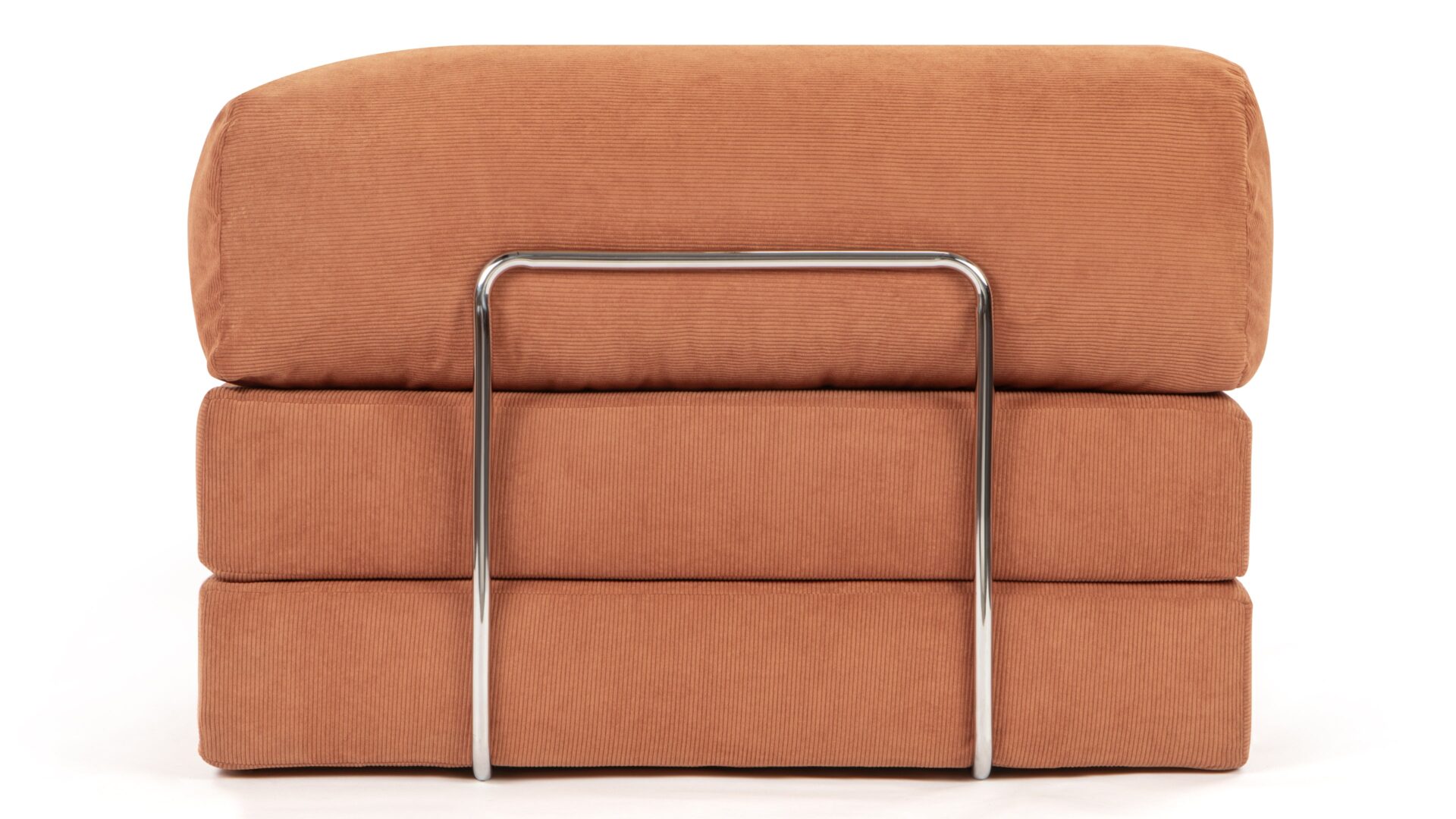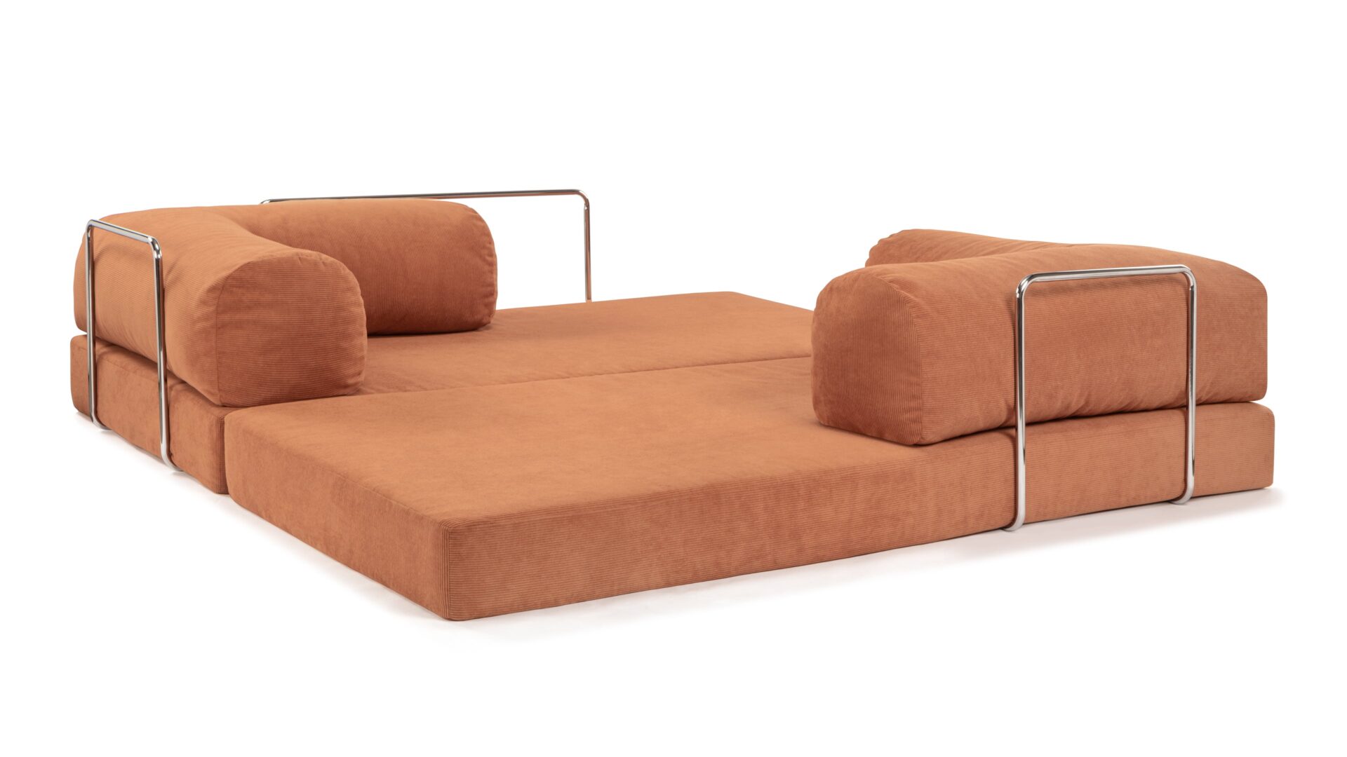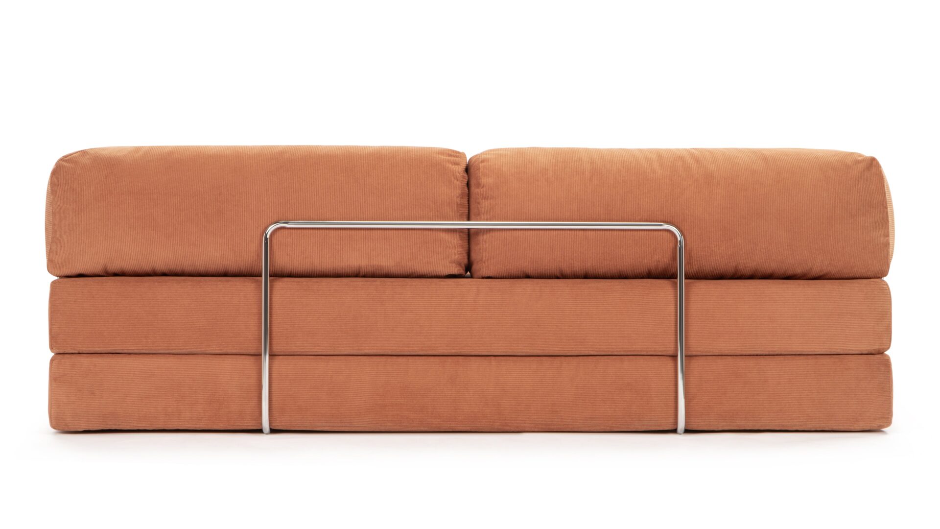 Experience the versatile Teddy Sofa - a stylish and functional piece designed for optimal comfort and adaptability. Wrapped in luxurious orange corduroy with ribbed cushions, this sofa effortlessly transforms into a spacious lounge or bed. Boasting contemporary metal frame accents, adjustable arm and backrest, it combines modern design with enduring comfort. Perfect for those seeking a practical yet stylish seating solution in compact living spaces.