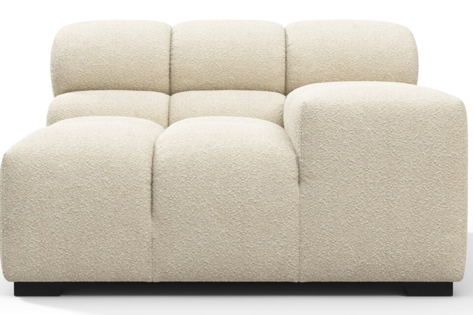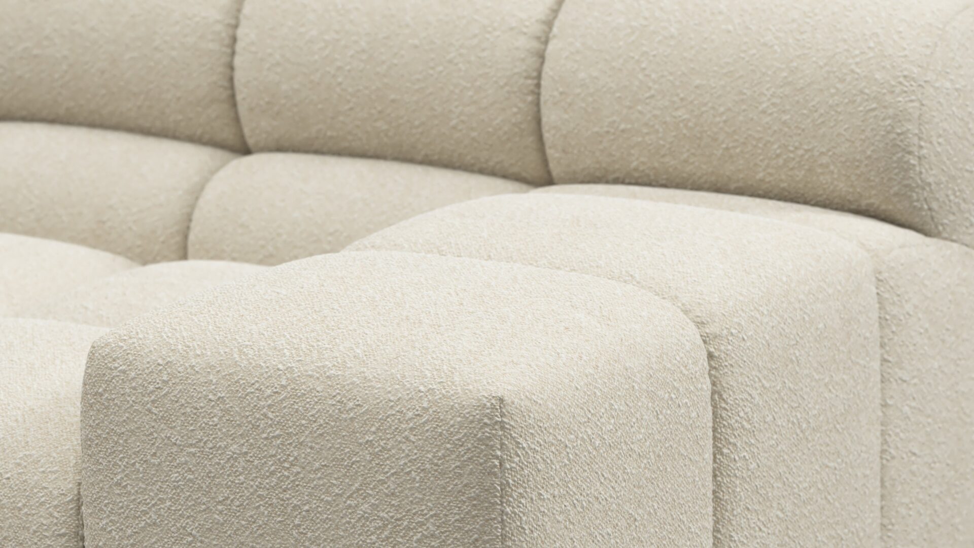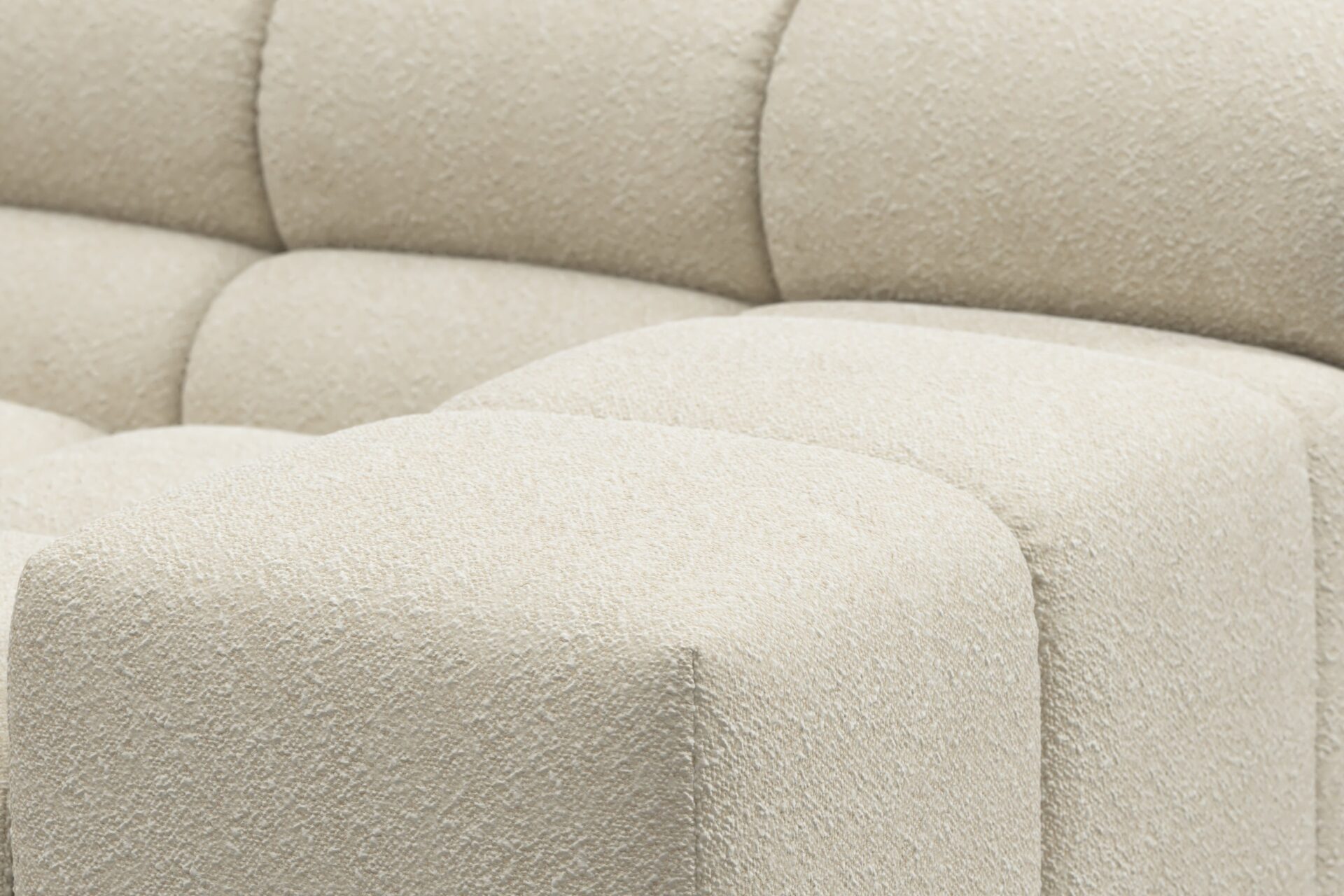 Introducing a modern twist on the classic Chesterfield style, the Tufty sectional exudes relaxed 70s vibes with its Eggshell Boucle material. This versatile piece embraces a simplistic modular design, effortlessly fitting into any space from city lofts to entertainment areas. With subtle curves and ample dimensions, it offers ultimate comfort while capturing attention with its casual yet elegant appeal, making it a chic addition to both modern and vintage interiors.