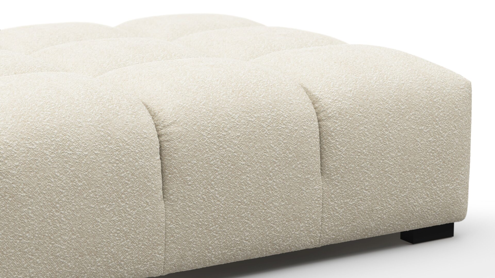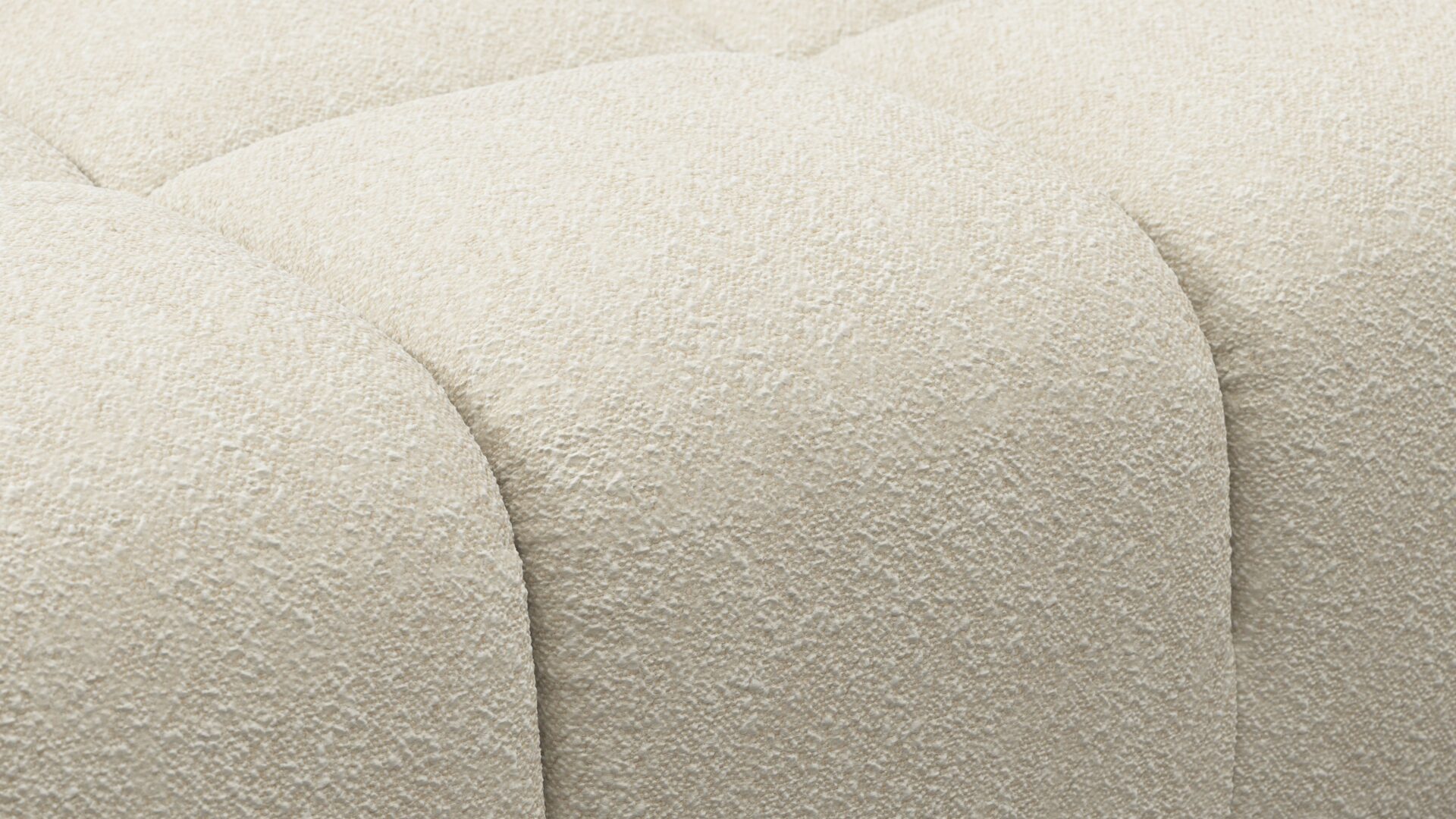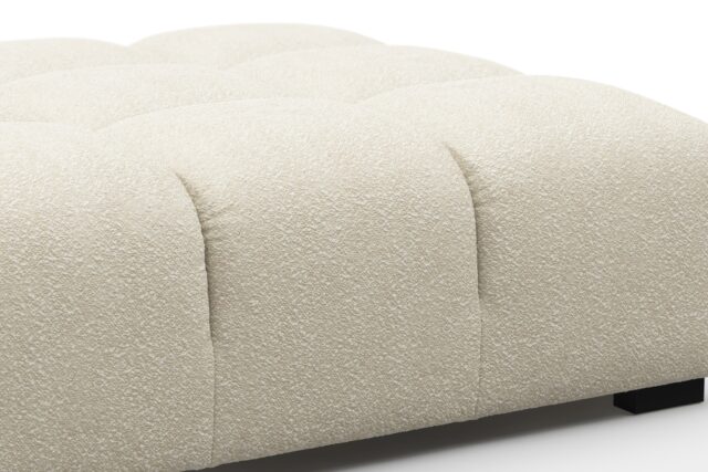 Introducing the Tufty sectional, a modern reinterpretation of the classic Chesterfield style infused with 70s retro charm. With a fresh take on traditional design, this versatile piece in Eggshell Boucle combines casual elegance and ultimate comfort. Its playful aesthetic and modular structure effortlessly blend into any space, from city lofts to entertainment areas, capturing attention with its subtle curves and shapes.