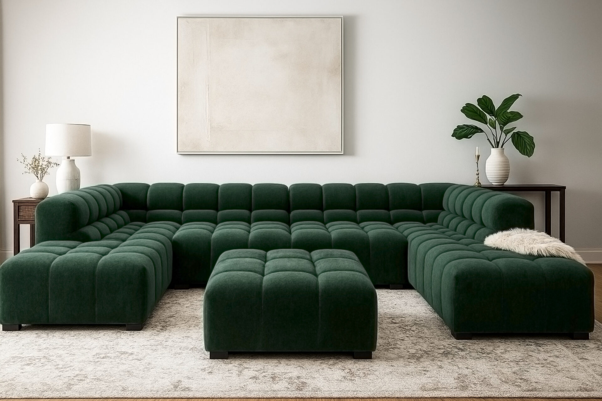 Introducing a contemporary twist on the classic Chesterfield style, the Tufty Sectional offers a nod to 70s design with a relaxed vibe. Featuring a playful aesthetic, this modular masterpiece effortlessly adapts to any space. Crafted in Forest Green Chenille, this luxurious piece promises indulgent lounging and casual elegance, perfect for modern or vintage interiors.
