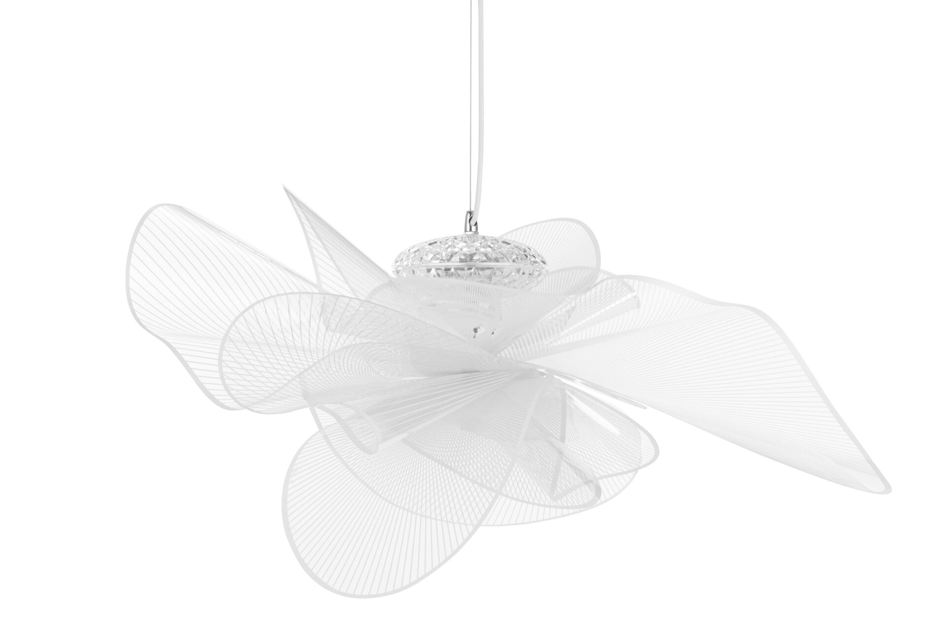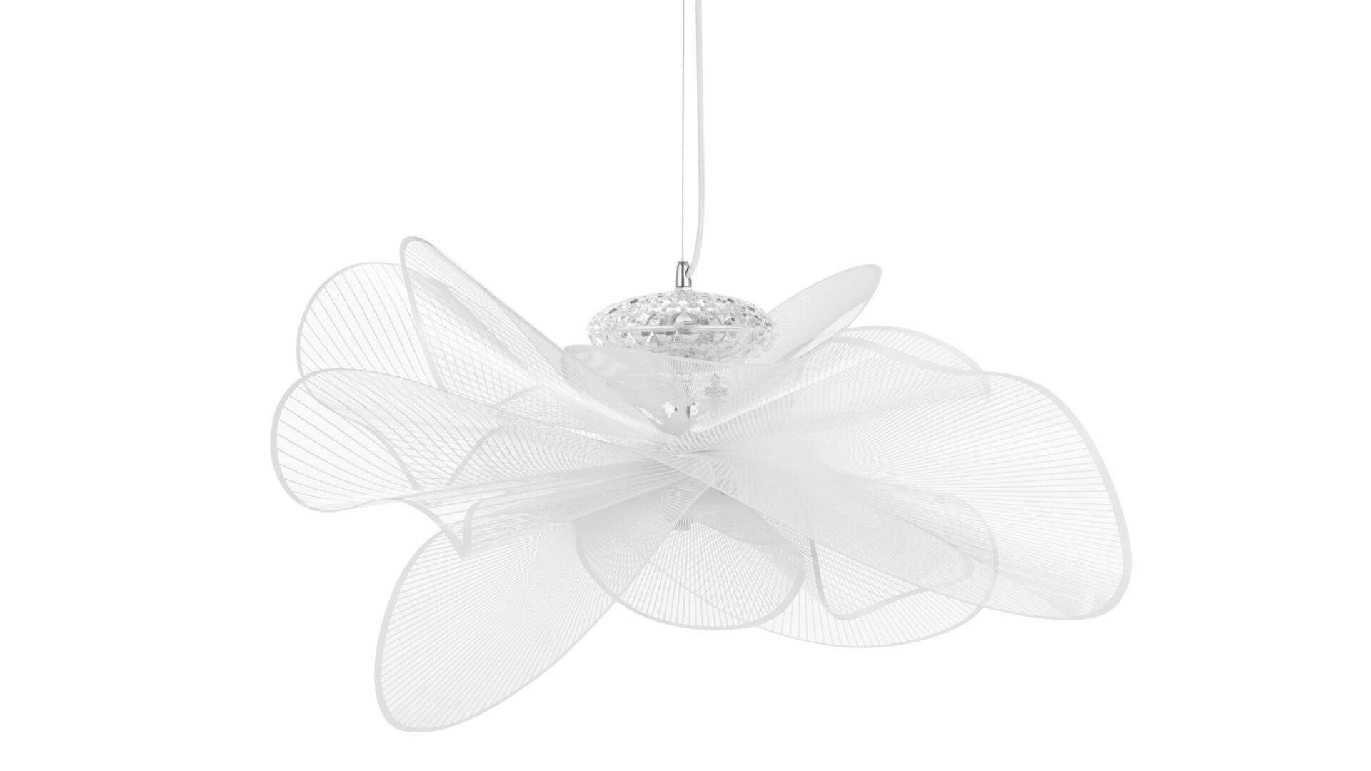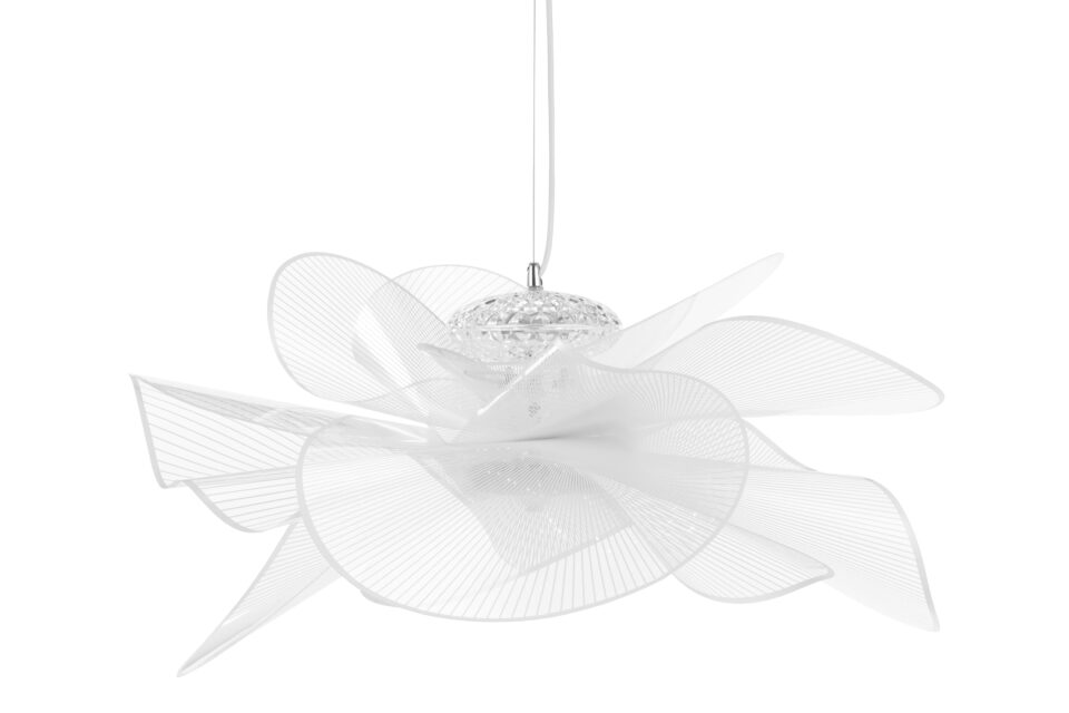 Experience the contemporary elegance of the Tulle Ceiling Lamp, a stunning fixture composed of wide, curved acrylic pieces that evoke the movement of undulating waves. Illuminated by an internal LED system encased in a crystal-like compartment, this lamp emits a soft, warm white glow that elevates the atmosphere of any space. Drawing inspiration from the texture and light diffusion qualities of tulle fabric, and suspended by a slender cord, this lamp boasts a remarkably lightweight presence.