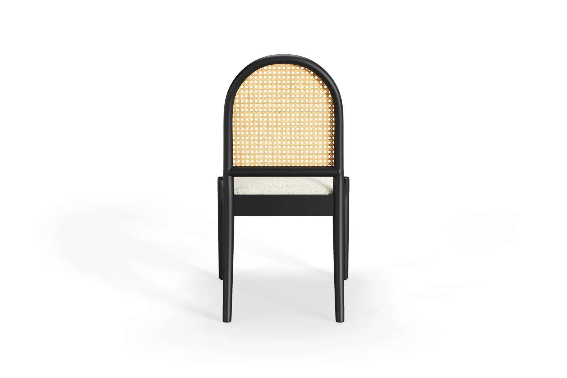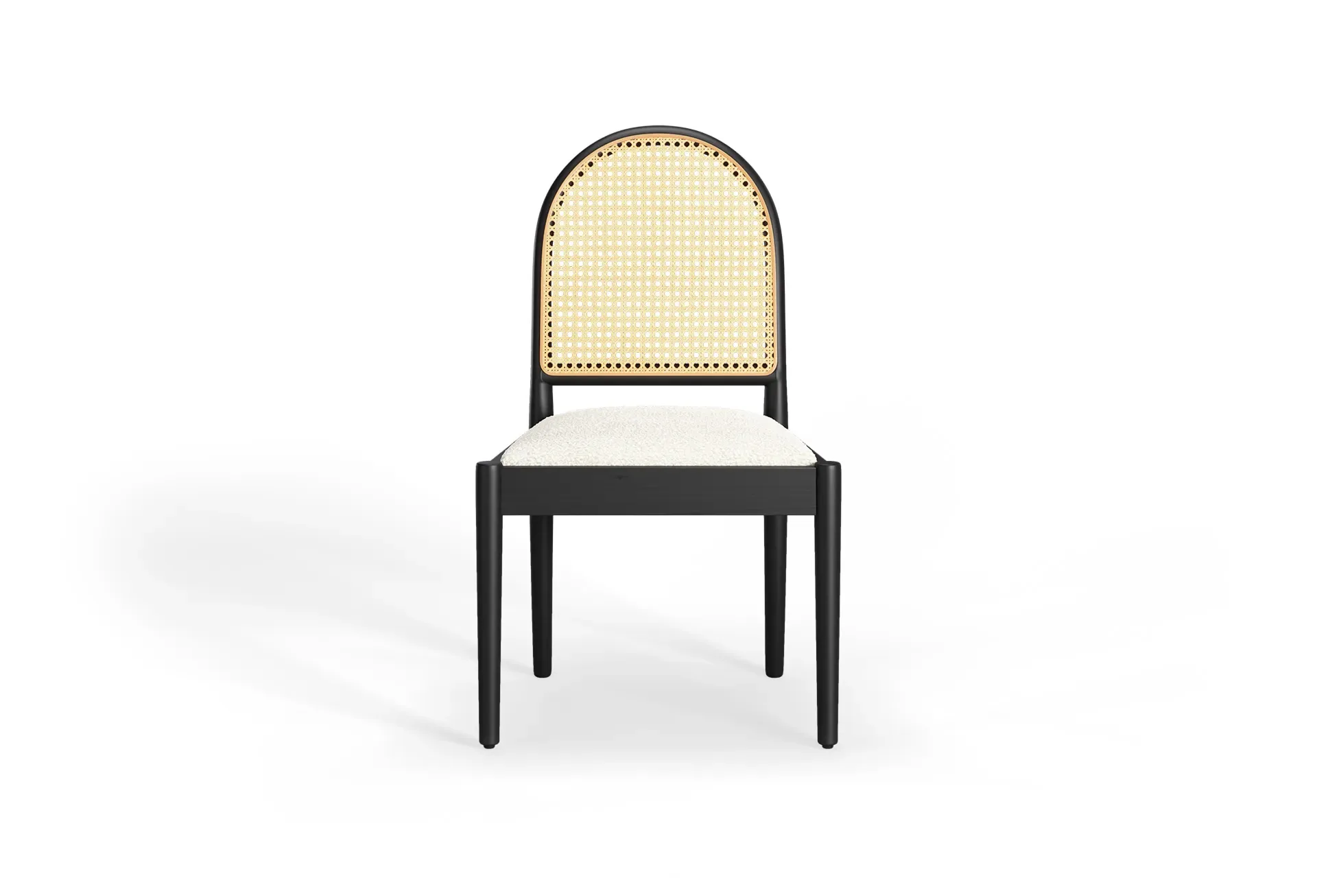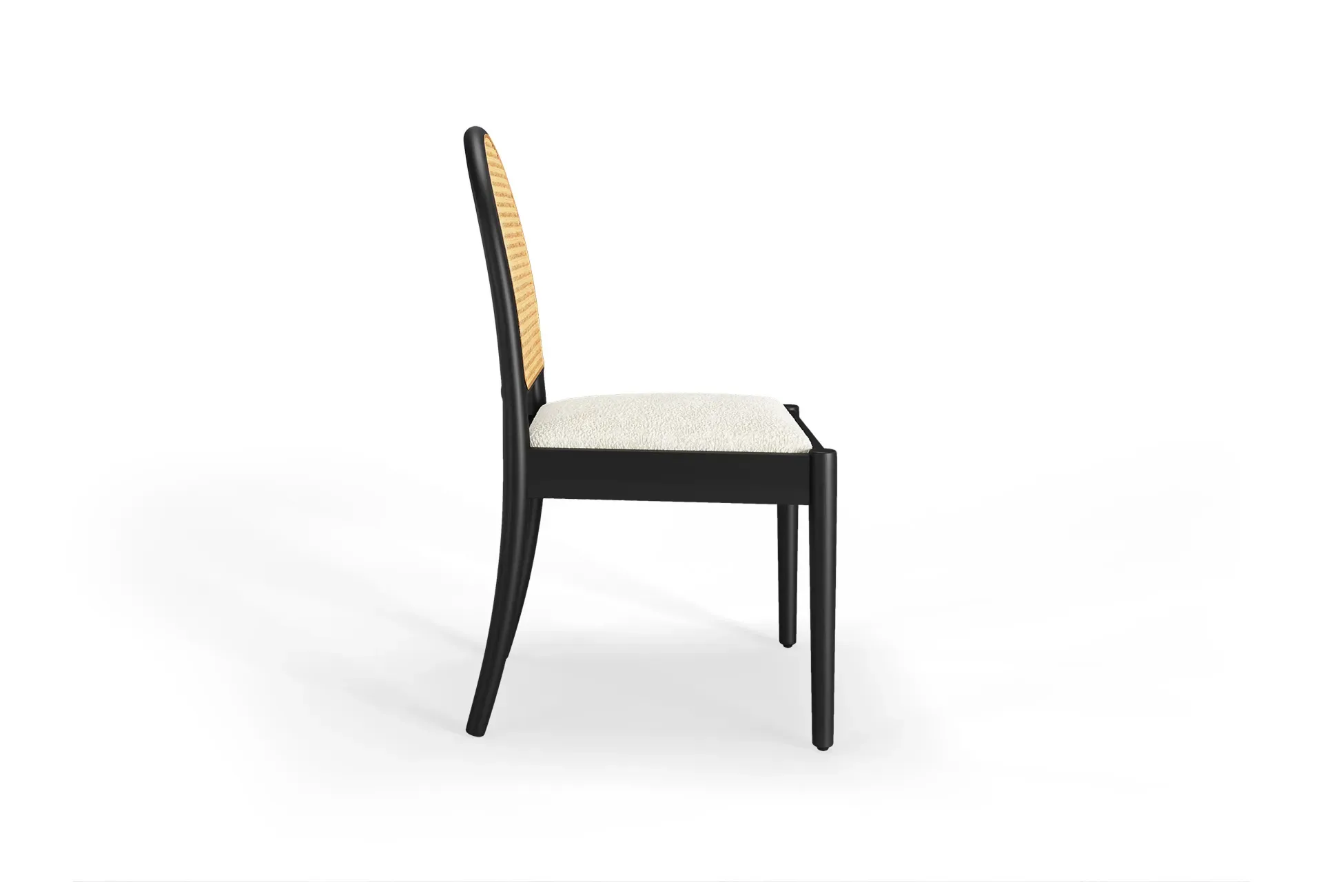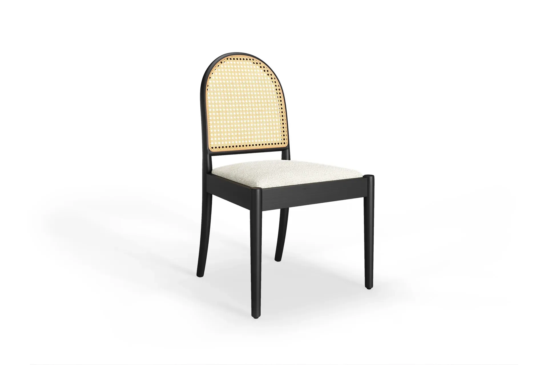 Sleek and contemporary, the Yuna Dining Chair in black contrasts beautifully with its white bouclé seat and woven rattan backrest. A sophisticated mix of texture and tone for modern dining spaces.