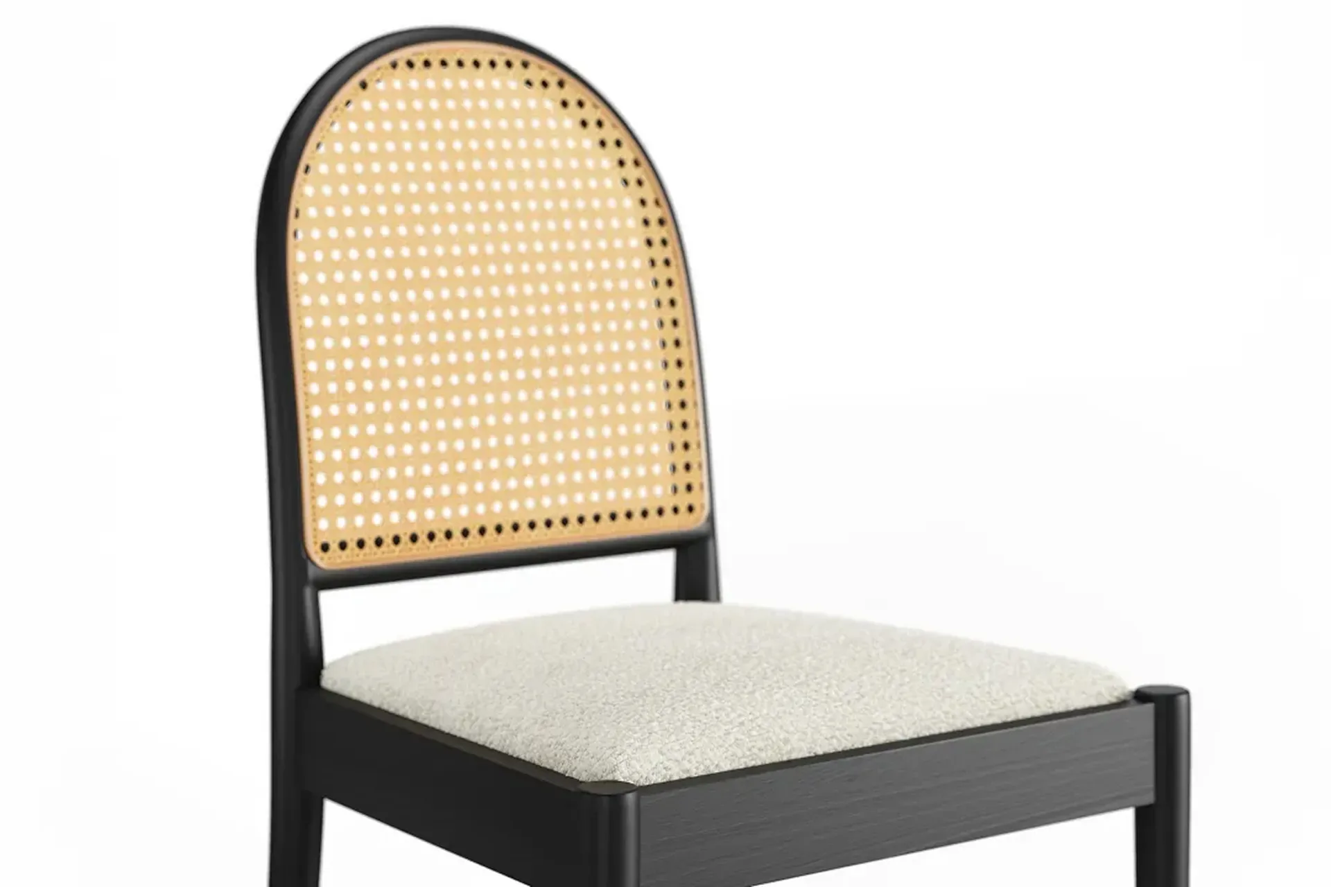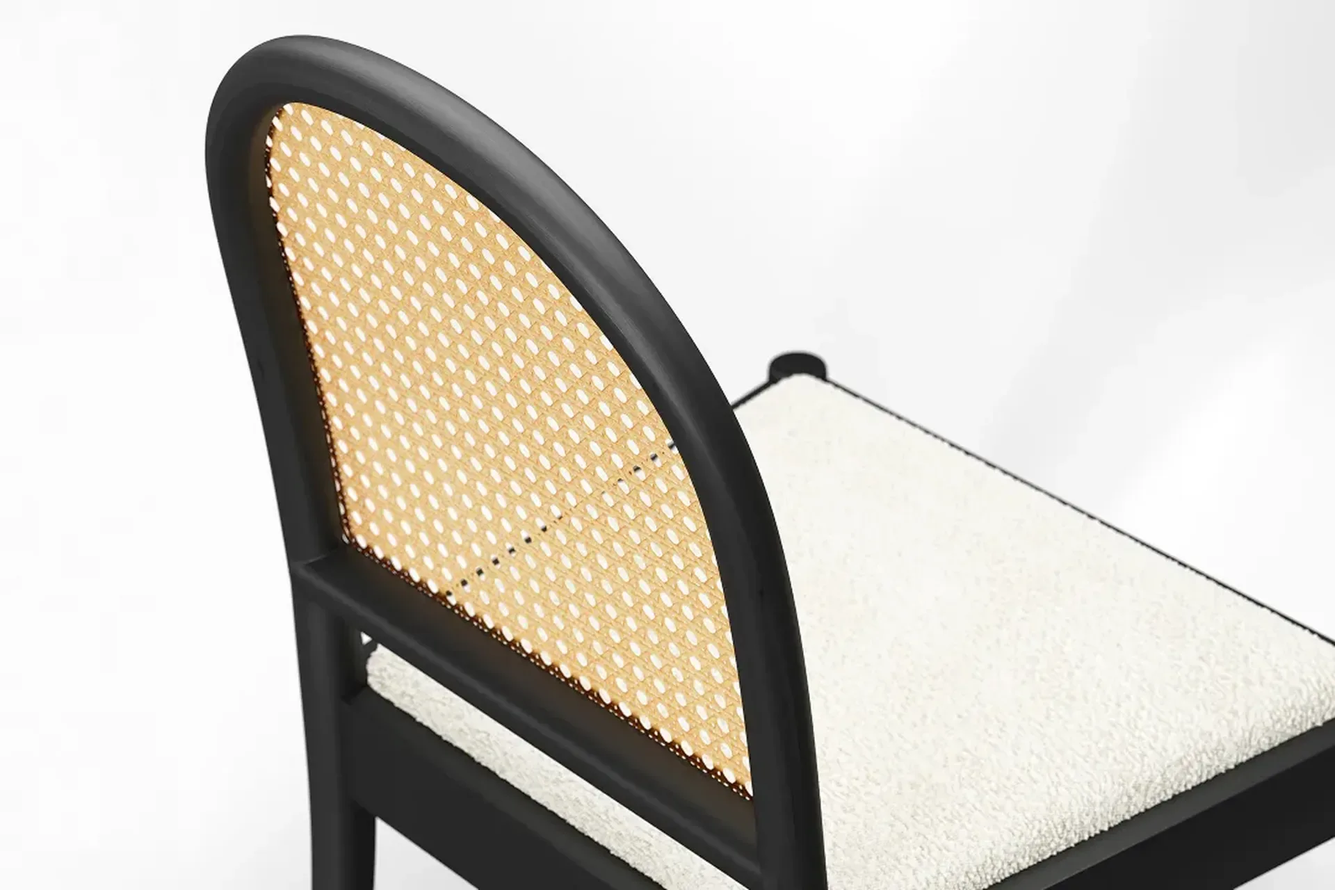 Black wood offers timeless structure and visual depth, while white bouclé adds inviting softness with its tactile, cloud-like texture. The woven rattan introduces breathability and natural warmth, creating a balanced mix of durability, comfort, and contrast that feels refined yet organic.