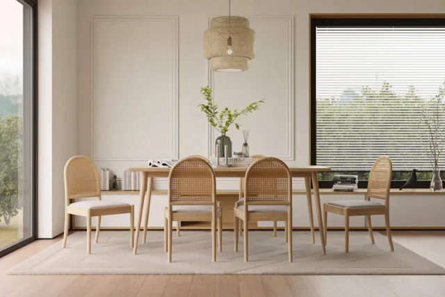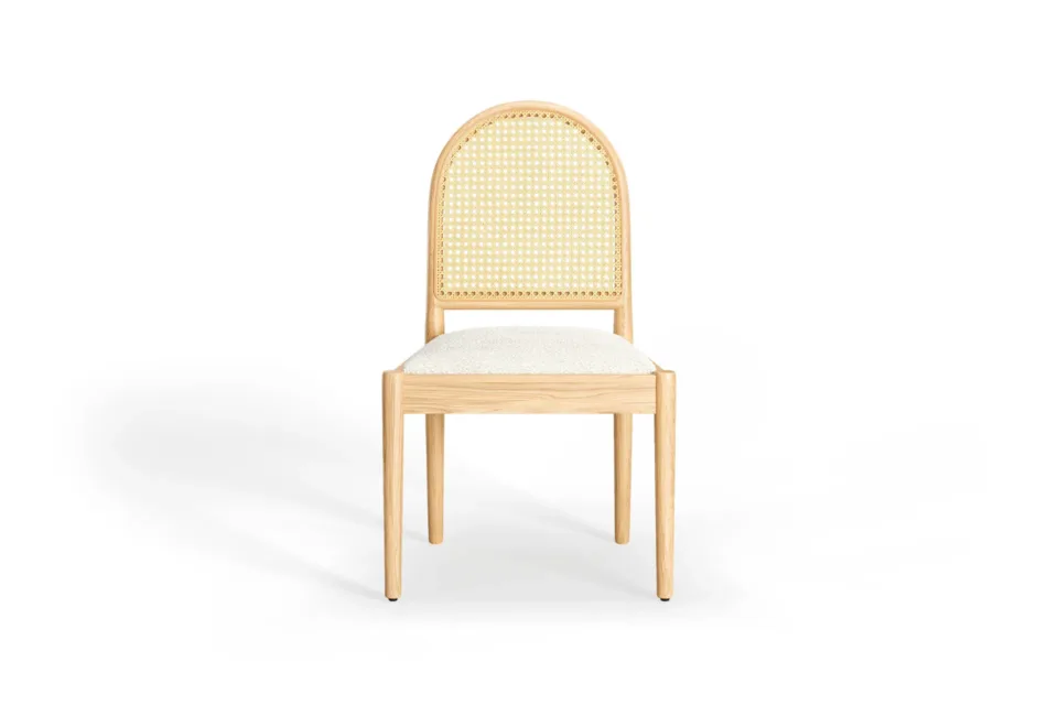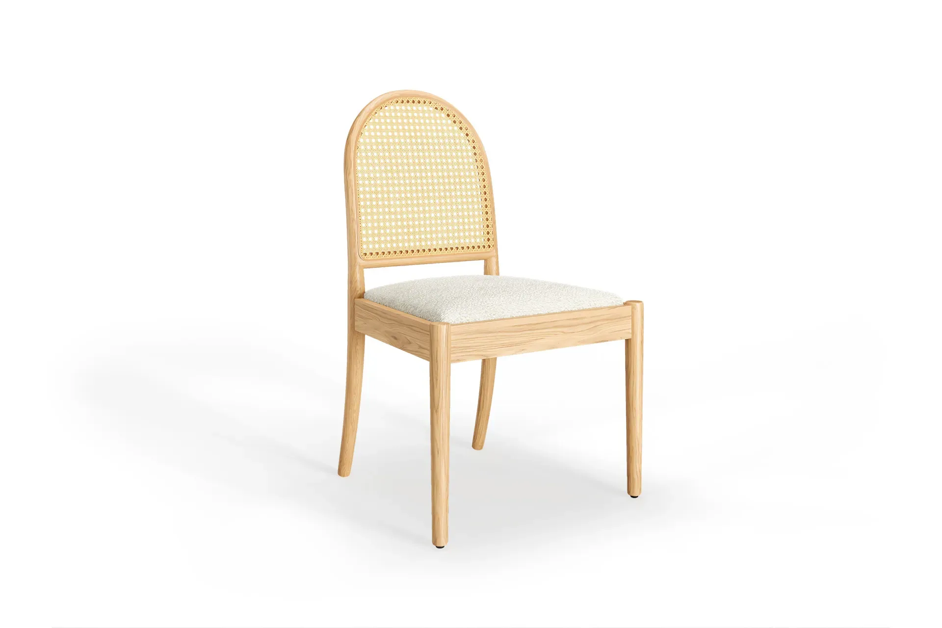 In soothing oak wood, this Yuna Dining Chair captures effortless elegance. The soft bouclé seat and woven rattan backrest create a welcoming feel, ideal for everyday meals and long conversations.