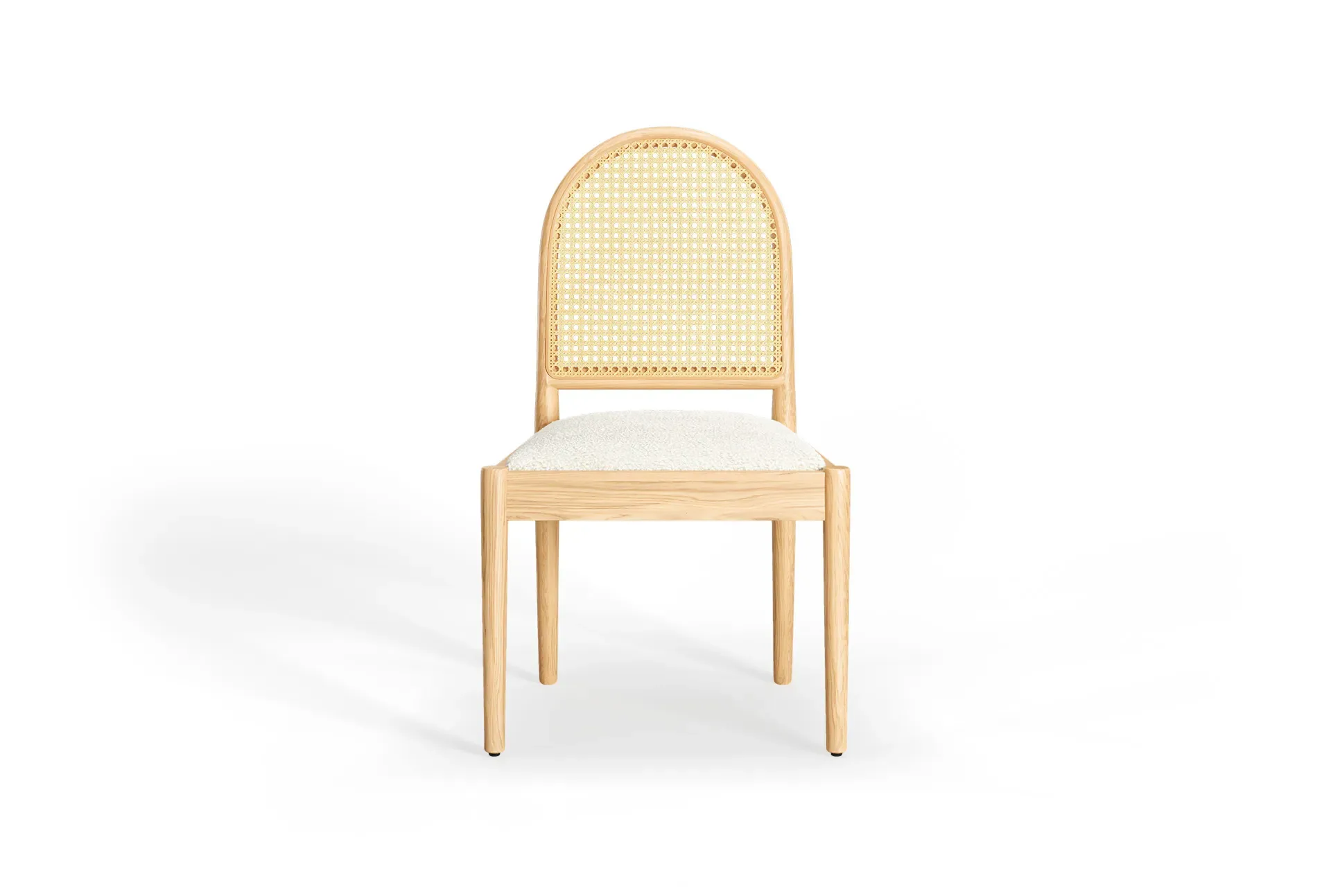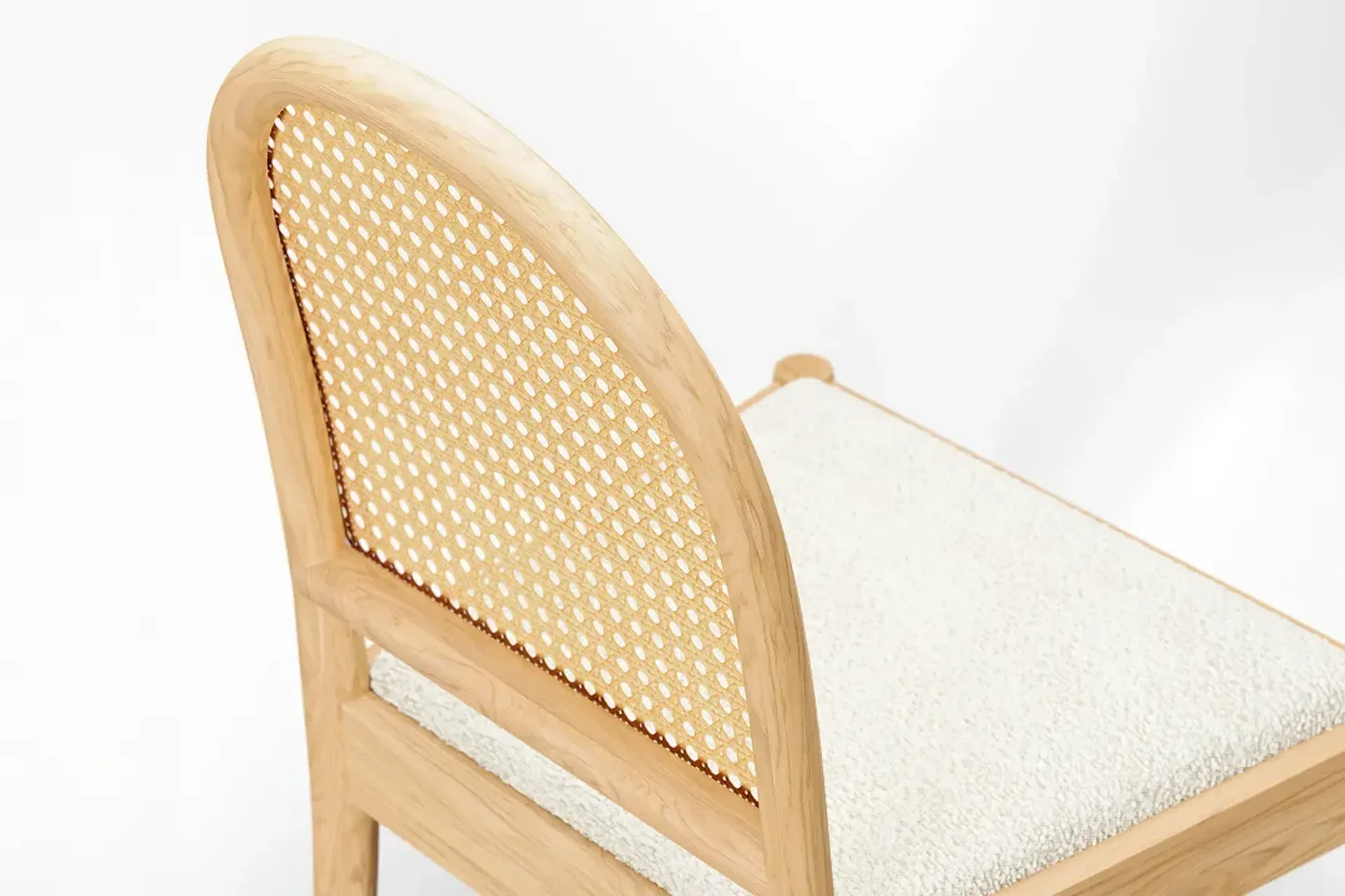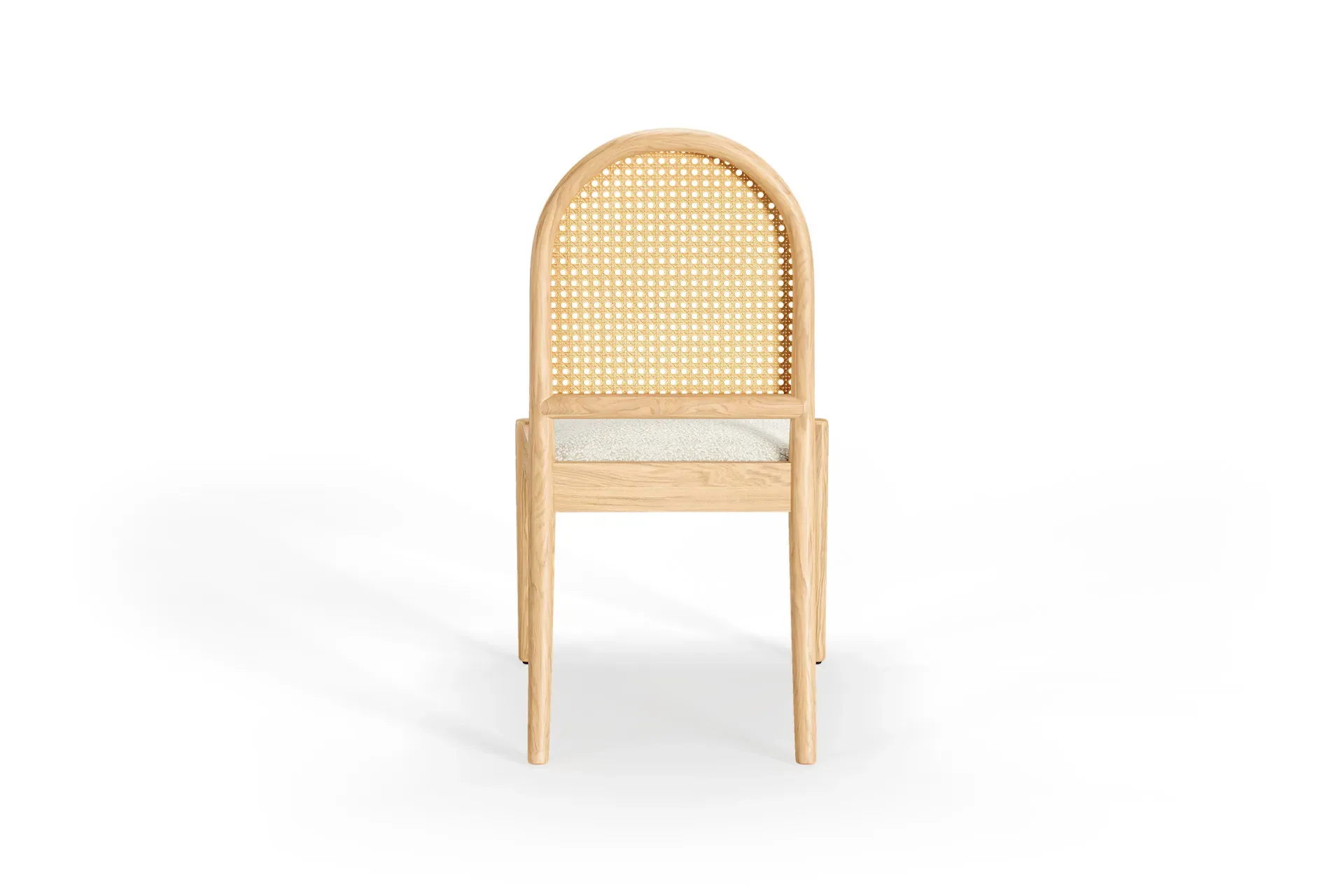 The Yuna Dining Chair in oak wood and white bouclé radiates calm, natural charm. Its curved lines and airy tones create a soft, inviting presence, while the rattan backrest and bouclé seat provide texture and comfort. Ideal for minimalist interiors, it blends Scandinavian simplicity with timeless warmth and elegance. -