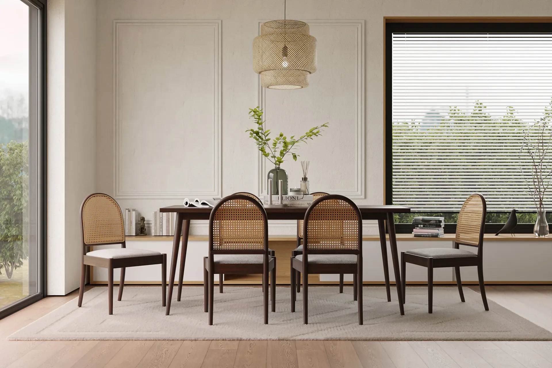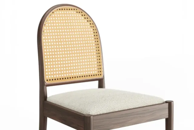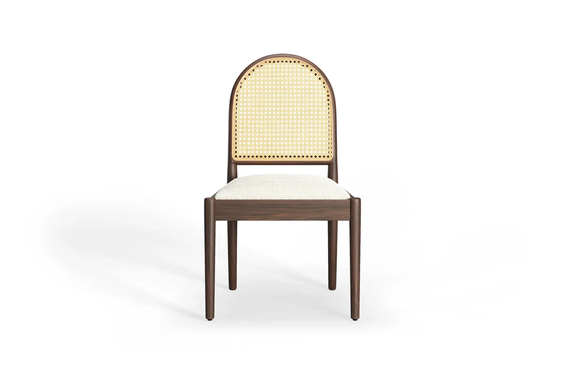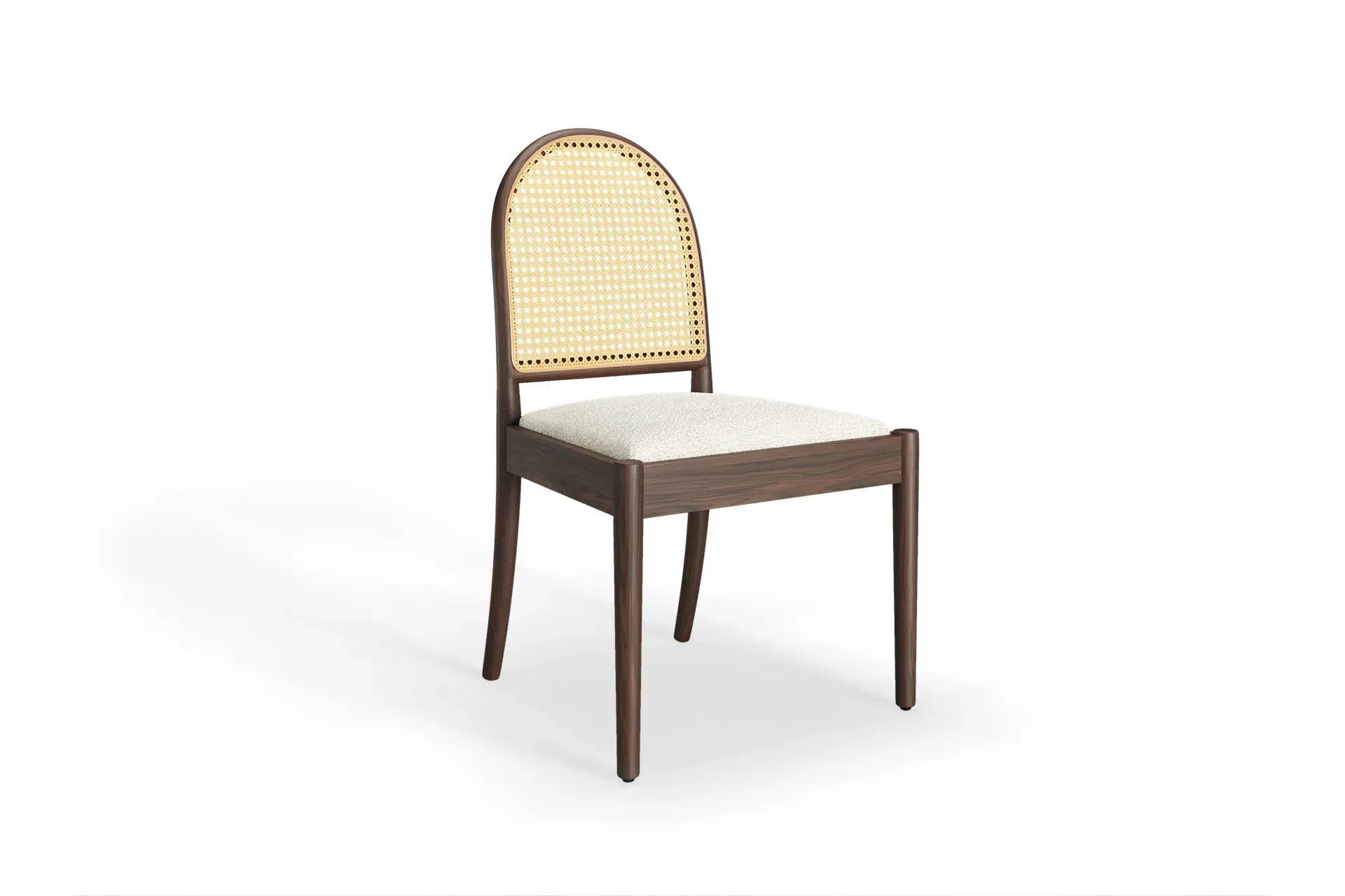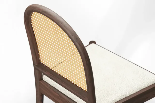 Walnut wood stands out for its rich color, strength, and timeless appeal. Paired with plush white bouclé, it offers tactile luxury and everyday comfort. The woven rattan complements both with its natural flexibility and breathability, adding texture and warmth that elevate longevity and sensory pleasure alike.