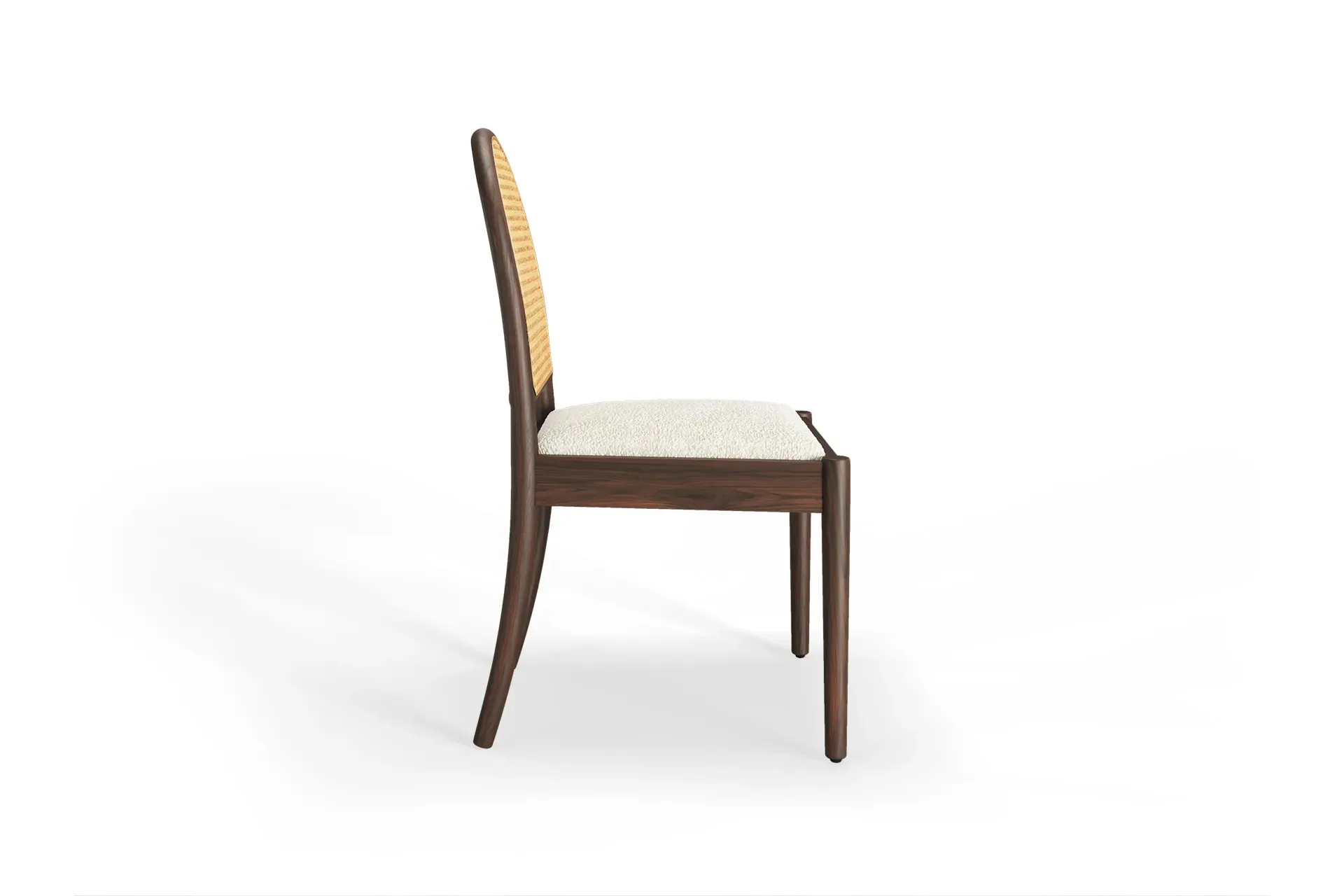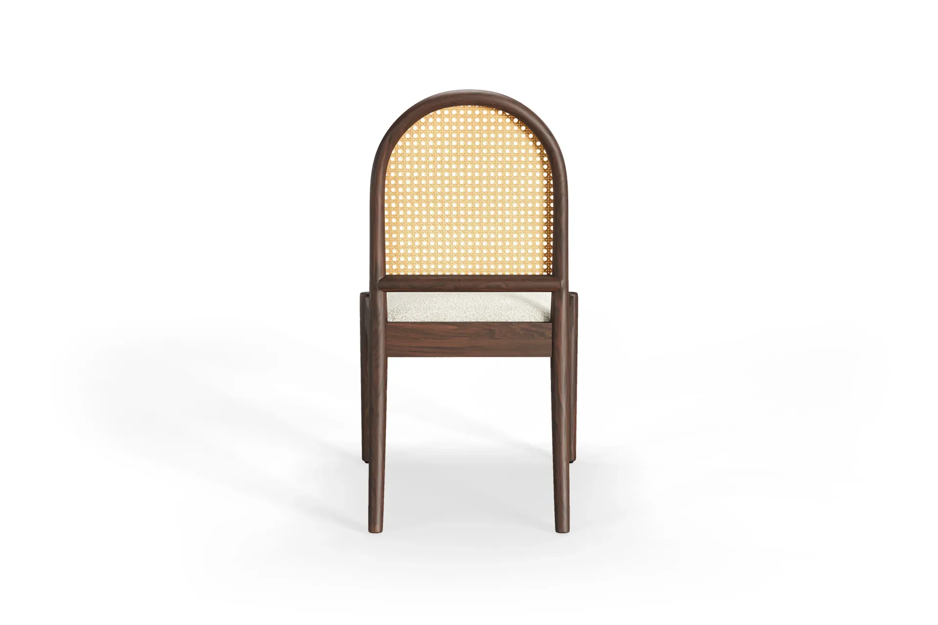 The warmth of walnut wood meets the softness of white bouclé in this Yuna Dining Chair. With its woven rattan backrest and refined silhouette, it brings comfort and character to every gathering.